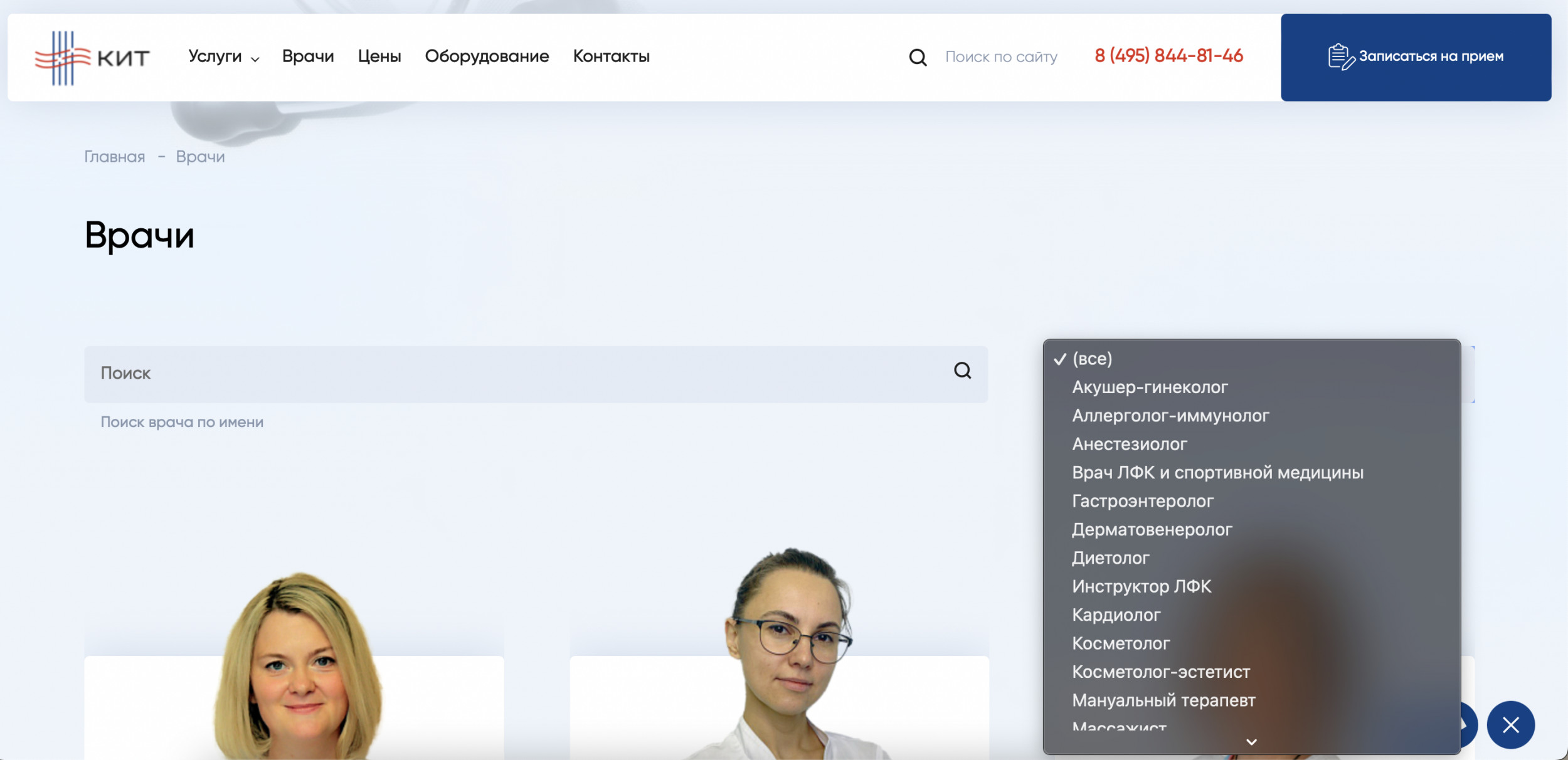 В клинике «КИТ» работают врачи различных специальностей: неврологи, травматологи, кардиологи, гинекологи, урологи, ЛОР, гастроэнтерологи, косметологи, физиотерапевты, реабилитологи и прочие специалисты.