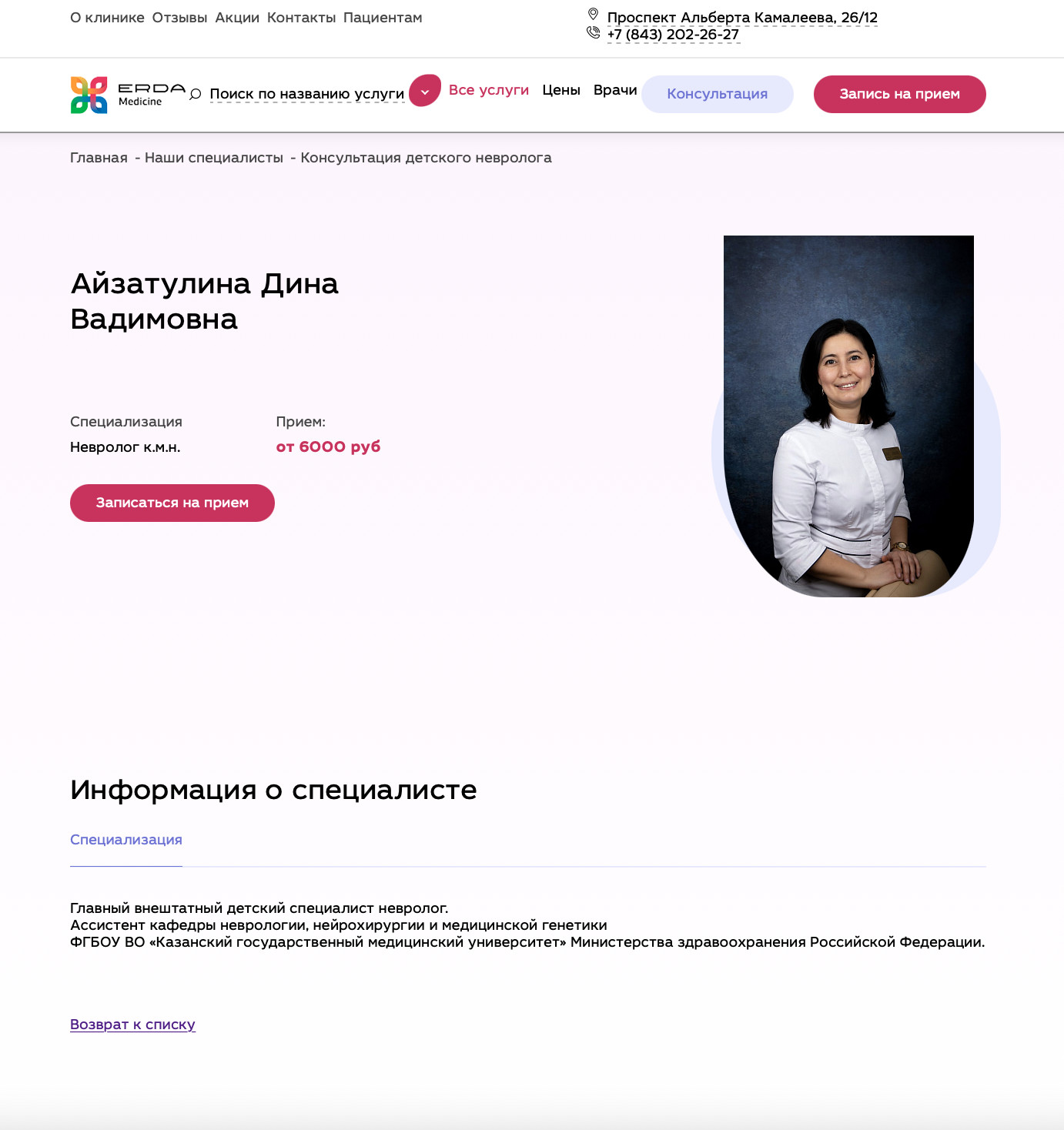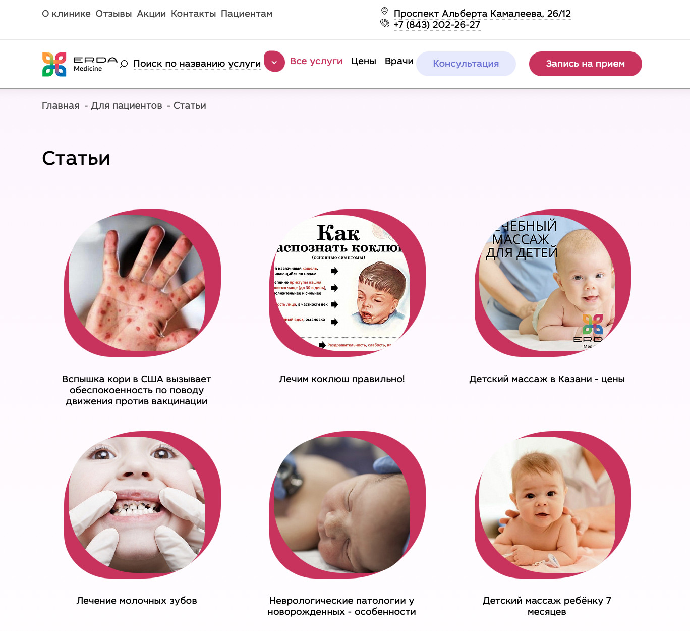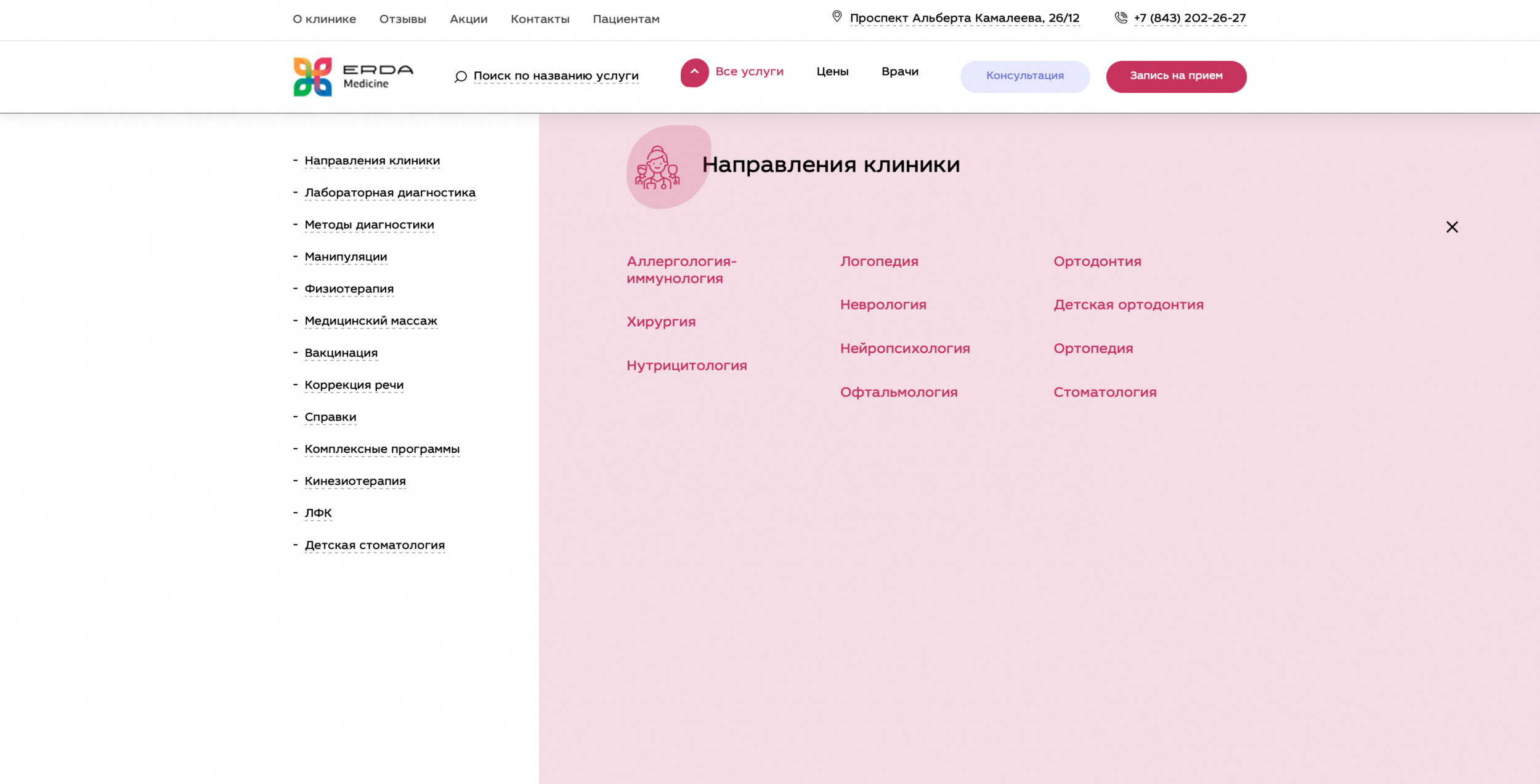 Клиент — детский многопрофильный медцентр Erda Medicine. Опытные специалисты центра осуществляют всестороннее наблюдение за развитием детей. Клиника имеет достаточную популярность в Казани, однако старый сайт не соответствовал требованиям современного дизайна. По этой причине клиент обратился к нам за разработкой нового интернет-портала.