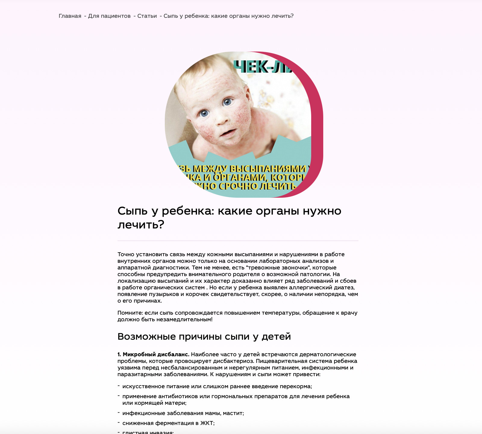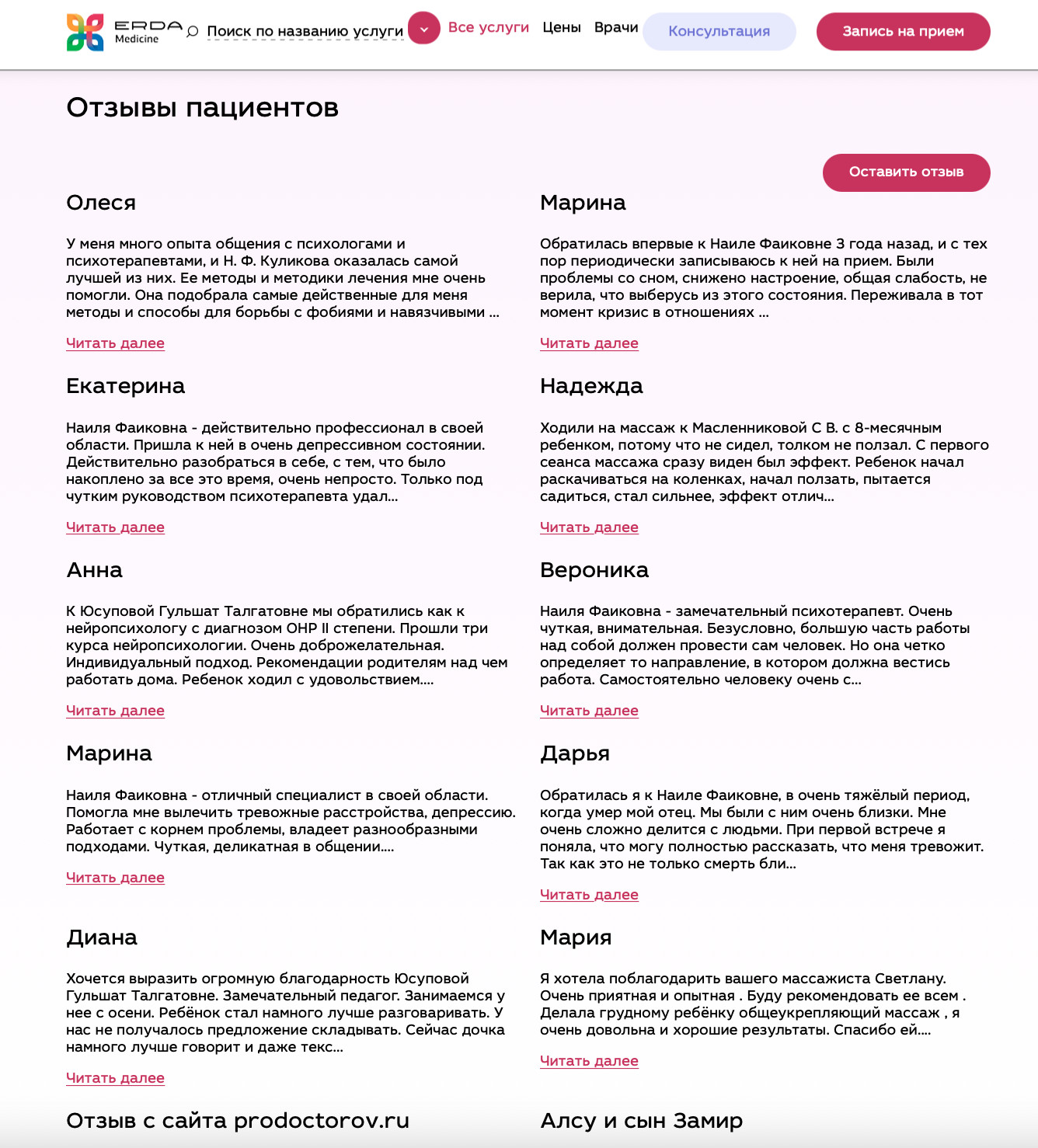 Решения о редизайне не принимаются просто так. Маркетологи клиники опирались на целый ряд показателей. Перед нами же стояла задача переработать портал, опираясь на карту путешествия клиента. Каждый родитель крайне внимательно подходит к выбору врача для ребенка. Чтобы выбрали именно вашу клинику, один только сайт должен отвечать целому ряду критериев. Усредненный портрет посетителя сайта: родитель, мужчина или женщина. Среди основных потребностей — регулярная диагностика ребенка, лечение у специалиста, направление к врачу. Если человек готов обратиться в частную клинику, то он точно ожидает высокого уровня профессионализма на всех этапах взаимодействия. Наша задача — продемонстрировать профессионализм уже на уровне сайта. Тут нужно выполнить 3 задачи: Основная цель — обеспечить оперативный доступ посетителя к нужному разделу. Достичь этой цели можно через логичную группировку страниц и блоков. Большинство медицинских бизнесов завязано на связке «врач—клиника—услуга». Мы выстраивали иерархию сайта в строгом соответствии с этим принципом. Основа сайта — это шапка, где представлены все основные разделы: Мы формируем структуру сайта на базе анализа ЦА. Собрали потребности, возражения и страхи, а на их основе подготовили логику повествования. Все возражения можно снять через демонстрацию процесса: описание этапов работы, отзывы, страницы-визитки врачей, понятные прайс-листы и видеоотчеты. Выбор услуги Итак, человек попадает на сайт. Большая ошибка — вывалить на пользователя всю информацию целиком и сразу. Как минимум — человек запутается, а еще хуже — испугается и закроет сайт. Основное внимание нужно уделить проработке хедера (шапке) сайта. Именно здесь человек добирается до нужного раздела. Чем проще и понятнее будет хедер, тем выше вероятность записи к нужному специалисту. Экран с услугами мы поделили на две части. Слева — список разделов, справа — их содержимое. В иерархическом порядке человек идет от общего к частному. Заметьте — в хедере нет ничего лишнего. Только строго упорядоченный список услуг. Ничто не отвлекает человека от достижения цели. Если же посетитель попадает на главную страницу и не пользуется хедером, то у него также есть возможность сразу выбрать нужную услугу. Порядок такой же: перечислены общие разделы, внутри — список услуг. Есть два пути к сделке — от услуги и от врача. Все зависит от уровня потребности человека. Какой-то части пользователей важнее квалификация специалиста. Надо дать им возможность изучить все варианты. Мы расположили перечень специалистов по алфавиту, чтобы посетитель быстрее добрался до нужного варианта. Когда направление выбрано — человек провалится на страницу выбора врача. Тут есть возможность оценить специалистов и выбрать подходящего. В каждой карточке есть фото врача и стоимость. Дополнительная информация будет представлена только на отдельной странице доктора. Карточку каждого специалиста мы оформили максимально подробно: где учился, какой опыт работы, список отзывов и доступные для записи даты. Чтобы записаться к выбранному специалисту, можно выбрать свободные часы в выпадающем списке. К моменту разработки сайта у клиента накопилось достаточное количество отзывов о каждом специалисте. Мы поместили все отзывы в карточку каждого врача. Отзывы — критич