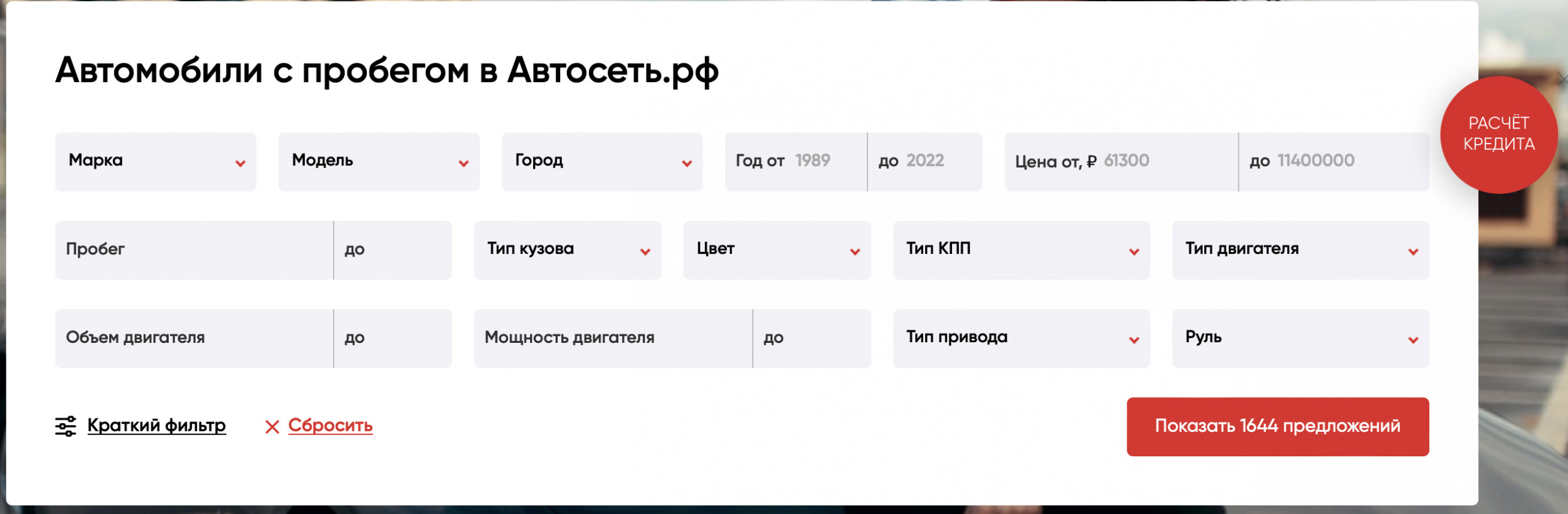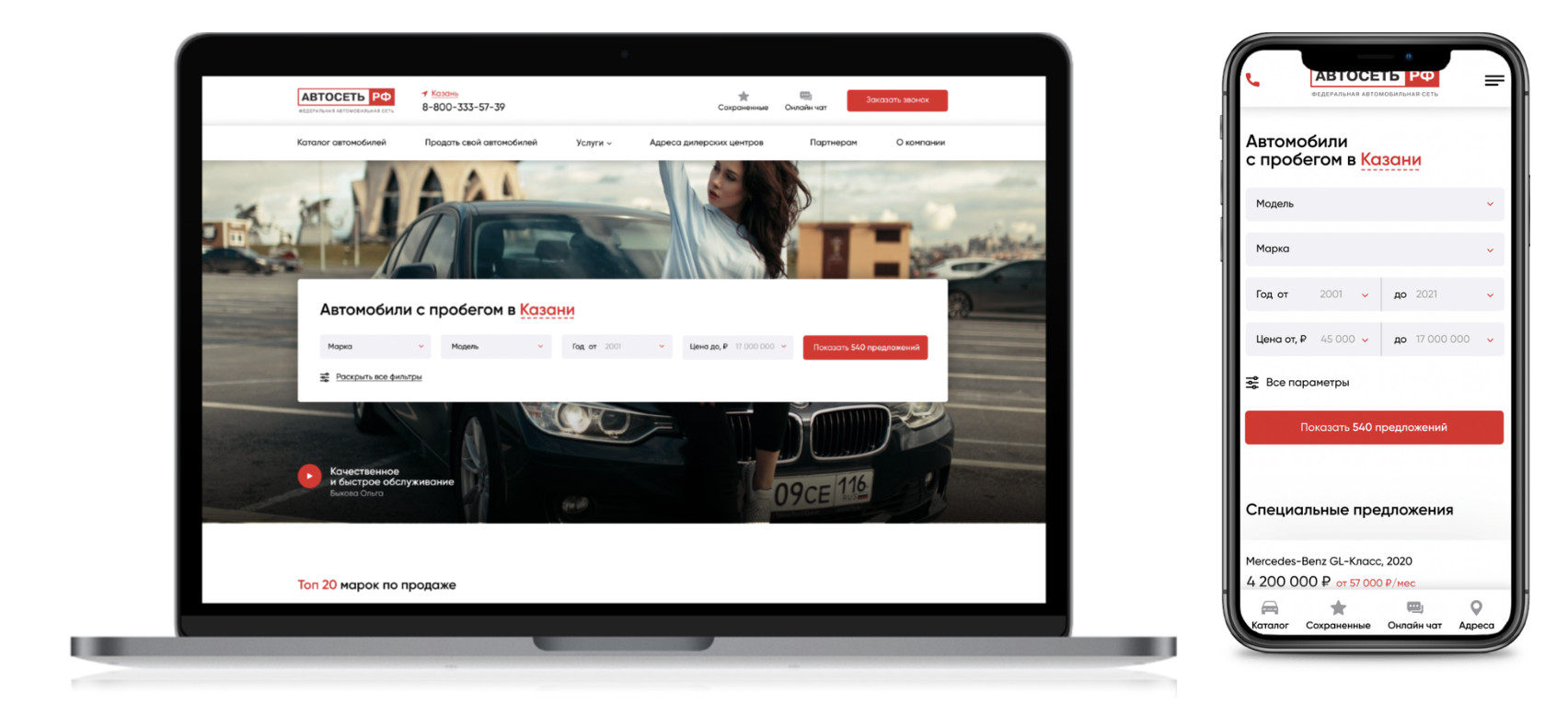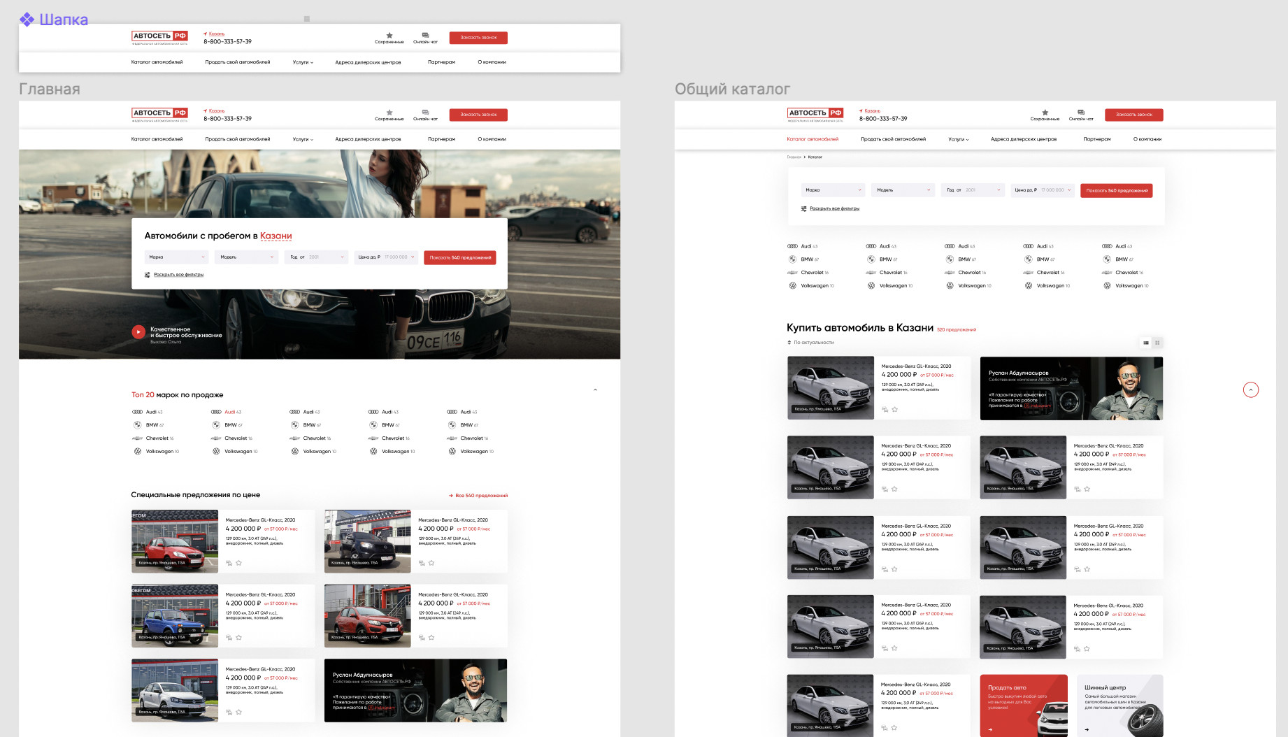 Автосеть.рф — наш давний клиент. Мы начали сотрудничество еще в 2015 году. Тогда же сделали сайт, который служил компании верой и правдой, пока не устарел морально и эстетически. К тому же, компания готовилась к активной продаже франшиз, а для этого требовался качественно новый портал. Если коротко: Затем, что с одной лишь красивой картинкой не добьешься успеха. Сайт — это не просто представительство в интернете, а главный инструмент по привлечению трафика. Чтобы он работал и приносил компании деньги, нужно позаботиться о его структуре и логике. Мы проводили исследование в три этапа: О важности каждого процесса расскажем по порядку. А если не хотите углубляться в детали — смело переходите к следующему блоку, где мы расскажем о построении логики сайта. Анализ рынка Нам не пришлось изобретать велосипед и открывать для себя очевидные вещи. В интернете полно исследований о рынке авто. Оставалось только собрать все данные, проверить их подлинность и подстроить под собственные нужды. Если вы эксперт в авторынке, смело пропускайте этот блок. А если нет, то вот основные моменты: Анализ целевой аудитории Мы подготовили несколько портретов пользователей, снабдив их социально-демографическими и поведенческими характеристиками. Сделали это не от избытка свободного времени, а для вполне конкретных целей: построить удобный и понятный сайт для каждого сегмента ЦА: богатого, среднего, молодого, пожилого и т.д. А чтобы закрепить анализ, изучили несколько крупных автопорталов и зафиксировали их особенности. Анализ потребностей ЦА Наверное, самый важный и сложный этап исследования. Чтобы не растягивать кейс на сто страниц, расскажем только самое интересное. Ранее сайт Автосети.рф включал несколько региональных поддоменов. Грубо говоря, человек из Ульяновска мог зайти и посмотреть предложения только для своего города. Но как показало исследование, человеку не важно, в каком городе находится авто. Если предложение его устраивает — он ринется за новой «ласточкой» даже за сотни километров. Поэтому мы отказались от поддоменов, а сосредоточились на создании фильтра. Фильтр — еще один важный инструмент, который стоит поместить на первый же экран, в самое видное место. Если человек пришел выбирать автомобиль, надо дать ему это возможность без лишних усложнений. Все поля в фильтре не должны быть обязательными. Если человек не хочет выбирать город или модель — значит ему так проще. А чем проще процесс выбора, тем выше вероятность целевого действия. Исследования показали, что большую часть трафика занимают мобильные пользователи. Старый сайт не отвечал все требованиям адаптивности, а потому мы обратились к принципу Mobile First. Это способ первоначальной или параллельной разработки сайта для смартфонов и планшетов. Благодаря этому принципу, вопрос адаптивности будет не «остаточным», а приоритетным. Выбор концепции По завершении исследования мы начали подбор цветов и шрифта для сайта. Остановились на трех базовых оттенках, которые помогут создать ассоциацию с логотипом и брендом «Автосети», а также удержат внимание пользователей. Нам важно было соблюсти баланс между индивидуальностью и схожестью со множеством остальных агрегаторов. Проще говоря, сделать слишком оригинальный концепт — затея рисковая, поскольку пользователи просто привыкли к опред