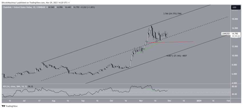 Цена LINK упала после того, как 11 ноября достигла максимума на $16,58 по данным биржи СoinW. Снижение привело к минимуму в $12,86 шесть дней спустя. С тех пор цена выросла, и это движение поддерживается индексом относительной силы (RSI). Индикатор отскочил от уровня 50 и сформировал скрытую бычью дивергенцию, которая считается признаком продолжения восходящего тренда.