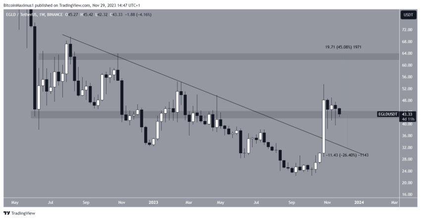 Sirius 1.6, в котором реализованы оптимизированная проверка подписей консенсуса, расширенное голосование и поддержка нескольких ключей для цепочек шардов. В октябре цена EGLD оттолкнулась от долгосрочной нисходящей линии сопротивления, достигнув максимума в $53,45. Хотя после этого она откатилась, актив все еще торгуется внутри горизонтальной зоны поддержки