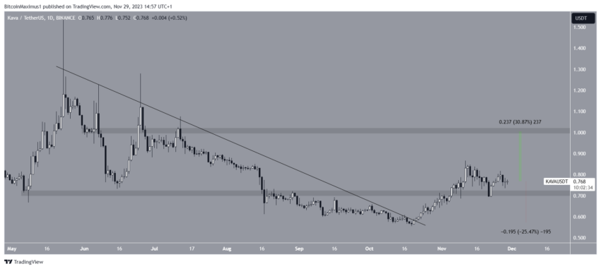 $43. Если цена возобновит восходящее движение, курс MultiversX может вырасти на 45% и достичь следующего уровня сопротивления на отметке $63. С другой стороны, закрытие ниже $43 может привести к падению на 25% и ретесту долгосрочной нисходящей линии сопротивления. KAVA закрывает наш список альткоинов, за которыми стоит следить в декабре. 29 ноября команда проекта провела AMA, чтобы обсудить новые разработки, которые будут реализованы уже в ближайшее время. Цена KAVA стремительно растет с момента прорыва выше нисходящей линии