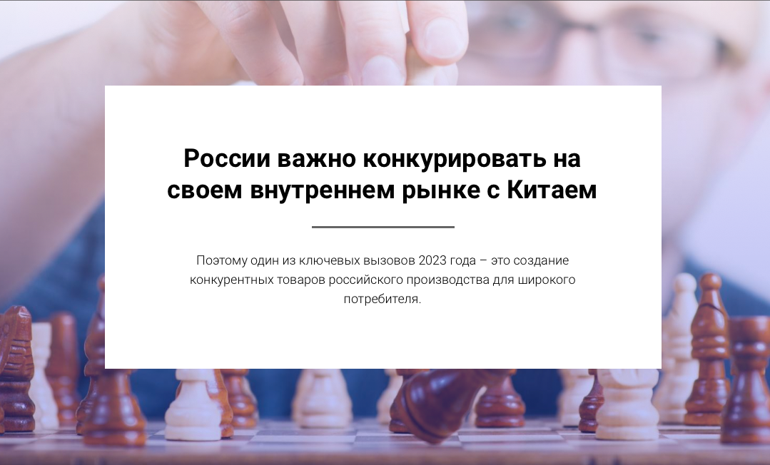 Поэтому один из ключевых вызовов 2023 года — это создание конкурентных товаров российского производства для широкого потребителя.