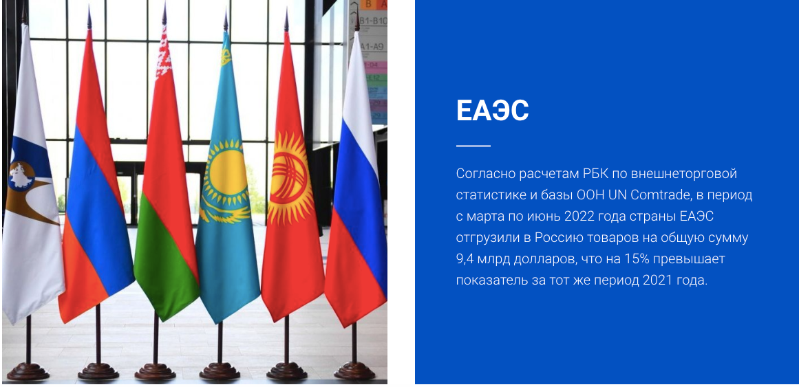 С весны 2022 года в отношении России Беларусь стала вторым крупнейшим поставщиком товаров после Китая, в июне 2022 года белорусский экспорт в РФ превысил 2 млрд долларов, что в полтора раза превышает показатель июня прошлого года. Экспорт Киргизии в России в июне 2022 в 4,7 раза больше, чем в июне 2021. Экспорт Казахстана в Россию в июле 2022 вырос на 13,9% по сравнению с показателями июля 2021.Как известно, страны ЕАЭС на постоянной основе осуществляют анализ текущих тенденций развития рынков, в том числе связанных с цифровизацией, внедрением искусственного интеллекта и развитием электронной торговли. В рамках этой тенденции в августе этого года был подготовлен пакет поправок в Таможенный кодекс ЕАЭС, касающихся торговли через зарубежные площадки для сферы B2C, упрощающий таможенные формальности для товаров электронной торговли. Речь идёт о вводе нового института в сфере таможенного дела — оператора электронной торговли, выполняющего таможенные формальности за физических лиц. На складах оператора также можно будет заблаговременно размещать товары, что поспособствует ускорению доставки.Если говорить о перспективных направлениях работы, стоит упомянуть взаимодействие стран ЕАЭС в сфере взаимных расчетов и интеграции платежных систем на основе использования национальных валют для трансграничных платежей, финансирования торговли и инвестиций — об этом заявляет председатель коллегии Евразийской экономической комиссии Михаил Мясникович. Второе направление связано с задачей развития транспортной связанности евразийского региона. На заседании Евразийского межправительственного совета, прошедшего 25–26 августа в Чолпон-Ате в Киргизии, был одобрен перечень приоритетных инфраструктурных транспортных проектов в странах ЕАЭС, направленных на создание новых логистических цепочек.