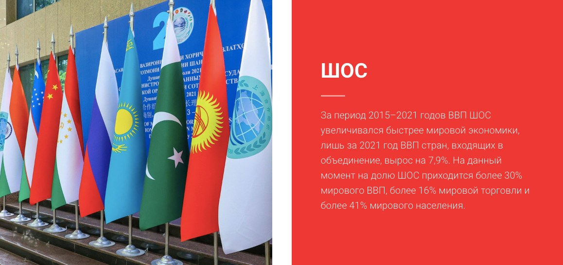 Страны, участвующие в БРИКС, составляют около 40% населения мира, их совокупный ВВП в 2021 году составил 23,5 трлн долларов, что значительно превышает показатели ЕС (17,9 трлн долларов) и составляет около четверти мирового ВВП, не говоря про 20% мировой торговли и 25% прямых инвестиций. Эти цифры вполне могут вырасти в ближайшее время, в том числе и в результате вероятного увеличения членов объединения.27 июня 2022 года Аргентина и Иран подали заявки на вступление в БРИКС, в июле же резидент международного форума стран БРИКС Пурниму Ананд заявил о наличии подобного стремления у Турции, Египта, а также Саудовской Аравии. Среди других потенциальных участников БРИКС часто называются Уругвай, Иран, Гвинея, Таиланд, а также ряд государств постсоветского пространства. Также, внутри объединения говорят о необходимости расширять взаимодействие с внешними игроками, называя такие форматы БРИКС+ или БРИКС-outreach.Этим летом прошел XIV саммите БРИКС, на котором премьер-министр Индии Моди заявил о том, что «БРИКС сыграет ключевую роль в восстановлении мировой экономики после пандемии». В рамках этого же саммита выступил Владимир Путин, заявивший в своём выступлении о том, что внешнеторговый оборот России с партнёрами по БРИКС показывает ощутимый рост: показатели I квартале 2022 года на 38% больше по сравнению с I кварталом 2021 года.В рамках саммита были обсуждены различные темы, среди которых можно выделить такие направления работы объединения как разработка надёжных альтернативных механизмов международных расчётов, перестройку логистических маршрутов и создание новых производственных цепочек, завершение пятого тестового запуска пула условных валютных резервов в конце 2022 года, а также разработку проектов класса мегасайенс. В рамках последней темы в августе состоялась встреча рабочей группы БРИКС в рамках проходящего в Новосибирске форума «Технопром-2022». о итогам первых восьми месяцев 2022 года объем импорта и экспорта одного лишь Китая с другими государствами-членами ШОС вырос на 26% в годовом выражении и составил 246,45 млрд долларов, объем торговли же вырос на 28,9% по сравнению с прошлогодними данными.В 2022 году в ШОС председательствует Узбекистан, и 15–16 сентября этого года в Самарканде прошёл саммит организации, в рамках которого было подписано около 40 документов.Подводя итоги, необходимо в первую очередь отметить расширение организации: к двум десяткам стран ШОС готовы примкнуть ещё пять (Египет, Катар, Саудовская Аравия, Бахрейн, Мальдивские острова), Иран уже подписал меморандум о вступлении, а эксперты предрекают и дальнейшее расширение ШОС за счёт стран Африки и Юго-Восточной Азии.Продолжается взаимовыгодное сотрудничество ШОС и ЕАЭС в вопросах интеграции новых платежных систем и развития транспортной связанности евразийского региона. По 2021 года товарооборот между ЕАЭС и странами ШОС (не входящими в ЕАЭС) вырос на 31,9% относительно 2020 — до $198,6 млрд, а за первые полгода объём взаимной торговли увеличился ещё на треть.Владимир Путин в рамках саммита провёл серию двусторонних встреч с президентами государств, в частности, с главами Турции, Индии, Ирана, Азербайджана, Киргизии. Были подняты темы зерновой сделки с Турцией, работы газопровода «Турецкий поток», строительства АЭС «Аккую», строительство газопровода «Сила Сибири — 2» в сотрудничестве с 