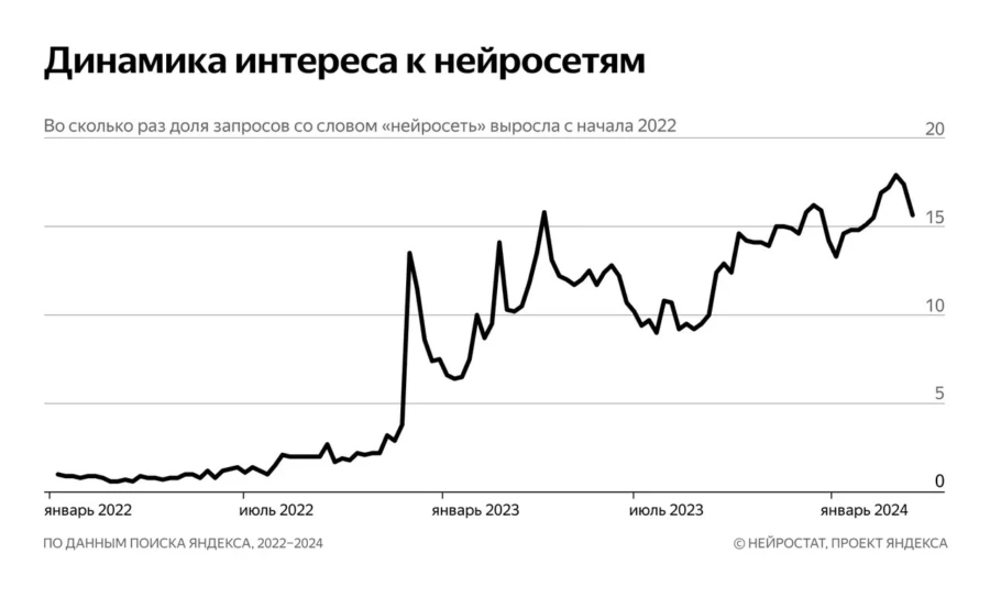 По данным поиска Яндекса, с начала 2022 г. интерес к ИИ вырос более чем в 15 раз — это видно по динамике количества запросов со словом «нейросеть» (см. график).