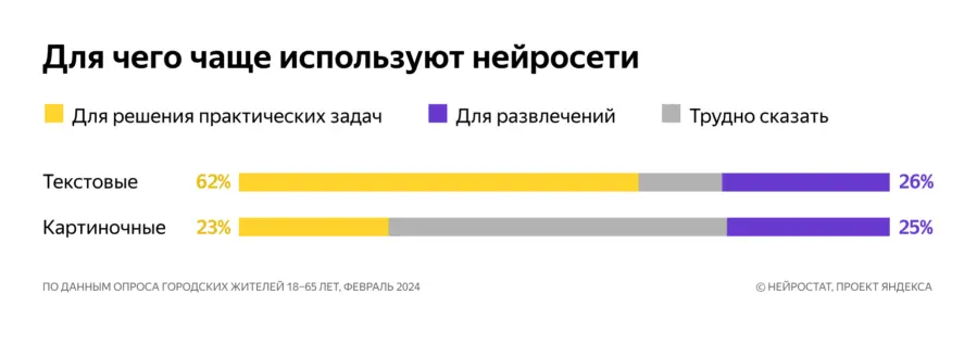 Также Яндекс поделился данными о том, что молодое поколение преимущественно использует нейросети для работы или учебы — создания презентаций и логотипов, написания курсовых. Это подтверждает и исследование Skillfactory, согласно которому 50% студентов российских вузов прибегают к нейросетям в учебных целях. При этом старшее поколение обращается к помощи нейросетей чаще за развлечением, например, для обработки фотографий, создания музыки, написания стихов. В целом текстовые нейросети гораздо чаще используют для реализации практических задач, чем картиночные (см. диаграмму). Superjob выявил, что у россиян за год стало меньше страхов по поводу искусственного интеллекта. 50% опрошенных (против 43% год назад) уже не боятся развития ИИ. Опасения и страхи остались у каждого девятого — наиболее распространенные: