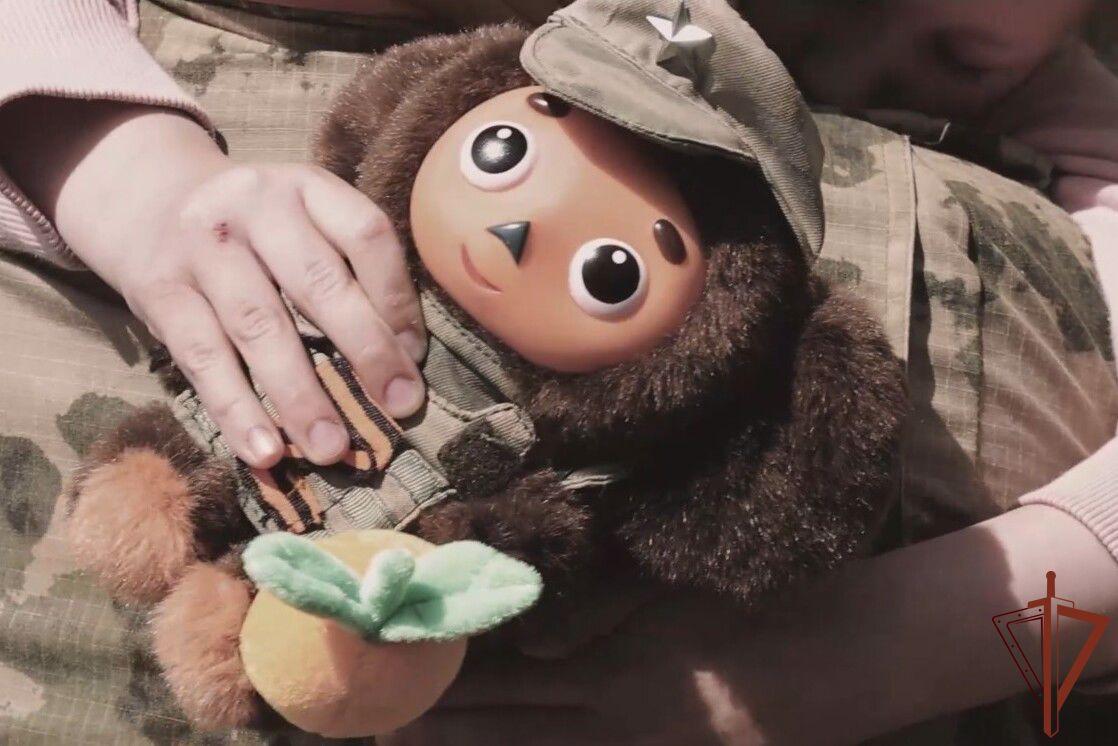 Ролик начинается со сцены прощания росгвардейца с женой и дочкой, которая незаметно положила своего любимого Чебурашку в походный рюкзак папы.