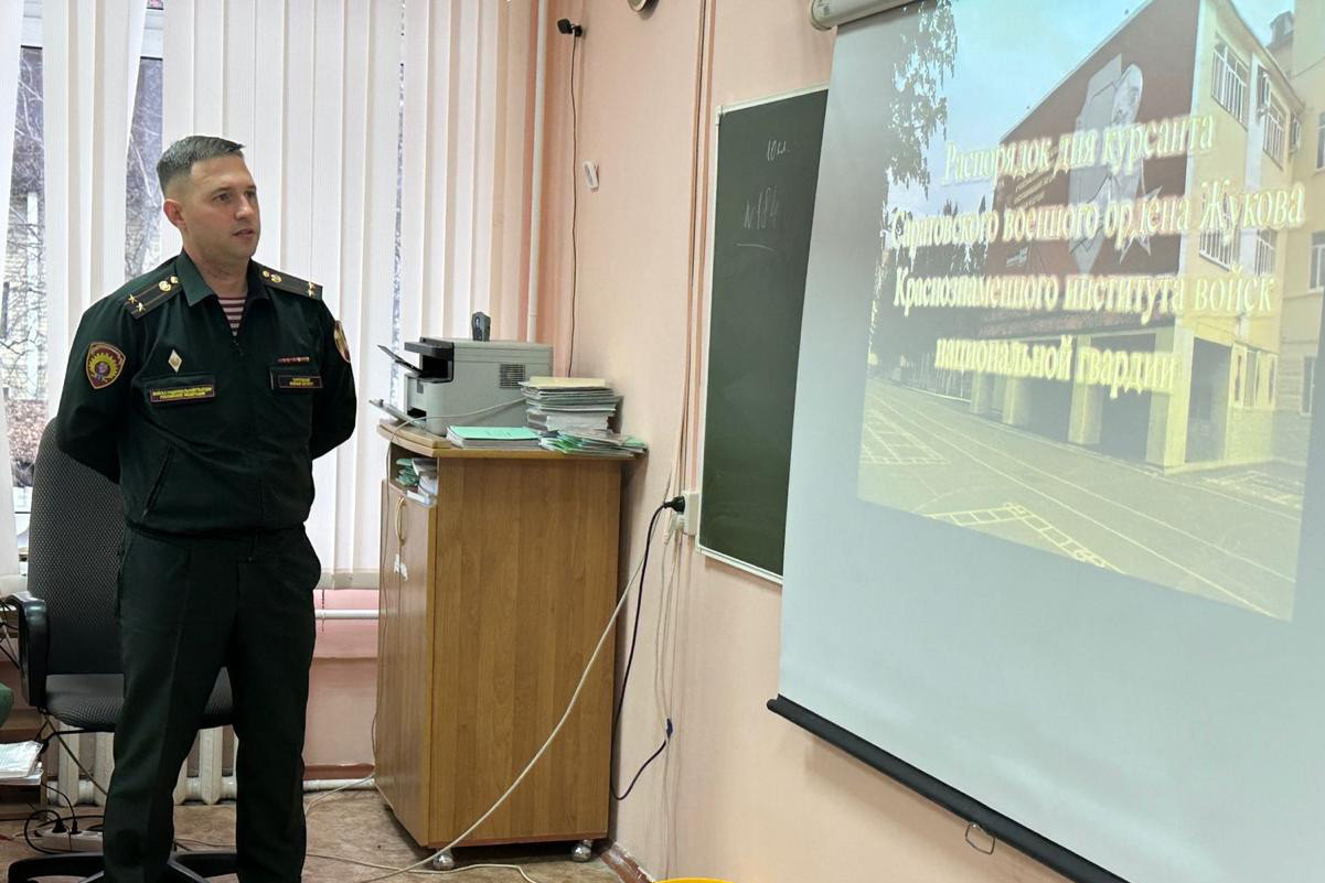 Офицер Саратовского Краснознаменного ордена Жукова института войск национальной гвардии Российской Федерации посетил столицу республики, где встретился с учащимися профильного класса Росгвардии лицея № 96.