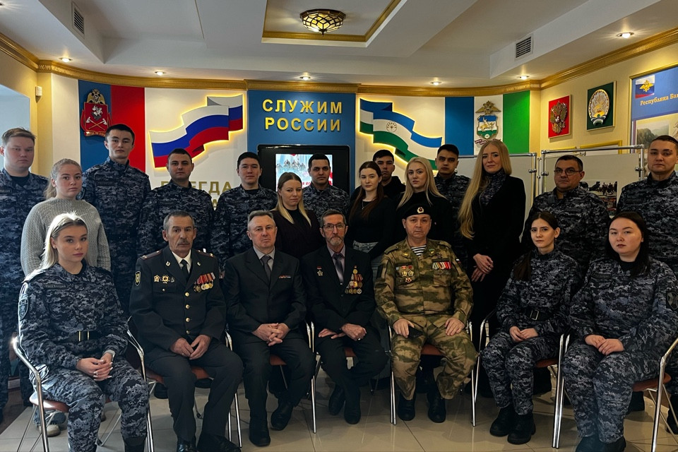 В музее истории Росгвардии и МВД по Республике Башкортостан состоялось памятное мероприятие, посвященное годовщине вывода советских войск из Афганистана. Встреча была организована Региональным отделением Общероссийской общественной организации ветеранов войск правопорядка.Почетными гостями стали ветераны Росгвардии — воины-интернационалисты: старший лейтенант милиции в отставке Ф.А. Гарипов, капитан милиции в отставке С.В. Шандура и старший прапорщик милиции в отставке А.Р. Зарипов.Председатель Совета ветеранов, подполковник милиции в отставке, довел до личного состава вневедомственной охраны города Уфы исторические факты: причины ввода ограниченного контингента советских войск в ДРА, этапы ведения боевых действий и итоги десятилетней кампании. Сами ветераны-«афганцы» поделились со стражами правопорядка личными воспоминаниями о службе в экстремальных условиях, мужестве и боевом товариществе.Для участников встречи был организован показ документального фильма Росгвардии "Еще раз про войну в Афганистане«.Врио начальника УВО «ФГКУ ВНГ УВО по Республике Башкортостан» полковник полиции Вадим Шакиров обратился к молодым сотрудникам с приветственным словом. Он напомнил об истории создания войск правопорядка и традициях службы, подчеркнув почетность и важность миссии, возложенной на сотрудников Росгвардии. Вадим Фанильевич отметил знаменательные даты: в текущем году исполняется 10 лет со дня образования Федеральной службы войск национальной гвардии Российской Федерации и 215 лет войскам правопорядка.За активную работу по военно-патриотическому воспитанию личного состава и гражданской молодежи ветеранам-интернационалистам была объявлена благодарность от имени Регионального отделения. В память о встрече гостям вручены памятные сувениры.