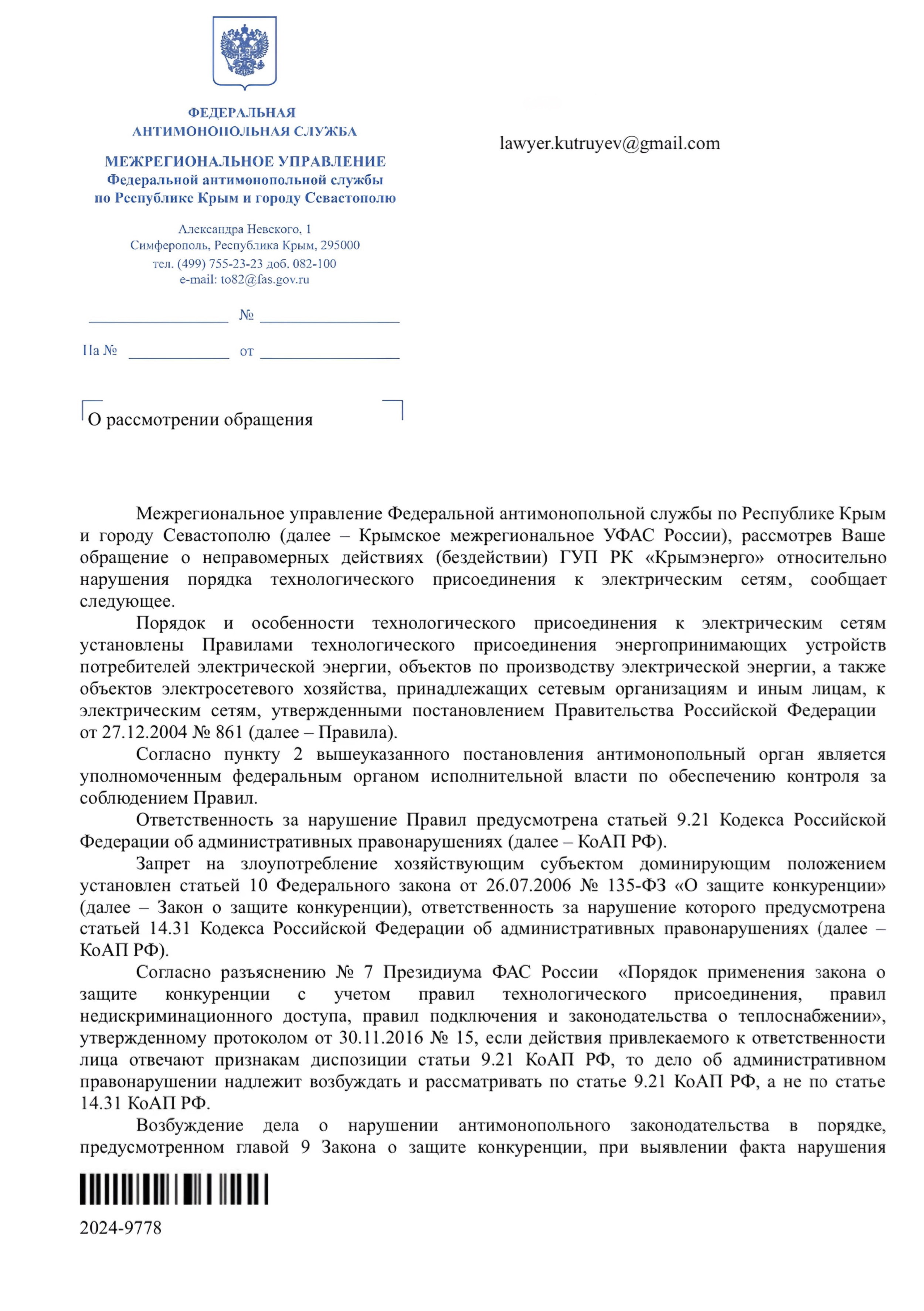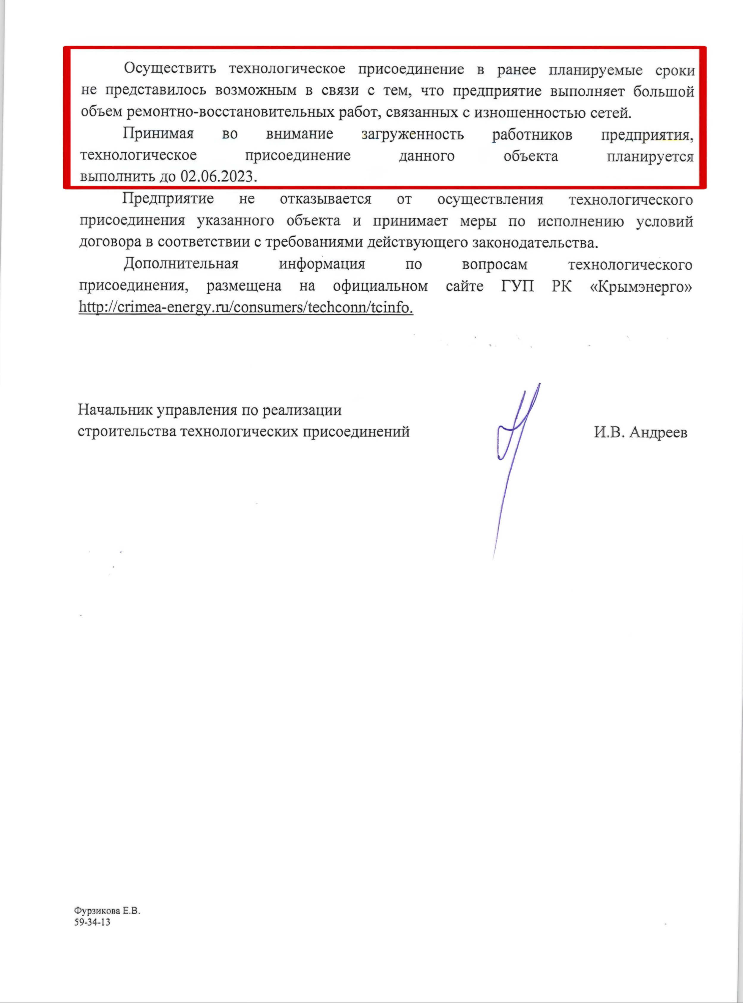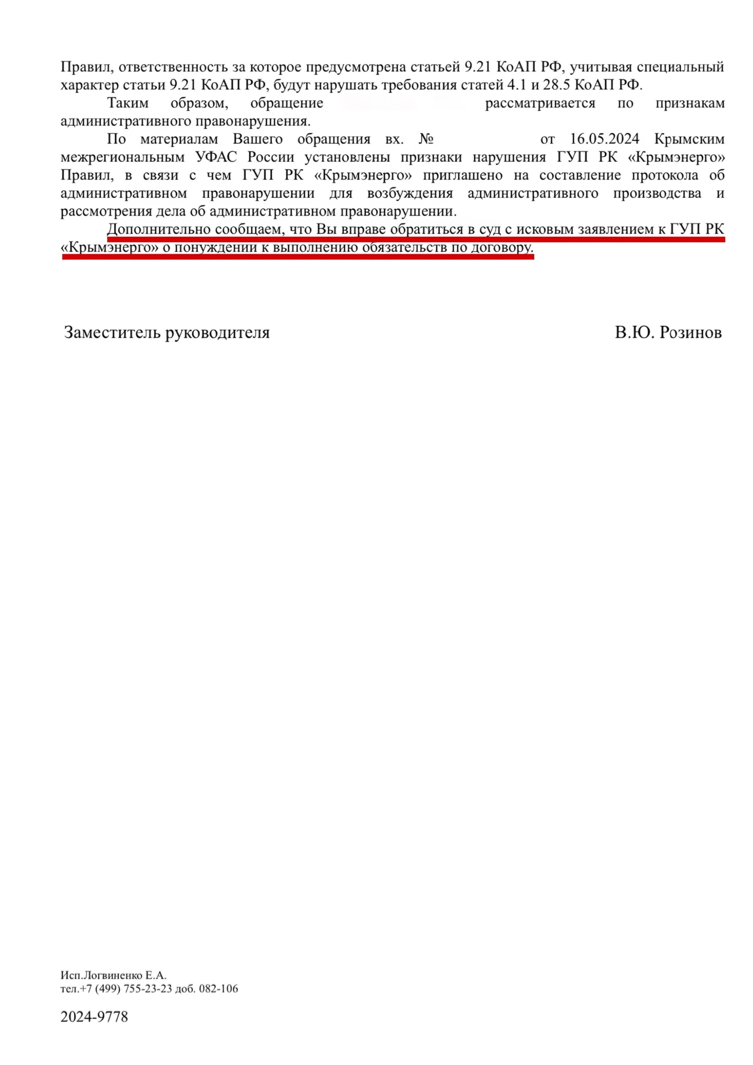 С новым директором Вячеславом Гайдуком, назначенным в 2023 году, ситуация начала понемного улучшаться, но из-за финансовых проблем реализация всех просроченных подключений может занять годы. По словам Главы РК Сергея Асенова, на сентябрь 2023 года более 15 000 заявок были просрочены. 1.Жалоба в Крымэнерго Самый простой, хотя и часто бесполезный способ — подача жалобы на имя генерального директора Крымэнерго. В большинстве случаев ваша жалоба будет перенаправлена начальнику вашего РЭСа, и вы получите один из стандартных ответов с обещаниями выполнения условий договора в будущем. Примеры стандартных ответов: — «Предприятие не отказывается от осуществления технологического присоединения и принимает меры по исполнению условий договора.» — «На сроки реализации мероприятий по технологическому присоединению влияет их физический и моральный износ, что отражено в Отчете...» — «Подключение вашего объекта входит в зону комплексной застройки с привлечением подрядной организации. Учитывая сроки проведения закупочных процедур, строительство будет завершено позже.» Самый обнадеживающий ответ — «Технологическое присоединение планируется выполнить в срок до дд.мм.гггг». Но срок, указанный в ответе, проходит, а электричества так и нет. На ваш вопрос: «Как же так, вы же обещали???», ГУП дает такой ответ: «Осуществить технологическое присоединение в ранее планируемые сроки не удалось из-за большого объема ремонтных работ, связанных с изношенностью сетей. Принимая во внимание загруженность работников предприятия, планируется выполнить подключение до дд.мм.гггг.» Так может продолжаться до бесконечности. У нас было много клиентов, которым Крымэнерго постоянно переносили сроки более 5 лет, а в итоге подключили только после подачи иска. Продолжайте следить за новостями, подписывайтесь на мой канал в телеграмме и в Дзене и обращайтесь за консультацией по номеру телефона 2. Жалоба в Министерство топлива и энергетики Республики Крым Министерство топлива и энергетики тоже не ускоряет подключение. Ответ обычно такой: «По информации ГУП „Крымэнерго“, подключение запланировано на дд.мм.гггг». Еще одна стандартная отписка. 3. Жалоба в Федеральную антимонопольную службу ГУП РК «Крымэнерго» — монополист, и можно жаловаться в Федеральную антимонопольную службу. Нарушение сроков выполнения технологического присоединения образует состав административного правонарушения по ст. 9.21 КоАП РФ. Это влечет штраф до 600 000 руб. В жалобе нужно указать: «Прошу привлечь ГУП РК „Крымэнерго“ к административной ответственности по ст. 9.21. КоАП РФ». Однако привлечение Крымэнерго к административной ответственности реально имеет влияние на подключение, т.к. штраф предусмотрен за нарушение сроков и неважно на 1 день или на 1,5 года. Если ФАС оштрафовал Крымэнерго, но они все равно не подключают, то повторно привлечь ГУП к ответственности НЕЛЬЗЯ. В ответе ФАС может обычно даже пишет: «Вы вправе обратиться в суд с исковым заявлением к ГУП РК «Крымэнерго». То есть намекает, что если вам нужно подключение — идите с иском в суд. По нашему опыту, судебное решение — единственный законный способ добиться подключения. Досудебный порядок по этой категории дел не предусмотрен.По нашей практике, если писать претензию, то в ответ можно получить только обещания, а значит можно и нужн