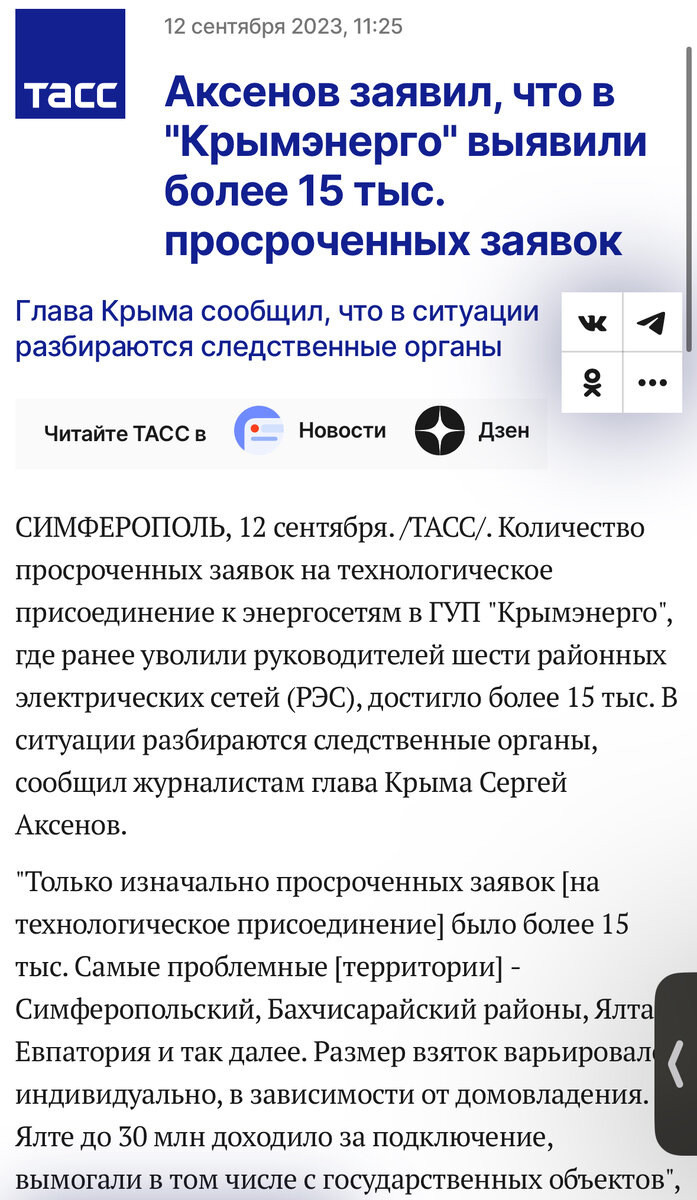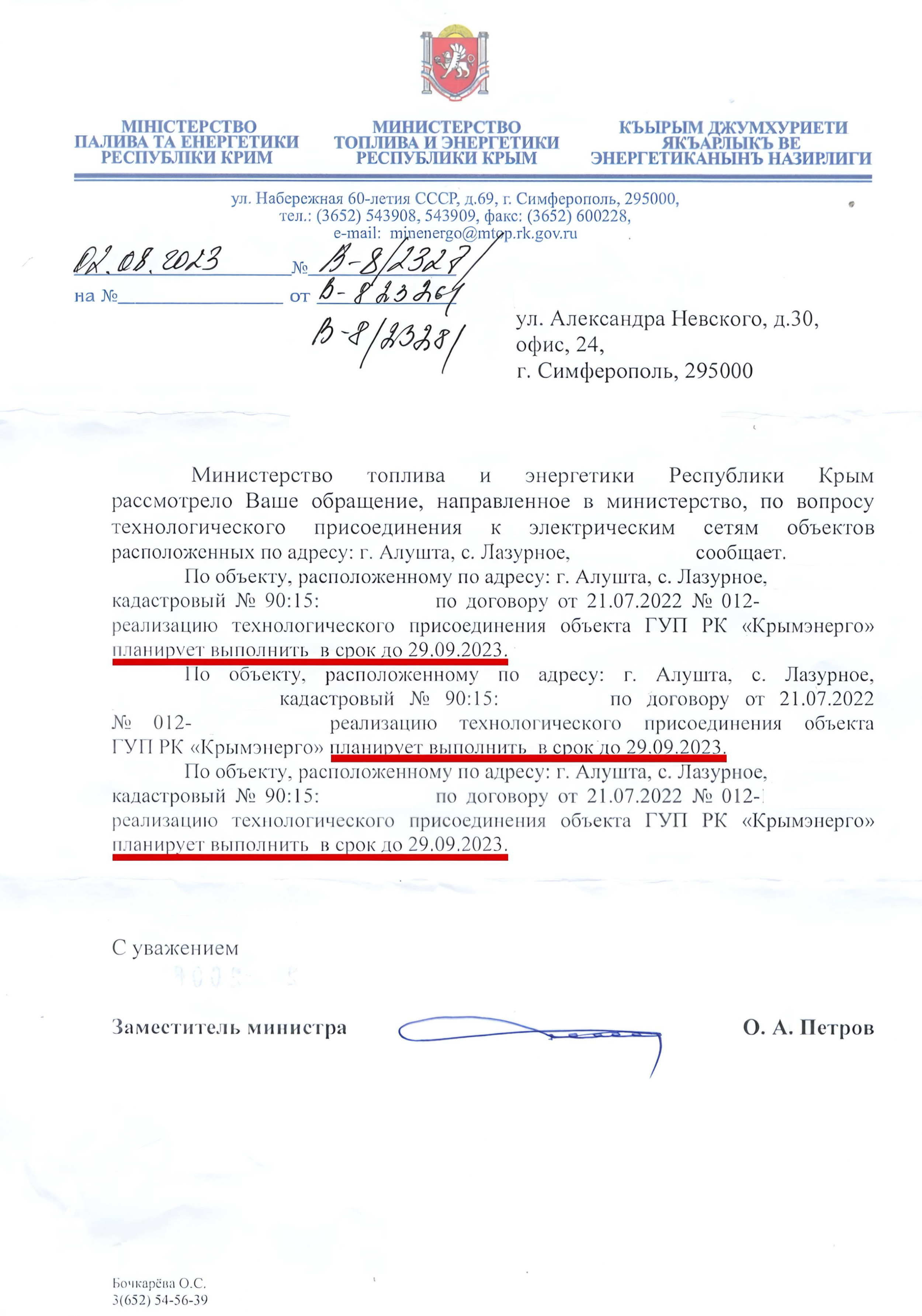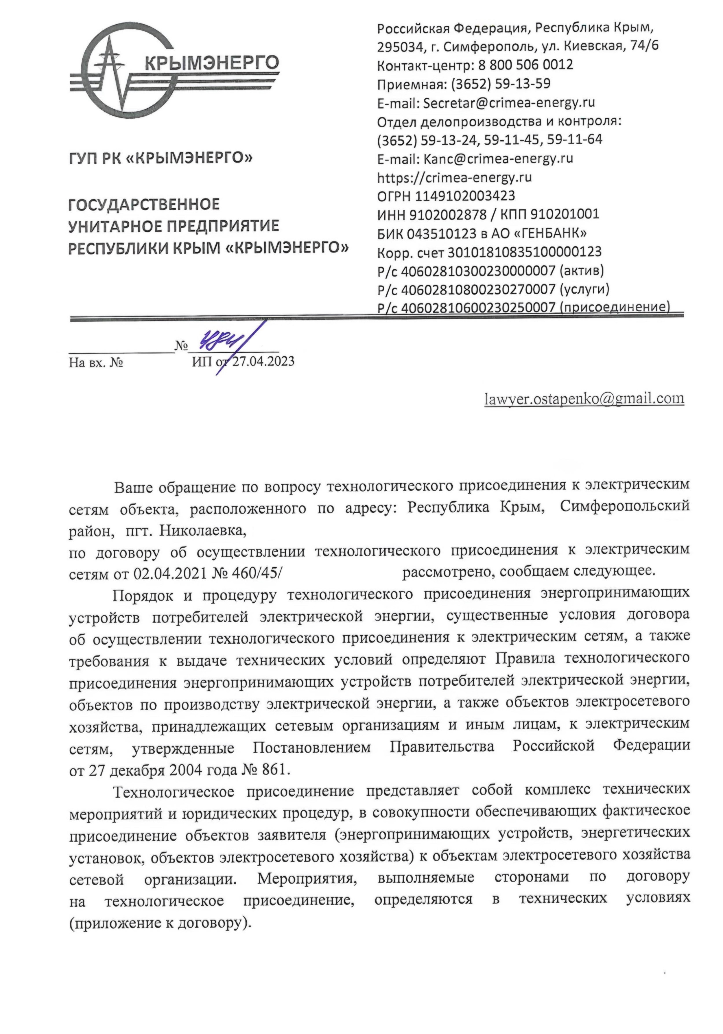 С новым директором Вячеславом Гайдуком, назначенным в 2023 году, ситуация начала понемного улучшаться, но из-за финансовых проблем реализация всех просроченных подключений может занять годы. По словам Главы РК Сергея Асенова, на сентябрь 2023 года более 15 000 заявок были просрочены. 1.Жалоба в Крымэнерго Самый простой, хотя и часто бесполезный способ — подача жалобы на имя генерального директора Крымэнерго. В большинстве случаев ваша жалоба будет перенаправлена начальнику вашего РЭСа, и вы получите один из стандартных ответов с обещаниями выполнения условий договора в будущем. Примеры стандартных ответов: — «Предприятие не отказывается от осуществления технологического присоединения и принимает меры по исполнению условий договора.» — «На сроки реализации мероприятий по технологическому присоединению влияет их физический и моральный износ, что отражено в Отчете...» — «Подключение вашего объекта входит в зону комплексной застройки с привлечением подрядной организации. Учитывая сроки проведения закупочных процедур, строительство будет завершено позже.» Самый обнадеживающий ответ — «Технологическое присоединение планируется выполнить в срок до дд.мм.гггг». Но срок, указанный в ответе, проходит, а электричества так и нет. На ваш вопрос: «Как же так, вы же обещали???», ГУП дает такой ответ: «Осуществить технологическое присоединение в ранее планируемые сроки не удалось из-за большого объема ремонтных работ, связанных с изношенностью сетей. Принимая во внимание загруженность работников предприятия, планируется выполнить подключение до дд.мм.гггг.» Так может продолжаться до бесконечности. У нас было много клиентов, которым Крымэнерго постоянно переносили сроки более 5 лет, а в итоге подключили только после подачи иска. Продолжайте следить за новостями, подписывайтесь на мой канал в телеграмме и в Дзене и обращайтесь за консультацией по номеру телефона 2. Жалоба в Министерство топлива и энергетики Республики Крым Министерство топлива и энергетики тоже не ускоряет подключение. Ответ обычно такой: «По информации ГУП „Крымэнерго“, подключение запланировано на дд.мм.гггг». Еще одна стандартная отписка. 3. Жалоба в Федеральную антимонопольную службу ГУП РК «Крымэнерго» — монополист, и можно жаловаться в Федеральную антимонопольную службу. Нарушение сроков выполнения технологического присоединения образует состав административного правонарушения по ст. 9.21 КоАП РФ. Это влечет штраф до 600 000 руб. В жалобе нужно указать: «Прошу привлечь ГУП РК „Крымэнерго“ к административной ответственности по ст. 9.21. КоАП РФ». Однако привлечение Крымэнерго к административной ответственности реально имеет влияние на подключение, т.к. штраф предусмотрен за нарушение сроков и неважно на 1 день или на 1,5 года. Если ФАС оштрафовал Крымэнерго, но они все равно не подключают, то повторно привлечь ГУП к ответственности НЕЛЬЗЯ. В ответе ФАС может обычно даже пишет: «Вы вправе обратиться в суд с исковым заявлением к ГУП РК «Крымэнерго». То есть намекает, что если вам нужно подключение — идите с иском в суд. По нашему опыту, судебное решение — единственный законный способ добиться подключения. Досудебный порядок по этой категории дел не предусмотрен.По нашей практике, если писать претензию, то в ответ можно получить только обещания, а значит можно и нужн