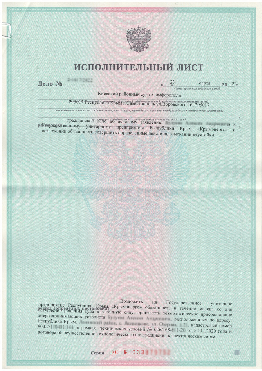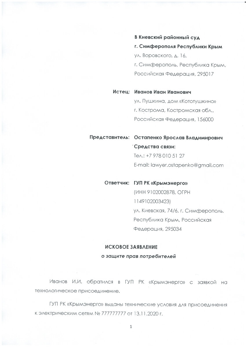 Вот пример установки ТУ в Симферопольском районе. У нас в штате есть квалифицированный электрик, который занимается установкой трубостоек. Мы работаем по всему Крыму. Если нужна помощь — звоните Если видите, что срок исполнения договора подходит к концу, а вашим вопросом никто не занимается нужно бить тревогу. Писать жалобы в Прокуратуру, МинТоп, ФАС и тд — бесполезно, в ответ Вы получите стандартные отписки. Ситуация в Крыму с подключениями к сети крайне тяжёлая, ко мне за помощью обращаются даже граждане с договорами, в которых просрочки от нескольких месяцев до нескольких лет. Самая «древний» договор был из Ялты. В 2017 году гражданин подал заявку, но на момент января 2024 года света как не было, так и нет. Мы сейчас продлили срок действия ТУ и подали иск в суд. Постараемся к лету уже добиться подключения. Причин этому много — от большой нагрузки и «безответственности» местных РЭС до коррупционной составляющей. В июне 2022 г. ФСБ вскрыла коррупционную схему в Алуштинском Крымэнерго, поэтому пользоваться «серыми» схемами настоятельно не рекомендую! Я с 2019 года защищаю права граждан на получение такого важного ресурса, как электрическая энергия, ведь Крымэнерго не выполняет социально важную функцию, от имени государства, — гарантированное право на достойное обеспечение электричеством. Единственный законный способ получить подключение в 2022 г. это судебный процесс, а именно обращение в суд с иском о понуждении исполнить обязательства по договору, взыскании компенсации морального вреда, штрафа, неустойки и судебных расходов. Более того за неисполнение решения суда предусмотрена уголовная ответственность по ст. 315 УК РФ. Согласно ч. 2 ст 315 УК РФ, злостное неисполнение служащим государственного или муниципального учреждения вступившего в законную силу решения суда или иного судебного акта, а равно воспрепятствование их исполнению — наказываются штрафом в размере до двухсот тысяч рублей или в размере заработной платы или иного дохода осужденного за период до восемнадцати месяцев, либо лишением права занимать определенные должности или заниматься определенной деятельностью на срок до пяти лет, либо обязательными работами на срок до четырехсот восьмидесяти часов, либо принудительными работами на срок до двух лет, либо арестом на срок до шести месяцев, либо лишением свободы на срок до двух лет. Это необязательный порядок перед обращением в суд, но подавая претензию, мы показываем, что действуем добросовестно 1) Обязать Крымэнерго подключить объект к сетям в течении 30 дней. 2) Взыскать в пользу истца компенсацию морального вреда. В моей практике максимальный размер морального вреда составлял 40 000 руб. 3) Взыскать в пользу истца неустойку по договору. Размер неустойки зависит от того сколько платили по договору 4) Взыскать в пользу истца штраф 50% от присужденной суммы Например суд взыскал компенсацию морального вреда 20 000 руб. и неустойку 10 000 руб, значит штраф будет 15 000 руб. ((20 000 + 10 000)/2) 5) Компенсацию трат на юриста Так как истец вынужден был обращаться в суд и нести убытки на услуги юриста, то согласно ст. 98 ГПК РФ эти расходы подлежат взысканию с Крымэнерго. 6) Неустойку на случай неисполнения решения суда. Чтобы мотивировать Крымэнерго в кратчайшие сроки исполнить решения суда мы просим взыскивать в пользу истца до 1 000 руб. в день за к