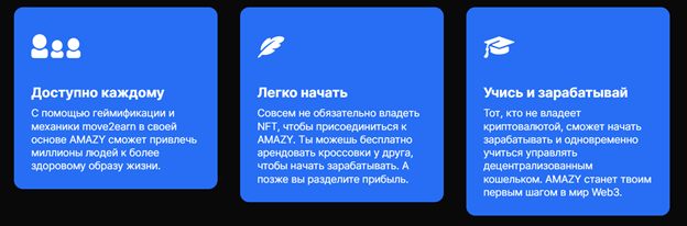 После создания аккаунта нам понадобятся NFT-кроссовки, которые мы сможем приобрести на маркетплейсе игры. Начальная стоимость кроссовок будет 100$. Теперь у нас есть все, чтобы начать играть! Классический вид NFT для move to earn приложений — это виртуальные кроссовки. В Amazy будет более 100 000 NFT. Кроссовки делятся на 4 типа, предназначенные для разных скоростей ходьбы или бега: У каждого кроссовка есть свои характеристики, всего их 4: Диапазон базовых характеристик кроссовка зависит от его класса редкости: Важное уточнение: у кроссовка будет 4 слота для «чипов», которые можно открыть с повышением уровня. Каждый чип может увеличить значение одной из характеристик. В кроссовке не может быть более 2-х чипов одного вида. В Amazy основной способ заработка — это прогулки/пробежки в ваших NFT-кроссовках. Механика заработка ничем не отличается от механики в STEPN: Забеги. Ежедневно у вас накапливается определенное количество энергии. И, чтобы заработать, вам нужно включить GPS-трекер на вашем телефоне, выбрать кроссовок и начать «забег». В течение прогулки/пробежки каждую минуту у вас тратится энергия, и вы получаете токен $AMT, а также есть шанс, что вам выпадет мистери-бокс. Заработок зависит от показателя «Performance» Важное уточнение: чем выше ваш показатель «Performance», тем меньше шанс на выпадение мистери-бокса. Помимо двигательной активности, вы сможете заработать в игре другими способами: Разберем некоторые интересные возможности, которые нам предоставит Amazy: На данный момент сложно оценить успех Amazy, т.к. начальная версия игры не будет ничем отличаться от привычного нам STEPN. Однако, если команда разработчиков действительно воплотит все свои планы, то мы получим уникальное глобальное M2E-приложение, которое своим множеством механик сможет удовлетворить запросы практически всех категорий пользователей! Читайте свежие новости из мира NFT в Telegram! Больше полезной информации ищите на нашем сайте и соцсетях: в Instagram и Tik Tok.