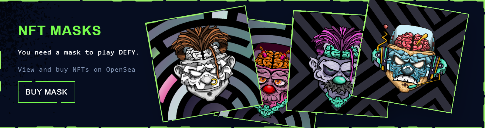 Как мы и говорили ранее, для игры в DEFY нам потребуется хотя бы одна NFT-маска. На момент написания статьи самая дешевая стоит 0.1 ETH