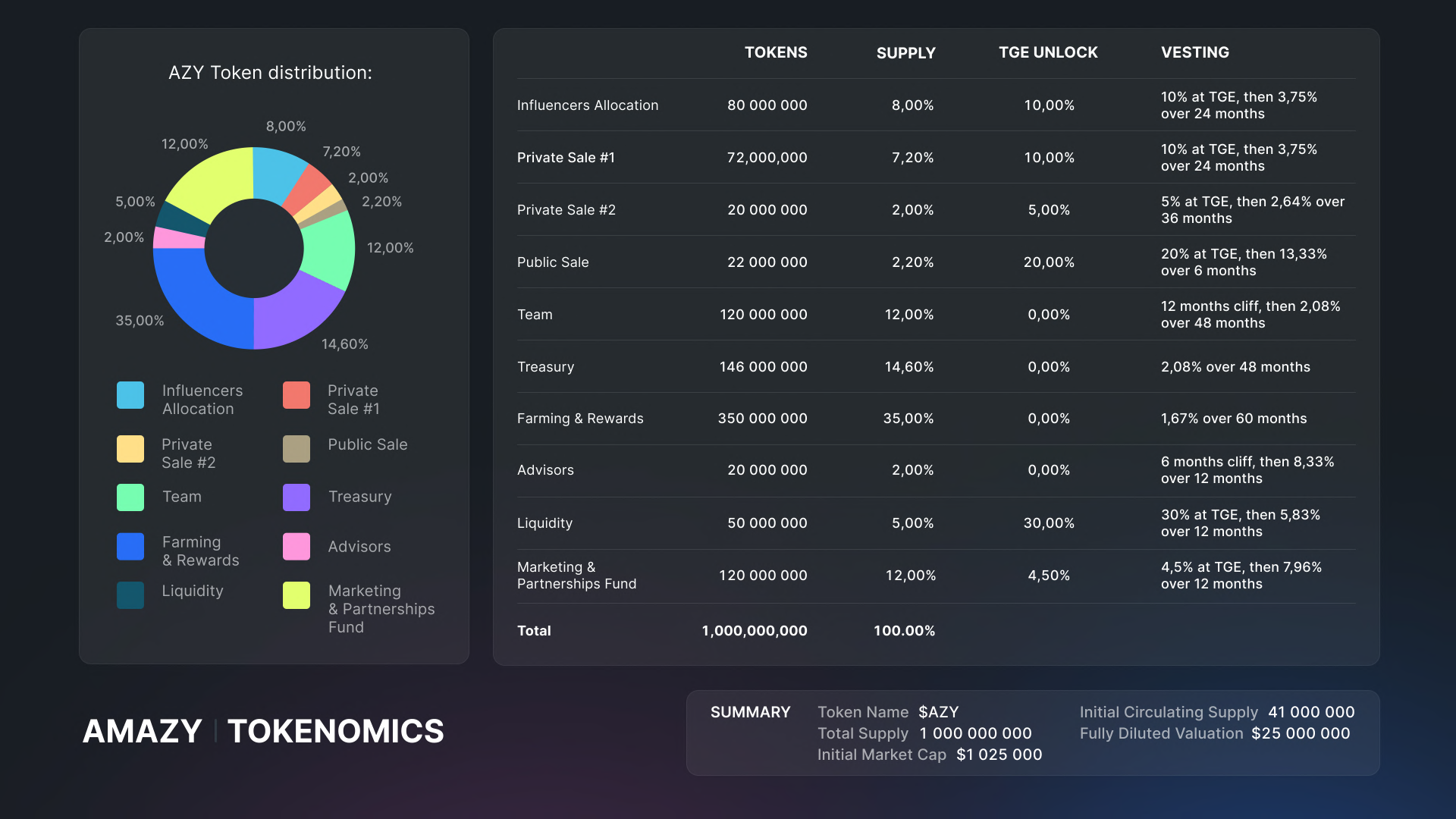 AZY предназначен для распределения наград от роста и развития AMAZY между игроками, разработчиками и стейкерами токена. В дальнейшем позволит держателям управлять развитием платформы AMAZY, сделав ее децентрализованной.