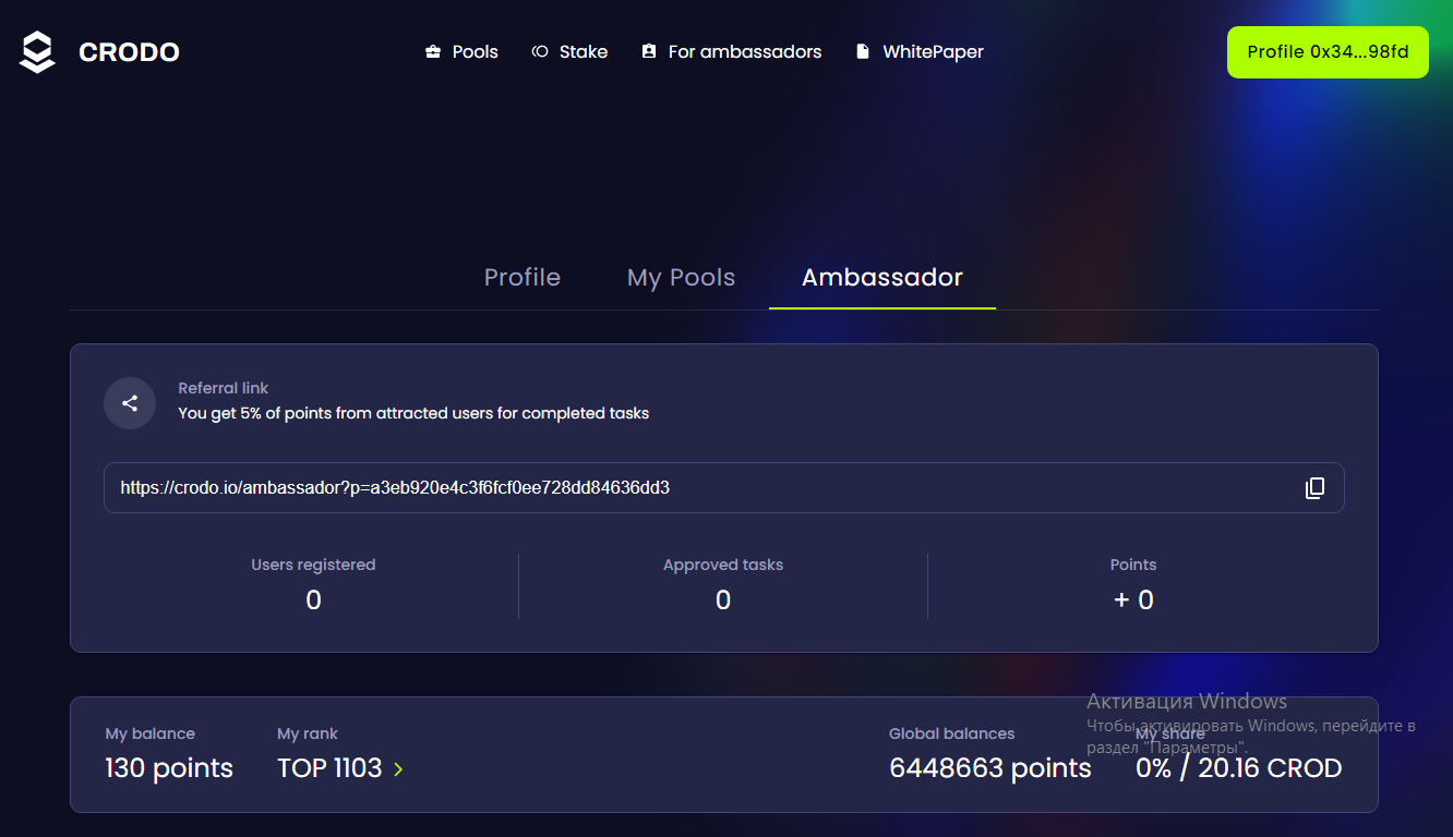 Тут ми можемо бачити персональне посилання кожного амбасадора. Ви можете поділитися ним з друзями, які теж бажають прийняти участь у амбасадорській програмі від Crodo та отримувати додаткові бали за виконання ними завдань.