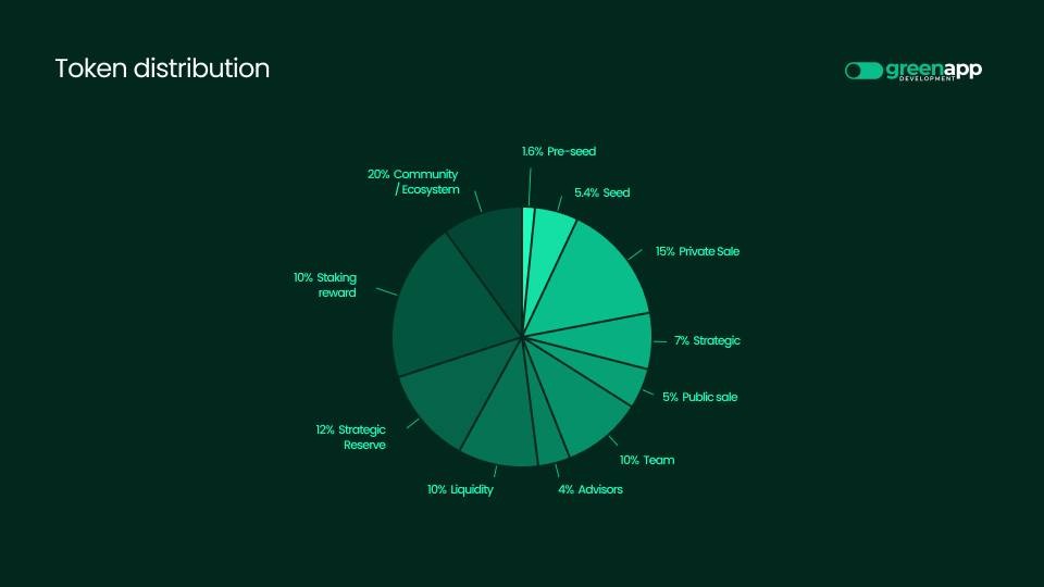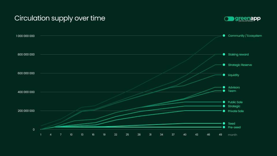 1,6% Pre-seed (32 000 USD по 0,002 долара США) за токен, блокування немає5,4% Seed (124 200 доларів США по 0,0023 долара США за токен) — блок протягом 6 місяців, далі по 4% щомісяця протягом 25 місяців.15% Private Sale ($420 000 по $0,0028 за токен) — блок на 4 місяці, далі 4% щомісяця протягом 25 місяців7% Стратегічний (Strategic) (224 000 доларів США за 0,0032 долара США за токен) — блок протягом 2 місяців, далі 4% щомісяця протягом 25 місяців.5% Публічна продаж (180 000 доларів США по 0,0036 долара США за токен) — 10% розблоковано, потім по 15% щомісяця протягом 2 місяців і далі на 3 місяці по 20%10% Команда — Блок протягом 18 місяців, розблокування перші 9 місяців по 2% на місяць, наступні 2 місяці по 4%, наступні 5 місяців по 10%, останні 2 місяці по 12%4% Радники (Advisors) — блок на 18 місяців, розблокування перші 9 місяців по 2% на місяць, наступні 2 місяці по 4%, наступні 5 місяців по 10%, останні 2 місяці по 12%10% Ліквідність — блок на 4 місяці, розблокування по 5% щомісяця протягом 4 місяців, потім розблокування на 4 місяці по 20%12% Стратегічний резерв — на 2 місяці по 6%, потім на 1 місяць по 8%, наступні 8 місяців розлиток по 10% кожні 2 місяці10% Винагорода за стейкінг — блок протягом 11 місяців, плавне розблокування протягом 38 місяців20% спільнота / екосистема — 10% розблоковано, розблокування 90% протягом 48 місяців. Січень 2022 р. На цьому етапі створюється концепція майбутньої продукції та економічна модель проекту.Запущено сайт, на блокчейні Chia викарбувано 1 мільярд токенів GAD.Розробка UI/UX дизайну для мобільної версії гаманця. Лютий 2022 р. Передпосівний раунд. Розробка та випуск UI/UX прототипу версії мобільного гаманця за допомогою Chia та інших токенів. Квітень 2022 р. Початок розробки MVP-версії мобільного гаманця для Android та iOS. Розробка прототипу UI/UX для Green Swap. Червень 2022 р. Випуск робочої версії мобільного гаманця у Google Play. Виправлення помилок програми. Початок розробки розширення для браузера підтримує протокол web 3.0. Липень 2022 р. Публічний раунд продажів. Випуск робочої версії мобільного гаманця у App Store. Початок розробки децентралізованого обмінного сервісу Green Swap із підтримкою стандартів NFT0 та CAT1. Серпень 2022 р. Випуск браузерного розширення за допомогою протоколу web 3.0. Запуск веб-версії сервісу для майнінгу CAT1. Вересень 2022 р. Випуск веб-версії сервісу Green Swap Участь у щорічній конференції Blockchain Life. Початок розробки функції стейкінгу. Жовтень 2022 р. Інтеграція функції випуску токенів у мобільний додаток.Інтеграція функції обміну в мобільний додаток. Інтеграція функції стейкінгу в мобільний додаток. Листопад 2022 р. Початок розвитку маркетплейс NFT.Початок розробки кроссчейн-протоколу Green Bridge. Грудень 2022 р. Лістинг CEX. Активація функції стейкінгу та початок нарахування винагород. Січень 2023 р. Початок розробки платформи Green Starter.Випуск токена GAD у мережах SOL, BSC, ETH та інших. Лютий 2023 р. Випуск торгового майданчика NFT. Березень 2023 р. Випуск міжмережевого протоколу Green Bridge.Запуск DAO для керування автономією спільноти. Початок розробки b2b продукту прийому платежів. Квітень 2023 р. Випуск платформи Green Starter. Початок розробки системи реклами Geen ADS. Травень 2023 р. Інтеграція DAO панелі моніторингу автономії спільноти у мобільний додаток. Інтеграція функцій маркетплейсу NFT у мобільний додаток. Червень 2023 р. Інтеграція функціонала платформи Green Starter у мобільний додаток. Випуск b2b продукту прийому платежів в криптовалюте. Ось і розглянули мі токиноміку і дорожню карту про