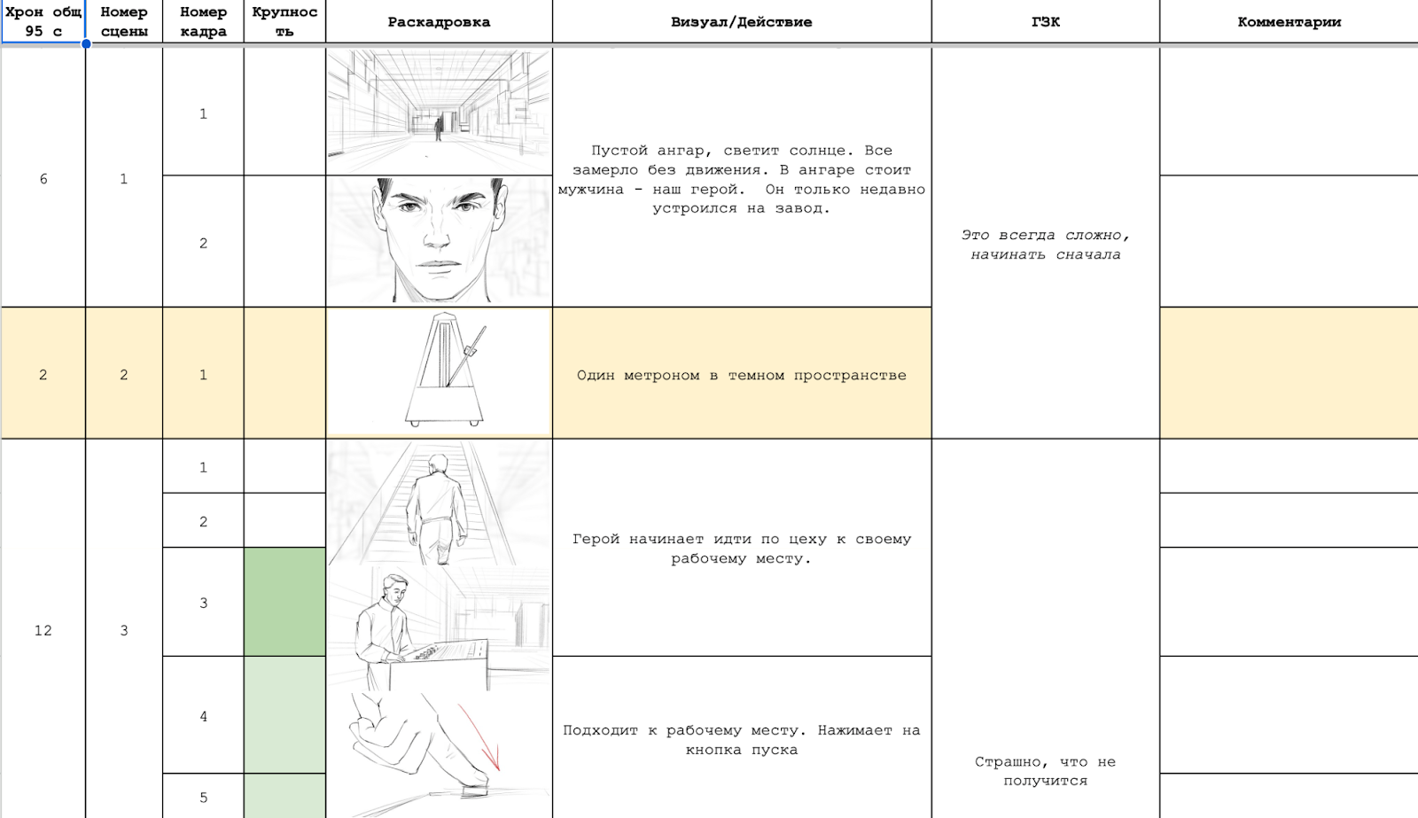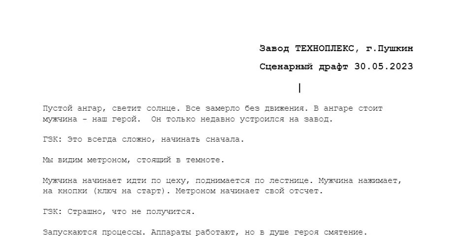 Команда получила множество интересных идей и понимания о работе и компании, что позволило представить клиенту три концепции для ролика. На брифинге мы совместно утвердили концепцию с рабочим названием «Часы». Представляем его синопсис: "Инсайт: Производственные процессы на Заводе ТЕХНОПЛЕКС выстроены на самом высоком уровне, что позволяет производить продукцию круглосуточно. Мы показываем коллектив и работу изнутри глазами нового сотрудника, которого будет играть актер. Наш герой приходит на производство и своими глазами видит, что ТЕХНОПЛЕКС — это отлаженный механизм, который работает как часы благодаря слаженной работе сотрудников. В видеоряде мы предлагаем использовать ритмичный монтаж и подробные планы производства. Под ритмичные действия, напоминающие работу часового механизма, голос за кадром будет рассказывать о том, как герой вместе с коллегами преодолевает рабочие трудности и стремиться к совершенству и точности. Главный посыл — Завод ТЕХНОПЛЕКС работает как часы и четко выполняет поставленные задачи благодаря сплоченной и профессиональной команде." Важным моментом, который мы обсудили на брифинге, был выбор между использованием актера в качестве главного героя или специалистов предприятия. У нас возникали различные точки зрения по этому вопросу, однако в итоге мы пришли к компромиссу: главную роль исполняет актер, а эпизодические роли выполняют сотрудники предприятия. Может показаться странным, что мы упоминаем это в разделе о сценарии, но это решение оказало значительное влияние на написание сценария. Если бы главную роль исполнил сотрудник, сценарист был бы ограничен в его актерском выражении. Работая с актером, сценарист сразу имел широкий спектр возможностей для планирования различных сцен уже на этапе написания сценария. При создании сценария концепция приобрела окончательные черты, и сформировалась метафора — метроном, символизирующий синхронность работы команды. Осознавая жанр, в котором мы собираемся снимать, и творческую задачу, стоящую перед режиссером и оператором на площадке, мы приступили к формированию команды. Мы искали творческих профессионалов, чьи работы демонстрировали точную визуализацию задуманной идеи сценаристом, а также опыт съемок на неподготовленных локациях и с непрофессиональными актерами. Нам требовались творцы, способные воплотить концепцию визуально и преобразить натуральные условия съемки в преимущество. Мы искали людей с опытом работы с непрофессионалами, чтобы создать естественную и аутентичную атмосферу в ролике. Шоурил Алексея: https://vimeo.com/802422231 Работа Марии: https://www.youtube.com/watch?v=tm8ZTqipj6Q Сценарий уже на первом этапе был практически готов в своей окончательной версии. Однако, после проведения онлайн- и офлайн-скаутинга на производстве клиента, сценаристу вместе с иллюстратором пришлось внести несколько изменений. Эти изменения помогли улучшить согласованность сценария с фактическими условиями и добавить более точные детали, что позволило создать более убедительную и связную историю в окончательной версии. Задачей кастинга являлся подбор актера на роль молодого работника предприятия с игровым возрастом от 30 до 35 лет. Лидером кастинга стал Павел. Делимся его визиткой. Локация клиента находится на юге Санкт-Петербурга. Наша команда состояла из специали