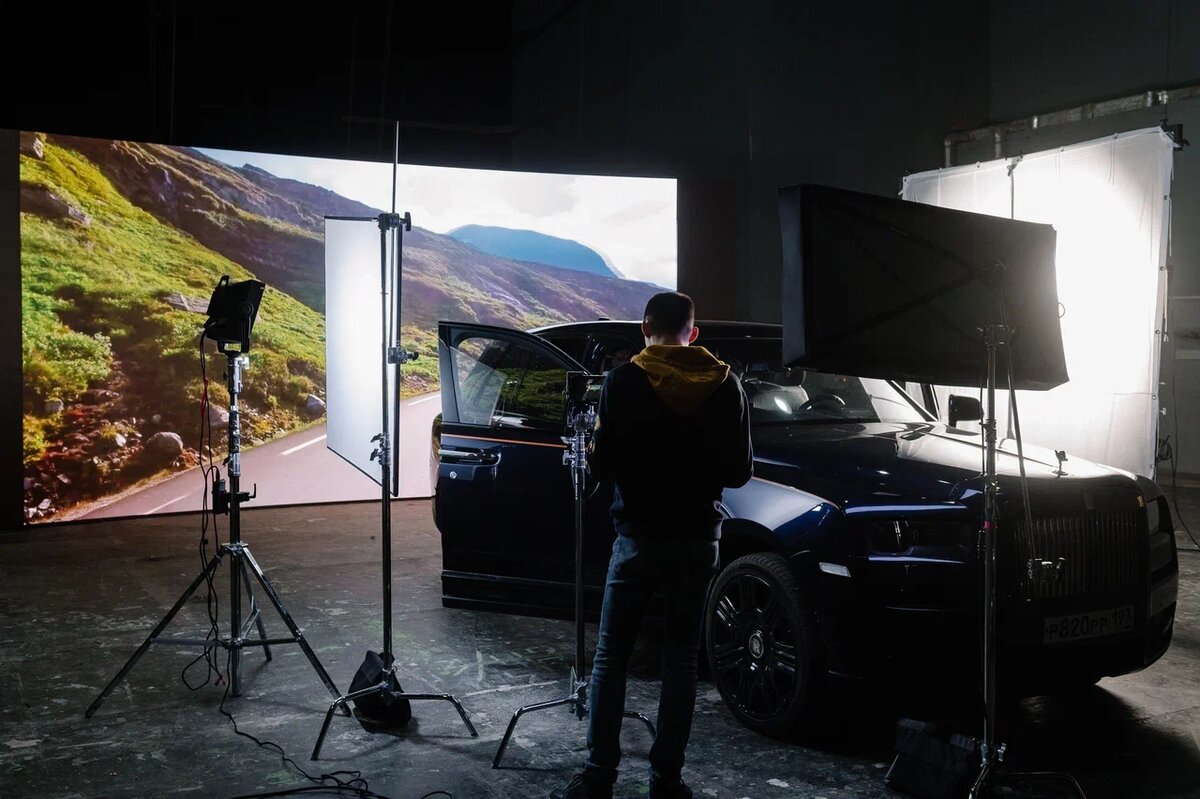 По просьбе заказчика мы подготовили два референса, по три варианта в каждом. Один был посвящен бюджетным анимированным сериям с большим количеством роликов, другой ― акцентным и дорогим в производстве. Бюджетный референс включал тематики 2D и 3D персонажей, а также движущиеся шары. Клиент выбрал простую в реализации 2D анимацию. В нее вошло 30 роликов по 3-5 секунд каждый, стоимость одной анимации составила 2 000 рублей. Результат можно посмотреть на shutterstock. Референс по живой съемке также содержал три сюжета. Мы предложили варианты «Мир будущего» с атмосферными космическими пейзажами, «Офис будущего» с классическими офисными сценами и «Дорогие видео» с автомобилями класса Lux. Заказчик выбрал люксовые машины. Логично, такие клипы наверняка будут пользоваться спросом на стоках. Что проще ― взять лицензию на клип или найти для съемок лакшери-авто?) Мы собирались снимать короткие (10-30 секунд) ролики с простыми сюжетами: водитель включает дворники, пассажир открывает окно и т.п. На каждую сценку подготовили сценарий, всего в нем было около 200 эпизодов. Отдельно проработали схемы освещения под разные ракурсы для наиболее выигрышного показа машин. Съемка планировалась в павильоне с огромными LED-экранами, отображающими красивые дневные фоны: мегаполис с небоскребами и природу с полями. При выборе студии ориентировались на наличие верхнего света для получения игры бликов на авто, а также на возможность въезда спорт-кара с низким клиренсом. Еще мы провели кастинг актеров и подобрали одежду. Бэкстейдж со съёмок. Вводные данные были такими: работаем с Bentley CONTINENTAL GT III и ROLLS-ROYCE CULLINAN. Нужно было отснять как можно больше роликов за 8 часов. План-минимум включал 100 видео, план-максимум ― 150. Мы сняли 120 сцен! Работали плотно, делали по 15 сюжетов в час. Кстати, у нас было два календарных плана и сценария съемки на случай непредвиденных обстоятельств. Которых, к счастью, не случилось. Монтаж был простым, так как снимали без экспериментов. На них просто не было времени! Цветокоррекцию тоже делали по классике. Обдумывали идею с окрашиванием сцен в разные цвета, но все-таки от нее отказались. Если впоследствии покупатель решит использовать несколько клипов в одном проекте, то вряд ли он будет в восторге от перепадов цвета. Бюджет на съемку 120 видео с дорогими автомобилями составил около 1 200 000 рублей, то есть примерно 10 000 рублей на ролик. Порядка 10% от этой суммы съела покупка лицензий на фоны. Стоковые площадки тщательно проверяют юридические аспекты чистоты контента. Мы сразу решали вопросы с правами: договаривались с актерами на вечное отчуждение, получали разрешения от владельцев машин и участников съемочной группы. Фоны приобретались на стоке по нестандартной лицензии, через общение с администрацией. Нам надо было получить права на их переработку и последующее коммерческое использование в других материалах. Чего не сделаешь в работе над уникальным заказом!