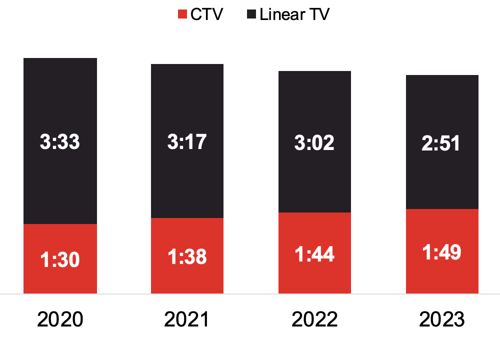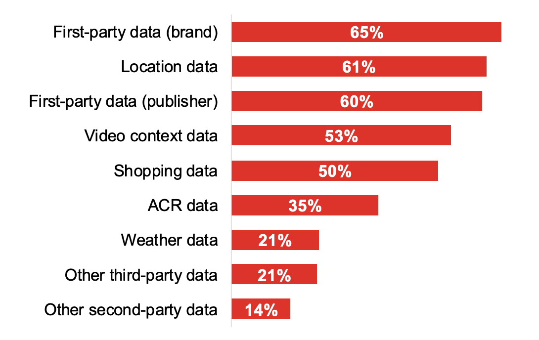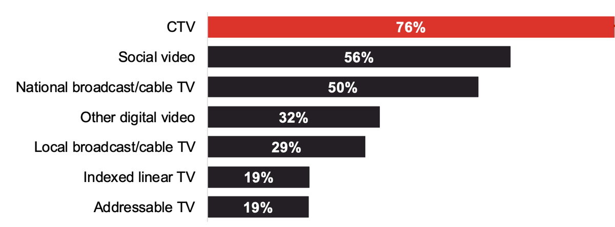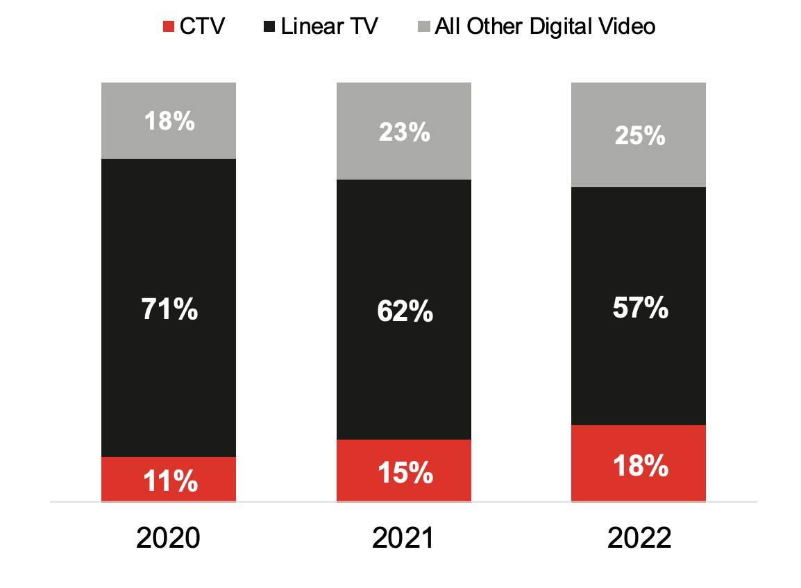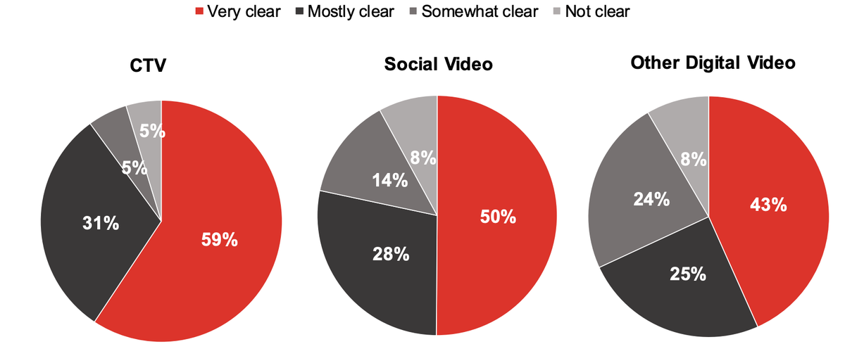Цифровой видеоконтент включает в себя CTV, ролики с социальных платформ и некоторые другие типы видео (от издателей и пр.). Под CTV подразумевается контент, доставляемый через интернет через Smart-TV, OTT-устройства и сервисы потокового видео (с подпиской или без нее). Видео по запросу является частью CTV.