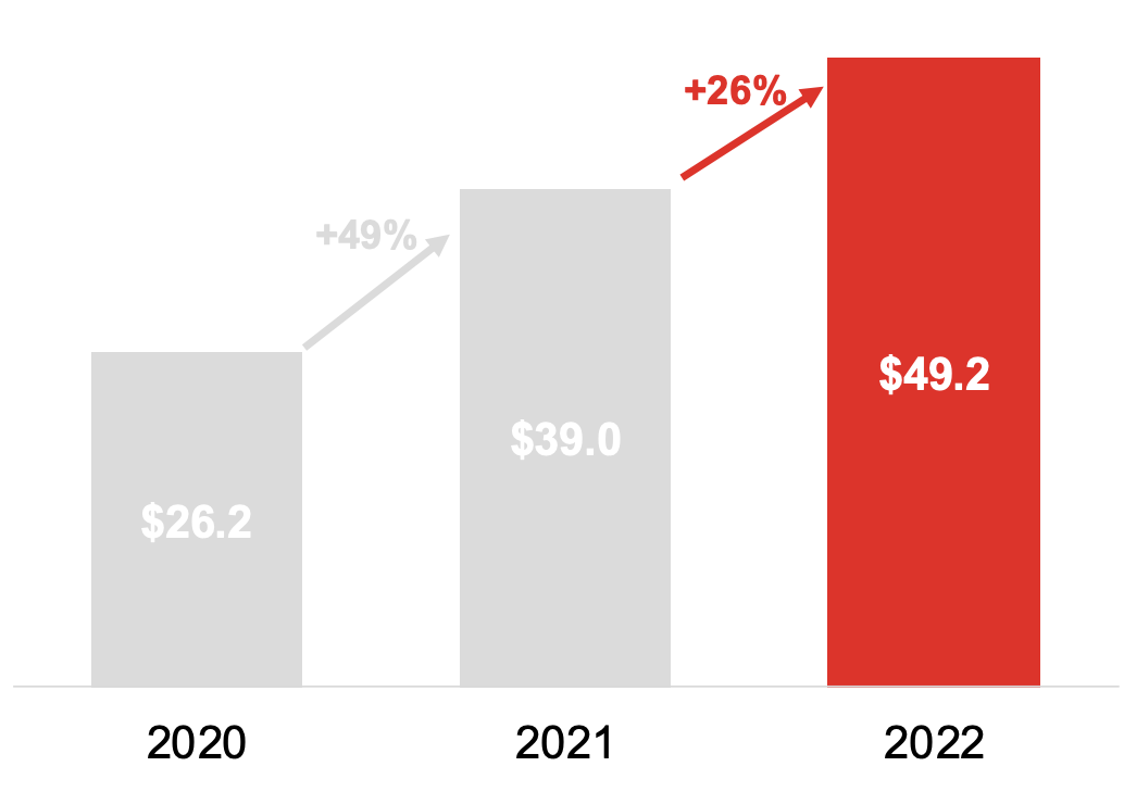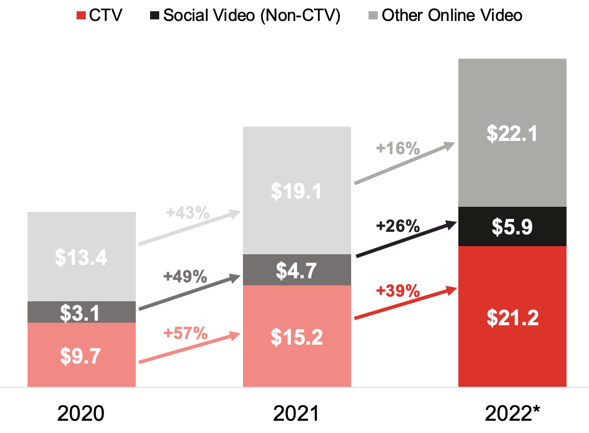 Расходы на цифровую видеорекламу в 2021 году выросли до 39 млрд долларов. Это на 49% больше, чем в прошлым году. Прогнозы на 2022 год составляют 49.2 млрд долларов, что говорит о росте в 26%.
