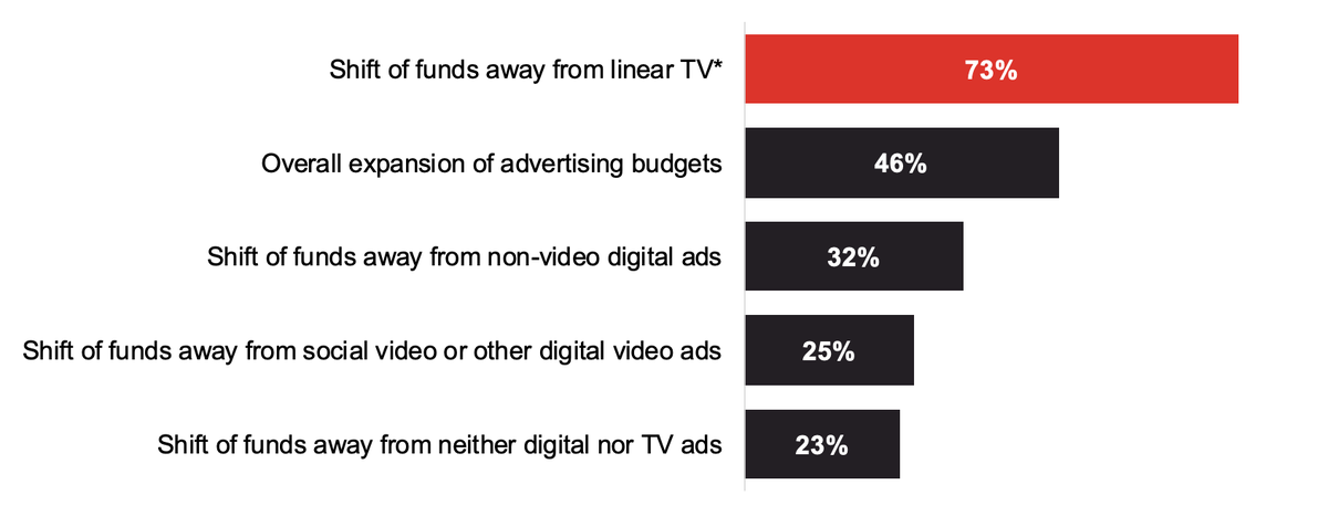 Быстрее всего растет канал CTV, его считают обязательным 76% покупателей. Расходы на него в 2021 году составили 15.2 млрд долларов (рост по сравнению с 2020 годом на 57%). В 2022 году ожидается дальнейший подъем — до 21.2 млрд долларов (рост на 39%). И тем не менее — расходы на CTV существенно отстают от интереса потребителей. На CTV приходится примерно 36% общего времени, включая линейное телевидение. При этом его доля в суммарном бюджете видеорекламы составляет всего 18%. Рассмотрим преимущества CTV по сравнению с линейным ТВ, а также с другими типами цифрового видео. И вот о чем свидетельствуют результаты опроса: CTV не использует сторонние cookie-файлы, что делает его более безопасным. Почти три из четырех покупателей (73%) ожидают, что рост расходов на CTV из-за устаревания cookie компенсируется оттоком долларов с линейного ТВ. Сложности использования CTV в основном связаны с раздробленностью. Покупатели указывают на трудности с кроссплатформенными кампаниями при управлении периодичностью (43%), измерением дополнительного охвата (48%) и т.п. Фрагментация и сложность измерений затрудняют использование KPI продаж и других бизнес-процессов. В ближайшие годы 88% покупателей ожидают слияние рынков линейного ТВ и CTV. Из них 66% уже имеют единую группу планирования для этих двух каналов, еще 25% хотят создать ее в будущем. Исследование выявило новые CTV-тактики от покупателей рекламы. Внедрение и доработка новых рекламных форматов способствуют переходу на CTV. Хорошо зарекомендовали себя рекламные кампании с возможностью покупки по клику, а также основанные на влиятельных лицах. По словам покупателей, эти форматы «созрели для CTV», поскольку их эффективность по всей воронке выше, чем у линейного ТВ. В опросе участвовали агентства и маркетологи (60% / 40%) с небольшими (до 10 млн), средними (10-50 млн) и крупными (более 50 млн) расходами на рекламу в соотношении 41% / 27% / 32%. Сможете назвать сколько стоят рекламные ролики? Пройдите тест и узнайте насколько точно вы можете оценить бюджет видео роликов. В качестве бонуса вы получите каталог на мировые видео с их посчитанными бюджетами.