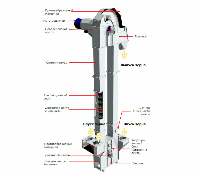 - нории, которые необходимы для доставки зерна на взвешивание, очистку от примесей и сушку. Вертикальная лента непрерывно совершает цикличное движение, внизу зачерпывает ковшами зерно, в верхней точке ковши опрокидываются, высыпая содержимое;