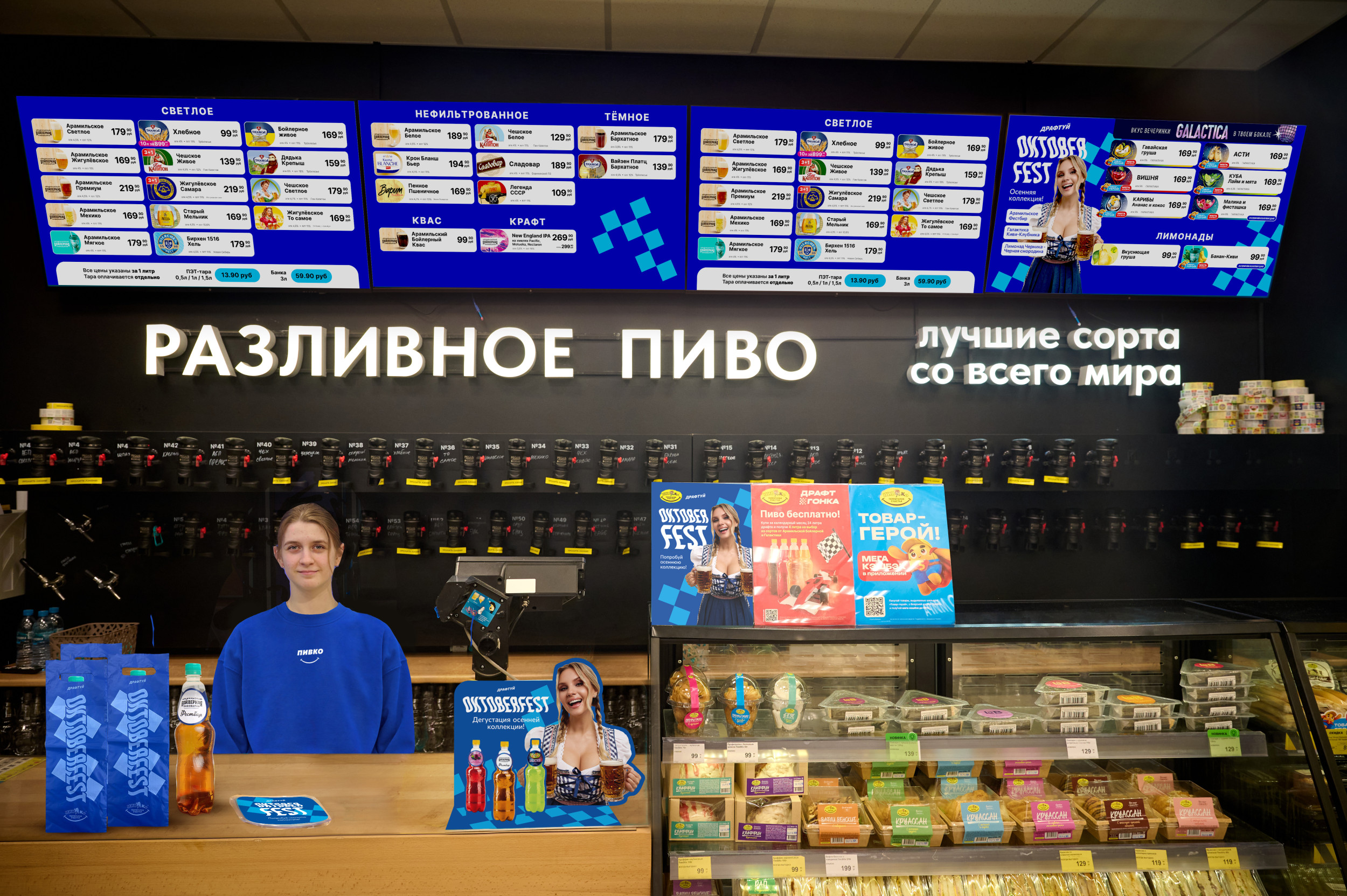 Алексей: Смена напитков — на этом абсолютно точно можно строить маркетинг нового направления «драфтуй». Просто говорить, что у нас самый вкусный драфт — не сильно рабочая тема, быстро приестся. А заведение новых напитков через смену коллекций — оказалось то, что надо. Живое доказательство: лимонад «Груша» уже много лет был в топе продаж каждое лето, а в этом сезоне его обогнал новый «Киви-Банан». Или «Галактика Вишня» всегда была самым продаваемым вкусом, но в это лето «Малина — Фисташка» опередила ее. «Арамильское Мягкое» тоже вошло в топ. То есть все сорта, которые у нас были заявлены в коллекции, вышли в топ-продаж. «Драфтуй» — всесезонное продвижение разливных напитков Кристина: С 1 сентября «Драфтуй» продолжается, но уже в синем цвете — осенней коллекцией «Октоберфест». Это новые цвета, новые слоганы, новые напитки в трех категориях. Теперь ежегодно мы планируем делать три коллекции: осень — с сентября по октябрь, зимняя — с ноября по март, летняя — с апреля по август. Алексей: Задач у такого продвижения на самом деле сразу несколько. Первая — выделяться на рынке и постоянно быть актуальными и интересными для покупателя. Смена цветовой гаммы во всех POS-материалах и униформе продавцов, обновление коллекции напитков на дегустационной стойке, свежие образы в рекламе и приложении — та важная визуальная часть, которая в первую очередь считывается клиентами. Вторая задача — подсвечивать новинки на стойке розлива. Осенью мы представим покупателям новый сорт пива, а также новые вкусы «Галактики» и лимонада. Важно их предлагать пробовать, что само по себе вносит интерактив во взаимодействие с покупателями. Третья задача — глобальная: нам нужно изменить отношение к разливному. В помощь — модное слово «драфт». Чтобы весь персонал и партнеры быстрее привыкли пользоваться именно этим определением самого маржинального продукта сети, мы во всех брифах, папках 1С, рекламе — пишем «драфт», а не розлив. Затраты на одну торговую точку для «Драфтуй Октоберфест» Полиграфия (плакат А4, режимник, вставка в монетницу, воблеры) — 0 руб., отправим ее партнеру бесплатно Стойка дегустационная — 700 руб. Флаги 2 штуки возле ТТ — 12 200 руб. (полный комплект с основанием, флагштоком и полотном) Баннер на фасад — 4 000 — 6 000 руб. Форма на двух драфт-боев — 4 400 руб. Бэйдж с рекламной лентой — 500 руб/шт. Все медиа (сайт, мобильное приложение, ТВ-экраны, лендинг) — 0 руб. «Осень 2025» — коллекция «Октоберфест» Кристина: Главный цвет — синий. Глубокий и очень красивый. Так как коллекция будет работать всего два месяца и 1 ноября сменится зимней, то для экономии мы решили заменить в этом цвете не все, что делали летом. В синем дизайне будут: пакеты, в которые ставится бутылка драфта (для удобства сделали с ручками), промо-стойки, цифровые экраны с ценами, заставка в приложении, плюс лонгсливы для драфт-боев. Для остального персонала разработаны синие бейджики, а футболки у них остаются серые. Баннеры на фасадах магазинов — конечно, тоже меняем. Стаканов уже не будет. Они вернутся в сеть в апреле — когда запустим коллекцию «Лето 2026». Яна: Франшизе мы уже презентовали «Октоберфест», и все материалы готовы для заказа. Со стороны маркетинга могу сказать, что глубокий синий шикарно смотрится на контрасте с желтым — основным цветом сети. Магазины получаются очень яркими, притягив