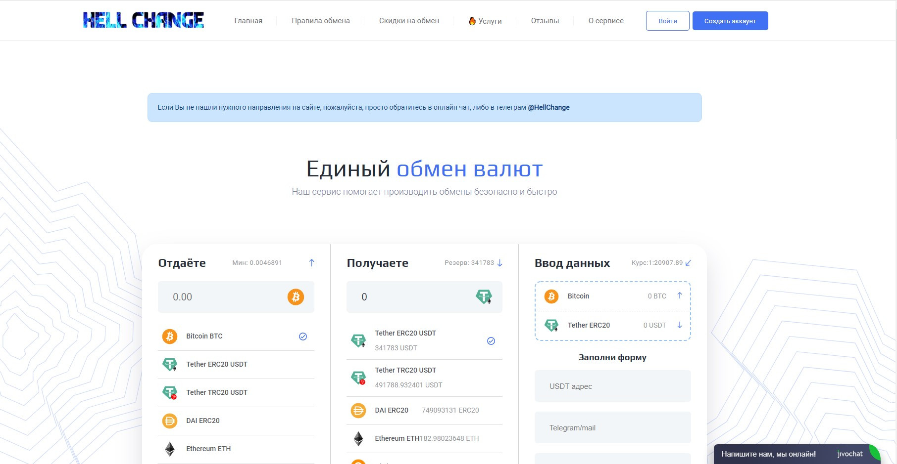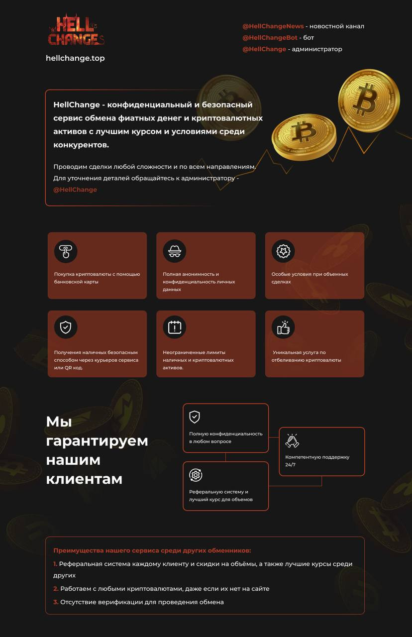 Рассмотрим достаточно молодой, но перспективный обменник для обмена криптовалют. При переходе на сайт мы видим достаточно стандартный внешний вид. Как говорится, впрочем ничего особенного. Стандартный выбор валют, сумма обмена, создания заявки. Но, весь интерес к этому обменнику совершенно в другом. Во-первых, они предоставляют лучший курс на объемы, что достаточно выгодно для серьёзных клиентов. А как вы думаете, если бы к ним не шли клиенты с огромными деньгами, ставили ли бы они такое прекрасное предложение на объёмы? Верно, нет. А это уже предсказывает, что этому обменнику доверяют не маленькие деньги. Ещё одним интересным преимуществом является то, что ребята предлагают обмен совершенно любой криптовалюты, вне зависимости от того, есть эта пара на сайте или нет. Для проведения такого обмена достаточно просто связаться с менеджером в телеграмме или написать в техподдержку на сайте. Не убираем из внимания также тот факт, что здесь присутствует Реферальная система после регистрации на сайте. Это также даёт небольшой бонус к вашим обменам. Кроме всего этого, владельцы обменника добавили идеальную возможность делать обмены без предоставления личных данных и прохождения верификации на сайте. Конечно, многие могут сказать, что это привлекает за собой не совсем честных держателей криптовалют, но на самом деле это не всегда так. Очень часто даже трейдеры, которые работают официально с P2P биржами могут опасаться прохождения верификаций на тех или иных сайтах для обмена, вне зависимости от того, что их средства на 100% чистые и заработаны легальным способом. Рассмотрим также другую сторону медали. Допустим, у вас есть рубли/доллары/гривны или другая валюта на вашей банковской карте и вы хотите приобрести за неё BTC или ETH. Сделать это без верификации вашей банковской карты практически невозможно на большинстве современных площадках для обмена. HellChange же предоставляет возможность покупки криптовалюты с помощью банковской карты без прохождения обязательной верификации. Также отличным преимуществом является тот факт, что ребята имеют неограниченные активы наличных и криптовалютных активов. В сравнении с другими площадками, эти лимиты являются на самом деле огромными. Для вашего удобства на проекте работает компетентная техническая поддержка 24/7, которая поможет разобраться во всех вопросах и предоставит консультацию по работе с сервисом. Многие опытные криптовалютные холдеры, вне зависимости от появления у них криптовалюты хотя бы раз слышали о миксере. BTC миксер — специальный сервис, который направлен для анонимизации и повышения конфиденциальности проводимых в сети Биткоин транзакций. Вроде как все понятно, но никто не задумывался, что вряд ли это на 100% сможет скрыть ваши транзакции от посторонних глаз. Команда HellChange предоставляет своим клиентам уникальную услугу — отбеливание криптовалюты даже при самом худшем AML. При этом, ребята не просто пользуются биткоин миксером, как многие обменнике на рынке, а выработали собственную стратегию, с помощью которой проводят такого рода операции. С помощью такого способа, в отличии от миксера они полностью обрывают цепочку транзакций и вы получаете стерильно чистые монеты. Казалось бы, достаточно узконаправленная услуга, но в современном мире может пользоваться спросом. В заключении