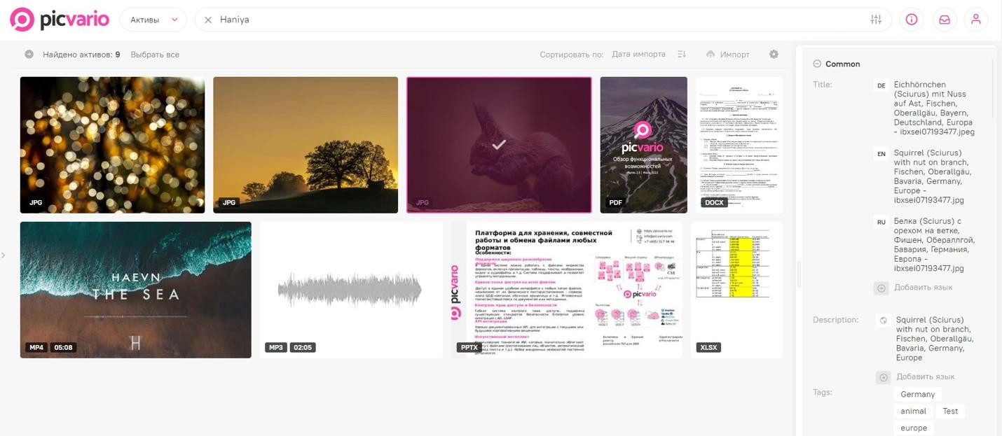 На платформе можно мгновенно найти требуемые файлы. Это возможно благодаря наличию метаданных, которые содержат краткую текстовую информацию, описывающую файл. Искать актив можно и с помощью функции полнотекстового поиска, то есть по его содержимому. Так, найти файл возможно всего в несколько кликов.