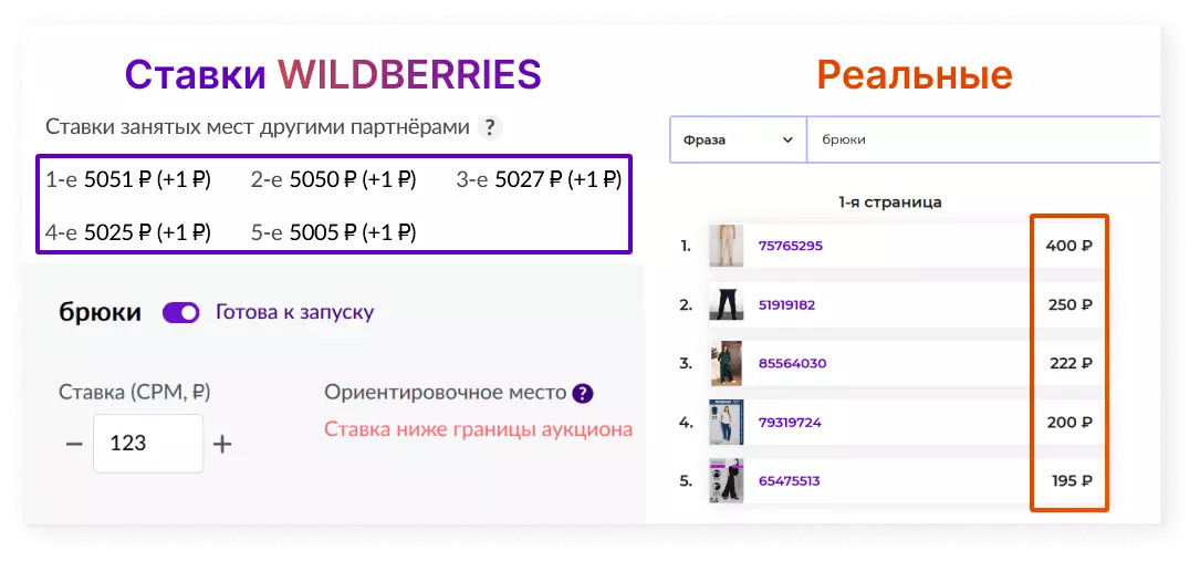 Отвечая на второй вопрос, сервис отмечает 4 основных результата, которые можно получить: во-первых, оптимизация расходов за счет оплаты по актуальным ставкам (т.е. возможность узнать реальные ставки, которые на самом деле ниже на 50, 70, а иногда и 90%, чем те, что предлагает WILDBERRIES). Во-вторых, преимущество над конкурентами в поисковой рекламе и рекламе в карточке товара, для этого используется биддер — программа, которая помогает контролировать значения ставок в контекстной рекламе и изменяет их по надобности. В-третьих, возможность получать максимум продаж с помощью рекламы, и в-четвертых — возможность выйти в топ по поисковому запросу без самовыкупа.
