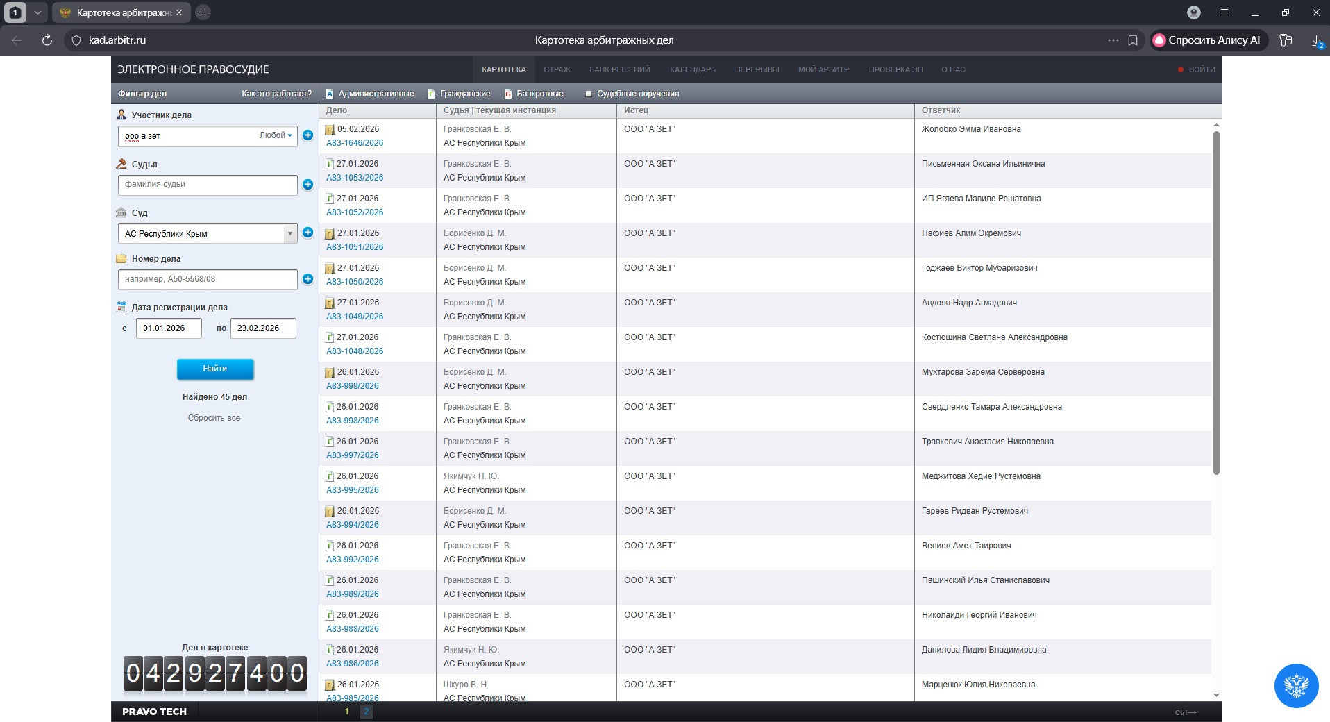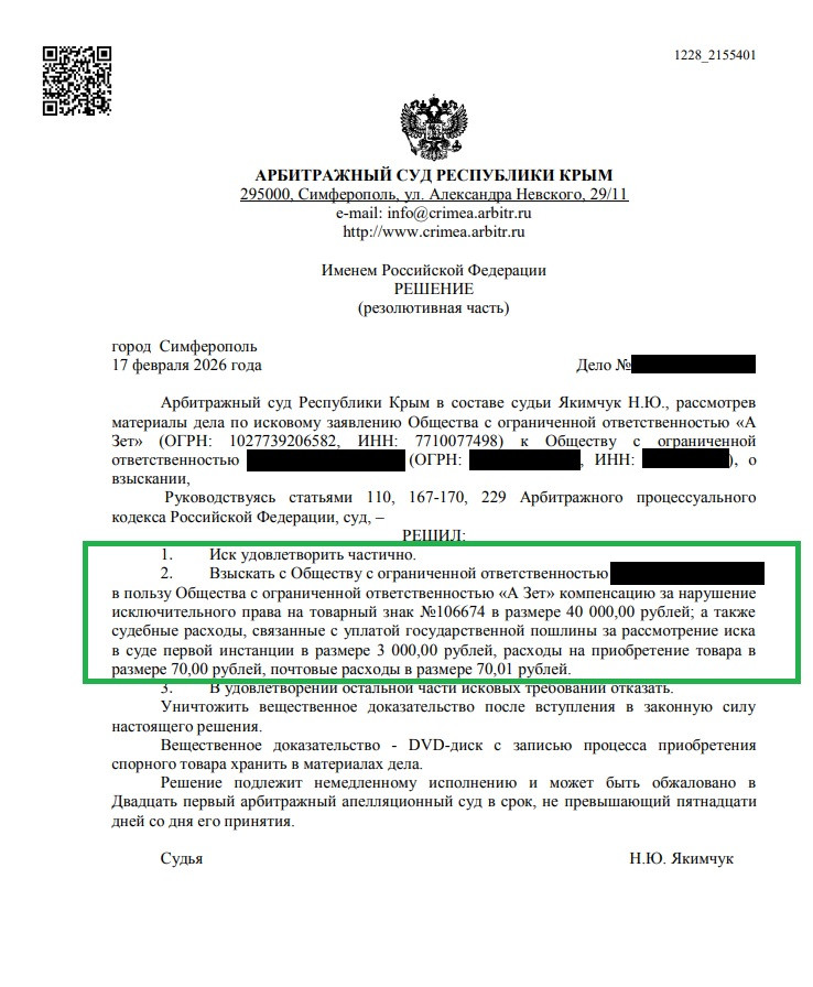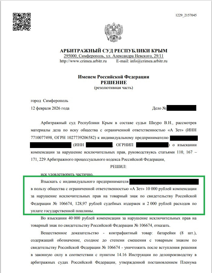 ООО «А Зет» требует компенсации за продажу контрафактных батареек 50 000 рублей, порой 100 000 и 500 000 рублей, а количество дел в 2026 в Арбитражном суде Республики Крым перевалило за 400 уже в феврале месяце.