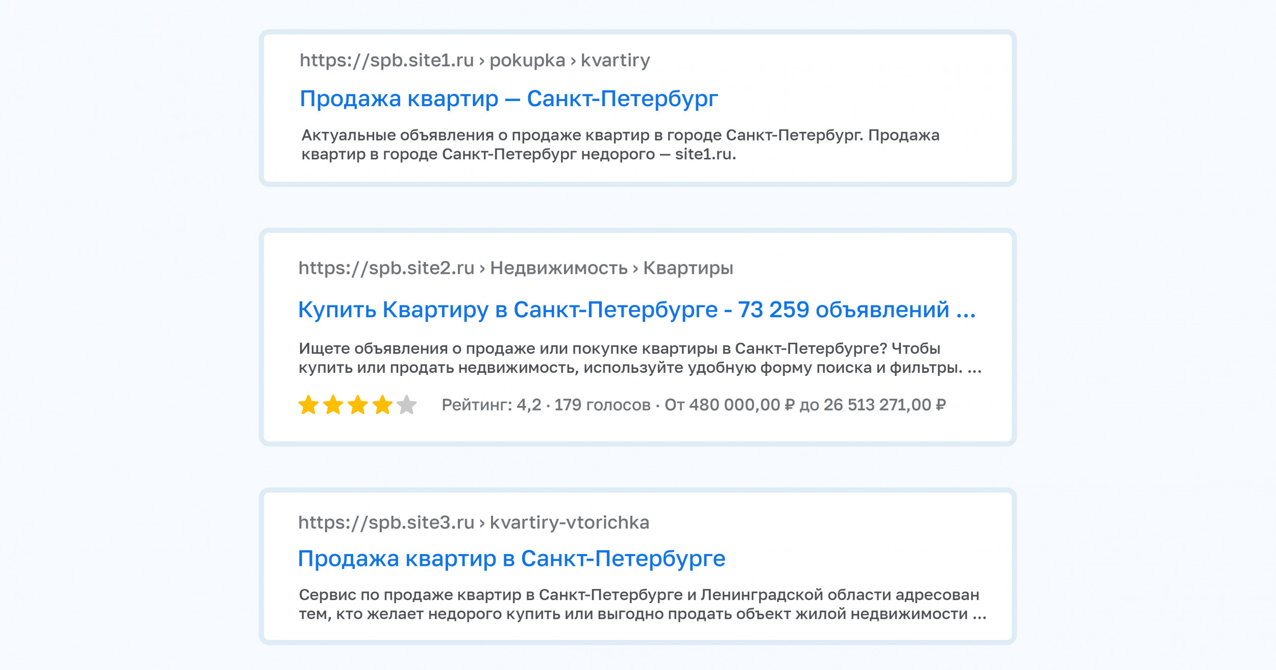 Если пользователь ищет в поиске доставку цветов, то ему будут показаны сайты тех компаний, которые доставляют цветы в том же городе. Достигается это с помощью геотаргетинга, то есть учитывания местоположение пользователя. При продвижении сайта по всей стране крайне важно проверять запросы на наличие геотаргетинга. Если по продвигаемым запросам показываются только локальные результаты, то у вас нет шансов получить трафик с поиска сайтом не оптимизированным под каждый отдельный город. Проверить есть ли по запросу геотаргетинг (то есть геозависимость) можно с помощью сервиса скоринга запросов. Если он есть, то для продвижения придется разворачивать копию каталога услуг или товаров под каждый целевой город, в котором есть поисковый спрос. Пользователи способны очень сильно влиять на позиции сайта по поисковым запросам, особенно это заметно при продвижении банков: только один из банков снижает ставку на кредит, как тут же он попадает в первые результаты поиска по связанным с кредитом запросам. Ключевое влияние на позиции имеют такие показатели как «длинный клик» и «последний клик». При «длинном клике» пользователи проводят на сайте больше времени, чем на сайтах конкурентов. При «последнем клике» пользователи перейдя на наш сайт из поиска уже не вернулись в поиск, то есть скорее всего решили свою задачу. Используя поведенческие факторы можно достичь действительно взрывного роста. Для этого вам нужно улучшать конверсию сайта, не снижая его информативность. И заведите уже блог, чек-листы, калькуляторы и другой полезный вовлекающий пользователей функционал. Поисковых системы уже давно умеют анализировать тональности упоминаний компаний и сайтов. Особенно это касается упоминаний на их собственных сервисах Яндекс.Бизнес и Google Мой Бизнес. У компаний, которые упоминаются в негативном контексте, крайне мало шансов занять хорошие позиции в поиске. Значимость репутации в сети только усилилась после обновления Y1 в Яндексе. Особенно критично это для сайтов автодилеров и других тематик, в которых пользователи регулярно генерируют негативные отзывы. Микроразметка — специальная семантическая разметка данных в коде страницы сайта. Она позволяет сообщить поисковой системе важную информацию, которая будет влиять на вид страниц сайта в поиске. Такой информацией может быть цена на товар, количество ценовых предложений на странице, средняя оценка пользователей и многое другое. Размещение микроразметки позволяет добиваться повышенной кликабельности сайта в поиске, что приводит к росту трафика даже при тех же позициях. Основной эффект от микроразметки заметен в Google, где она позволяет сильно выделяться на фоне конкурентов. У каждого из нас свой поиск, учитывающий персональные интересы и пытающийся предсказать что нас на самом деле интересует. Например, по запросу «ягуар» любителю передач вроде Top Gear будут показаны автомобили, а зоологу — животные. Также в рамках персонализации поиск старается показывать нам чаще результаты с сайтов на которых мы уже были ранее. Использовать персонализацию можно сформировав блог и публикуя статьи, которые будут ловить покупателей на предыдущих этапах лестницы узнаваемости Бена Ханта, до поиска конкретного продукта. Например, когда вы продаете свой зерновой кофе и пишите статьи про выбор кофемаш