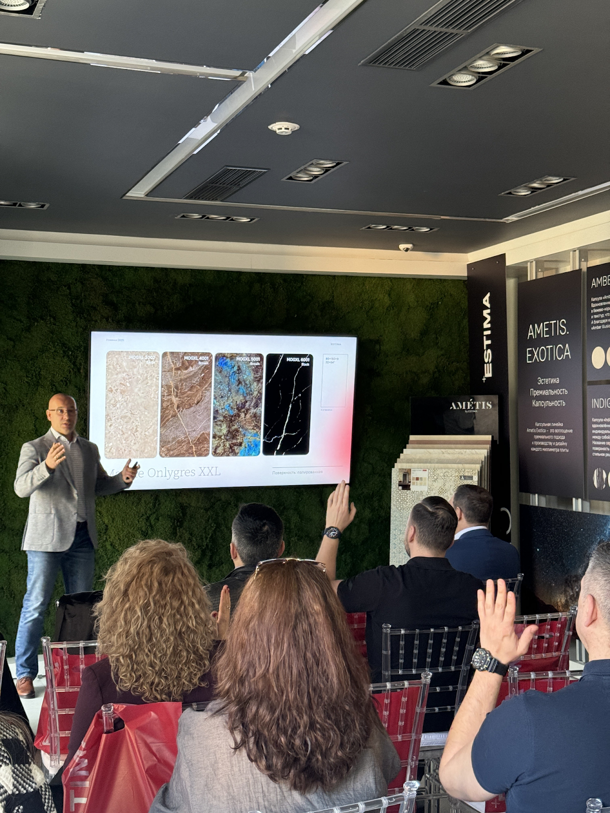 Особое внимание в рамках презентации было приковано к капсульной линейке Ametis Exotica — настоящему симбиозу дизайна и технологий, который задает новые стандарты в оформлении интерьеров. Центральное место в экспозиции заняла капсульная линейка, в которую вошли две выразительные серии — Indigo Illusion и Amber Illusion. Их концепция — это не просто работа с цветовыми акцентами и фактурами, а результат симбиоза природного вдохновения, современных технологий и высокого уровня качества производства. Благодаря трехступенчатому контролю качества и внимательному подходу к деталям коллекции отвечают как эстетическим требованиям, так и требованиям к износостойкости и долговечности. Indigo Illusion включает глубокие синие и бирюзовые оттенки, создающие ощущение свежести и глубины, а Amber Illusion предлагает тепло янтарных переливов и бежево-коричневые тона, даря пространству гармонию и утонченность. Эти капсулы демонстрируют, как природа и современные технологии могут сосуществовать, создавая выразительные дизайнерские решения. Технологии «Прикосновение» и «Совершенствование» раскрывают выразительность текстур и рельефа поверхности, подчеркивая эстетическую ценность плитки и создавая эффект погружения в интерьер. За счет детальной проработки рисунка и сложных спецэффектов керамогранит становится акцентным элементом пространства и приобретает уникальные тактильные свойства. Капсулы Ametis Exotica — это комплексный и осознанный подход к оформлению пространства, который не только экономит время клиента, представляя готовое решение в виде капсул, но и помогает создать по-настоящему эксклюзивный дизайнерский интерьер. Специалисты Estima адаптировали самые востребованные мировые тренды с учетом особенностей российского потребителя. — резюмировала руководитель отдела продакт-маркетинга компании Estima Надежда Новоявчева. Кроме того, на презентации были представлены и другие новинки компании, например, коллекция Patina в бренде Estima. Благодаря технологии Spark-эффект, керамогранит из этой коллекции сочетает глубокие охристые тона меди и бронзы с мерцающими переливами, создавая эффект живой поверхности и придавая пространству выразительность и глубину. Другой яркой новинкой стала коллекция Riff, в линейке Estima City вдохновленная природной текстурой древесины. Керамогранит передает естественное тепло и уют, но при этом обладает высокой прочностью и устойчивостью к износу. В интерьере коллекция Riff помогает создать гармоничный баланс между природной эстетикой и ритмом современного города. Также были продемонстрированы коллекции Belize и Tolanto в премиальной линейке Ametis by Estima, вдохновленные тропической природой и естественными рельефами, а также в бренде Onlygres коллекция Marble, воплощающая мраморную элегантность в высокотехнологичном исполнении. Благодаря крупным форматам плит эта коллекция минимизирует количество швов, создавая эффект цельного покрытия и визуально увеличивает пространство. В 2025 году мы сосредоточились на создании продуктов, которые отвечают современным трендам дизайна и технологиям производства, позволяющим наиболее реалистично воссоздать рисунок. Помимо потрясающе красивых новых коллекций, уже завоевавшие свою популярность новинки прошлого года получили новое дыхание — по многочисленным просьбам наших клиентов мы расширили формат и по