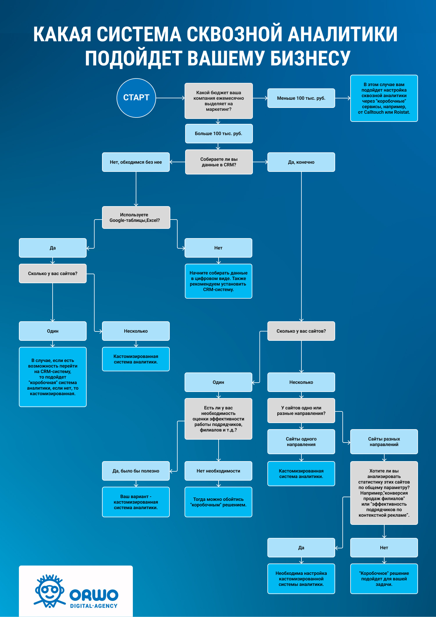 Если вы хотите понять, какой тип системы сквозной аналитики подойдет вашему бизнесу, пройдите наш тест. Начните с вопроса после кружочка «Старт» и двигайтесь по веткам, отвечая на вопросы.
