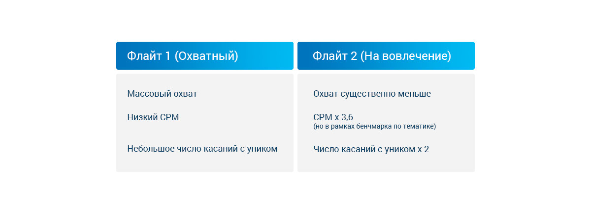 К первой задаче мы приступили с подбора наиболее оптимальных аудиторных настроек для каждого флайта (флайт — конкретные рекламные активности в ограниченный промежуток времени).