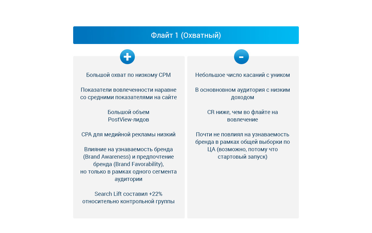 Охватный флайт запустили на аудиторию с широкими интересами. С помощью доступных в Яндекс.Директ категорий, обрисовали профиль пользователя, который интересуется финансами, инвестициями и ищет юридические услуги для бизнеса. Флайт с работой на вовлечение запустили на более узкую и более заинтересованную аудиторию. Для этого сформировали сегмент Look-a-Like — аудиторию, похожую на ту, которая регистрировалась на бирже. В рекламе мы задействовали баннеры и видеоролики, подготовленные командой клиента. Баннеры отражали УТП, которое на данный момент является наиболее актуальным для аудитории — комиссия 0% на наличные рубли. Видеоролики также акцентировали внимание на важных преимуществах биржи: В первом рекламном флайте, нацеленном на охват, мы намеренно задали небольшую частоту показа уникальному пользователю по сравнению со вторым флайтом. Важно было получить массовый охват — проинформировать о бренде как можно больше целевой аудитории. Поэтому для тестирования на старте одного пакета креативов было достаточно. Во втором флайте, нацеленном на вовлечение, было важно повысить число касаний с целевой аудиторией. Здесь мы столкнулись с проблемой: из-за повышения частоты показа возникал риск эффекта «переспама». Назойливая реклама могла дать обратный эффект — оттолкнуть аудиторию и создать негативное впечатление от бренда. Чтобы этого избежать, мы решили разнообразить креативы для баннеров. Это нужно было сделать оперативно, поэтому мы запустили аналогичные креативы, но в других цветовых гаммах. Это позволило быстро подготовить новый пакет креативов и создать дополнительные касания с аудиторией, не провоцируя раздражение. Баннеры отработали с высоким CTR (Click-Through Rate — показатель кликабельности, отношение числа кликов на баннер или рекламное объявление к числу показов), что говорит о заинтересованности аудитории. Далее у нас возник вопрос, как при разных стратегиях и при разных аудиториях корректно сравнивать результаты флайтов. Решили, что нужно делать сравнение по контрольным группам, то есть оценивать поведение пользователей, которые видели рекламу и которые ее не видели. Сравнение проводили по итогам каждого флайта. Делали мы это с помощью следующих сервисов: Благодаря проведенным оценкам мы смогли комплексно посмотреть на стартовый запуск и увидеть уже первые результаты. Это важный момент, т.к. медийная реклама обычно дает эффект не в моменте «здесь и сейчас», а в отложенной перспективе. На выходе получили ряд срезов по важным метрикам, которые уже сопоставляли от флайта к флайту. Ниже рассмотрим все показатели по порядку. В кейсе мы сравниваем результаты флайтов без упоминания конкретных цифр намеренно — клиент просил их не разглашать. По сути, чтобы уловить разницу в двух разных подходах, цифры и не нужны. Результаты по охвату Результаты по числу касаний с уникальными пользователями Аудитория, которая видела медийную рекламу, имеет высокие показатели вовлеченности. По результатам флайта 1 (охватный) отказы и глубина просмотра находятся примерно наравне со средними показателями на сайте. Флайт 2 (на вовлечение) показал долю отказов существенно ниже, а глубину просмотра выше в 2 раза, чем средние показатели по сайту. При этом новые посетители, привлеченные медийной рекламой, проводят на сайте меньше времени, че