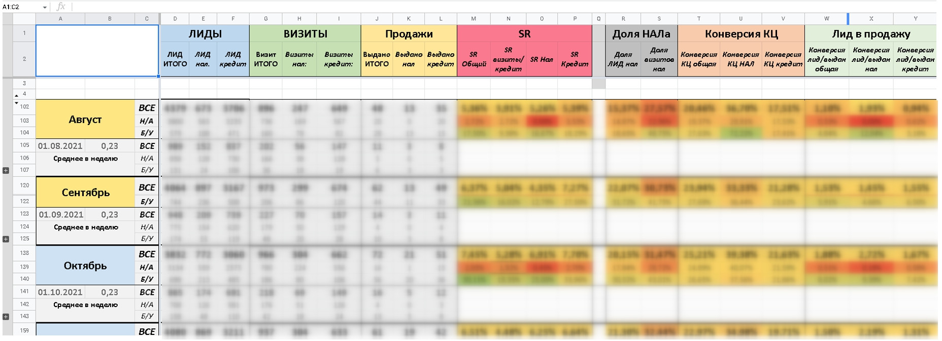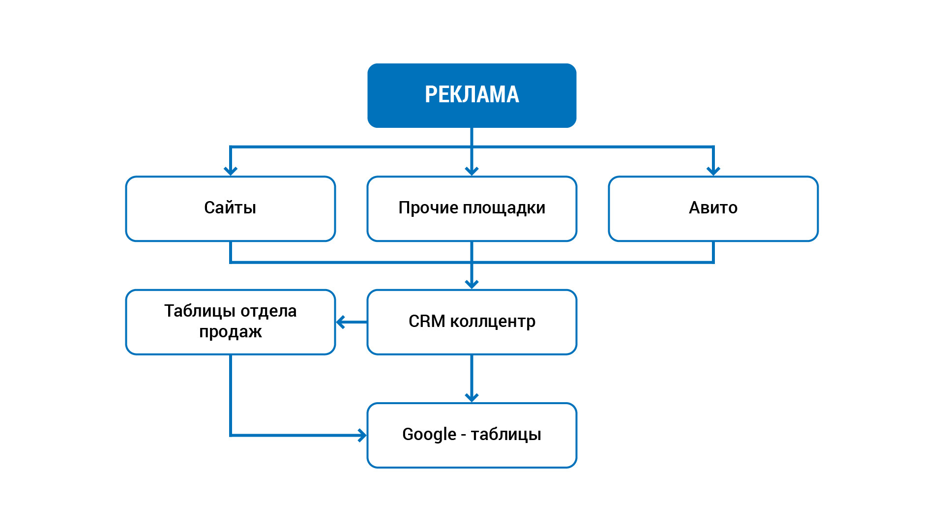 - Сбор данных занимает много времени, т.к. проводится вручную. На тот момент данные собирались в Google-таблицы штатным маркетологом. Он брал их из рекламных систем, телефонии Mango, внутренних отчетных таблиц и сам сводил их в общий отчет.