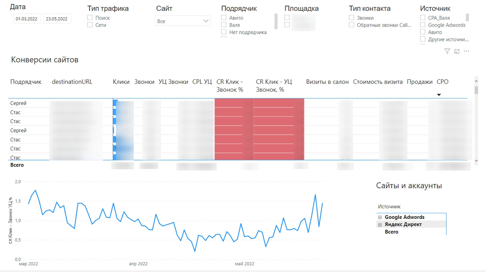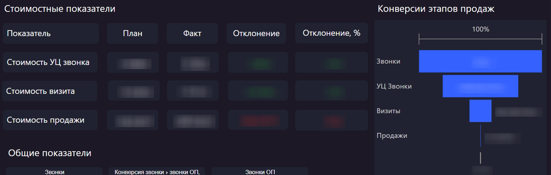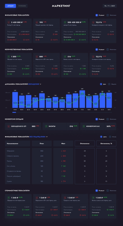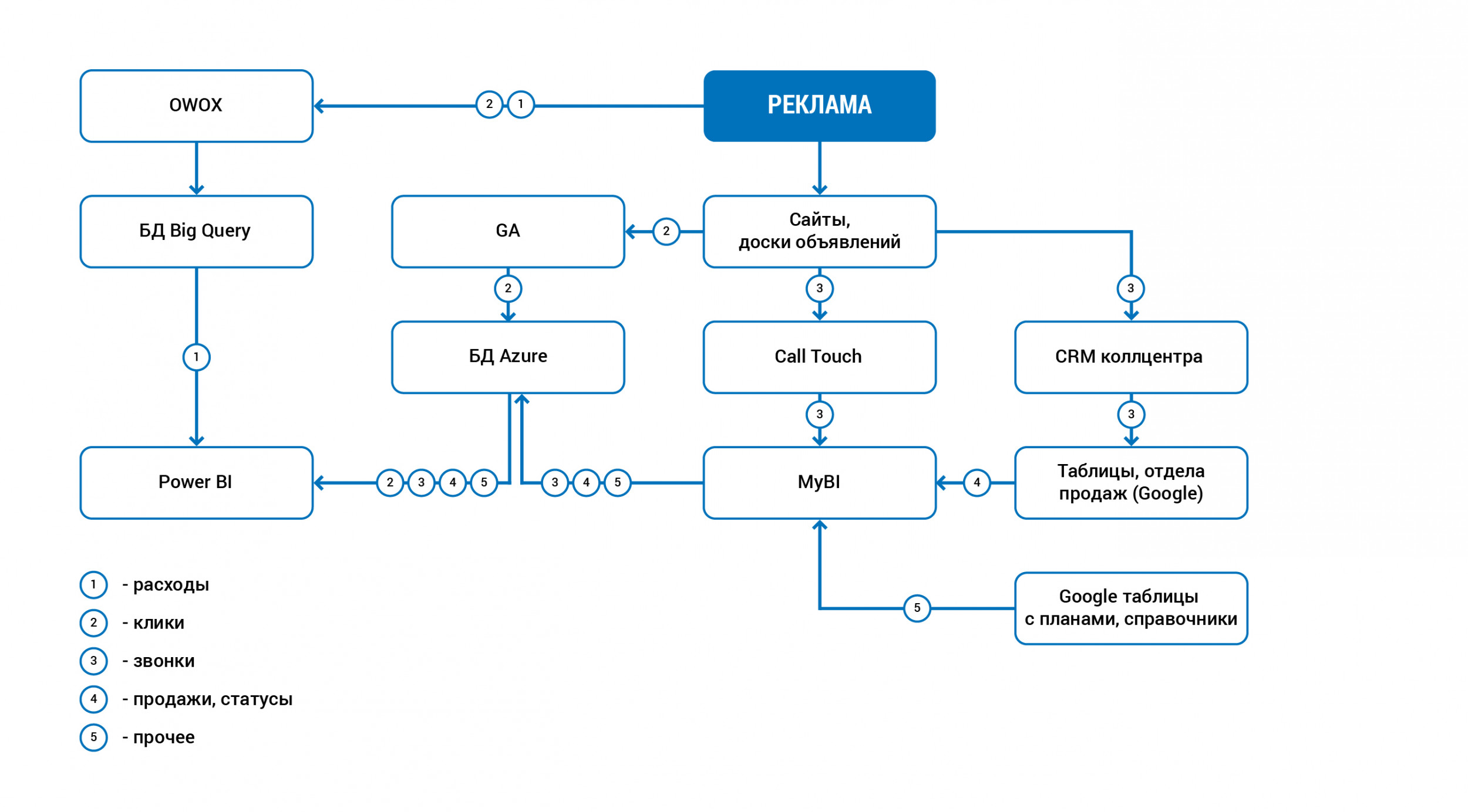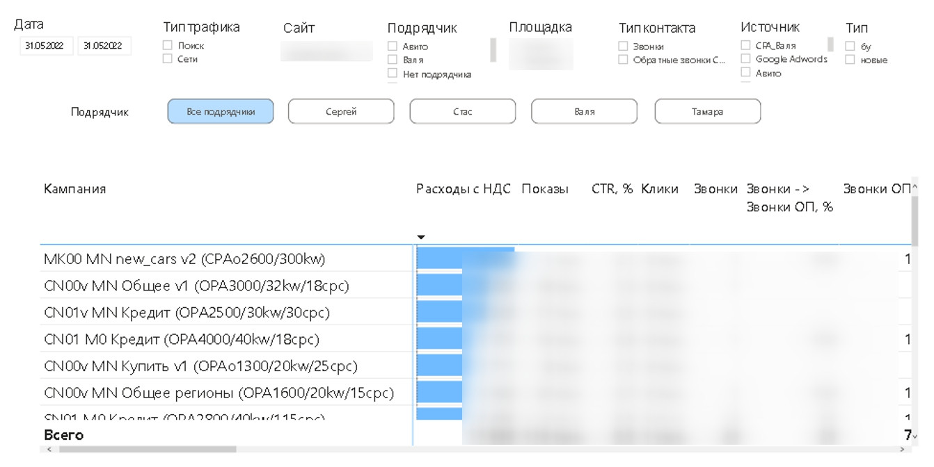 Calltouch используется для учета источников звонков, приходящих со всех видов рекламы и каналов продаж. В первоначальной системе отчетов заказчика не были отражены расходы, они попросту терялись. Бюджет тратился, а посчитать эффективность рекламы было невозможно. Поэтому и возникла идея внедрения сквозной аналитики. При постановке задачи мы должны были учесть пожелания всех заинтересованных сторон в компании. Собственникам и генеральному директору компании было важно в первую очередь понимать, какие рекламные каналы задействованы, какие суммы рекламного бюджета затрачены и какая конверсия на каждом этапе, т.е. получать данные, на основе которых можно будет принимать бизнес-решения. Директор дилерского центра хотел получать достаточно подробную информацию об эффективности источников рекламы и конверсии сайтов. Руководителю отдела маркетинга нужен был понятный инструмент для принятия оперативных решений и выстраивания диалога с отделом продаж и менеджментом компании на одном с ними языке. PPC-специалистам необходима была детальная информация по рекламным кампаниям: по какому запросу пришел лид и как он дошел/не дошел до продажи. До сотрудничества с нами в компании клиента не была выстроена система KPI для специалистов по платному трафику. А значит, они не понимали, какое влияние оказывают на продажи и оказывают ли его в принципе, что могло снижать их эффективность. Другими словами, PPC-специалисты могли гнать определенный объем трафика без учета его релевантности, при этом сливая клиентский бюджет. Они ориентировались на общий объем лидов, в надежде, что чем больше будет трафик, тем больше будет шансов на продажу. Поэтому клиенту важно было понять, какой из специалистов по настройке контекстной рекламы работает эффективнее с точки зрения лидов и продаж, и выстроить четкие KPI для специалистов. Совместными усилиями с командой клиента мы сформулировали такую задачу — разработать и внедрить систему сквозной аналитики и отчетности с целью систематизировать ряд процессов, связанных с планированием и учетом трафика, и выстроить систему мотивации для специалистов. Перед стартом проектирования клиенту были продемонстрированы варианты отчетов, собранные в Power BI, которые ранее использовались для клиентов из аналогичной отрасли. Однако, заказчика не совсем устраивал внешний вид стандартных визуальных компонентов (дашбордов и таблиц), которые есть в Power BI. По мнению клиента, они выглядят несколько топорно, а хотелось, чтобы система отчетов визуально соответствовала уровню современных маркетинговых аналитических систем. Также необходимо было, чтобы интерфейс и отчеты были созданы под определенные бизнес-процессы компании. Т.е. важно было сделать так, чтобы любой человек, даже который не умеет читать отчеты, мог чётко видеть нужные ему показатели. Например, на собрании с топ-менеджментом компании можно было бы показать такой отчет, и он был бы понятен всем участникам встречи. В процессе работы перечень инструментов немного изменился, но первоначально был таким: Microsoft Azure SQL Database: изначально для хранения расходов из Я.Директа и Google Ads (до его отключения), данных о звонках из Calltouch, данных из Google-таблиц. Сейчас используется только для хранения данных из Calltouch и Google-таблиц. Google Big Query: для хранения расходов из Я.Директа и Google Ads (до его откл