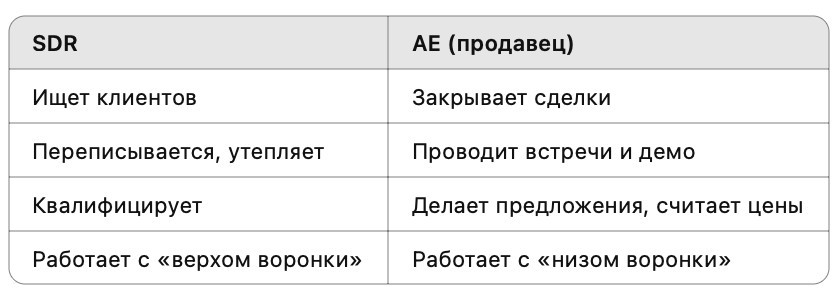 SDR задаёт вопросы, выясняет потребности, бюджет, сроки, принимает ли решение этот человек — и только после этого передаёт лида в продажи.
