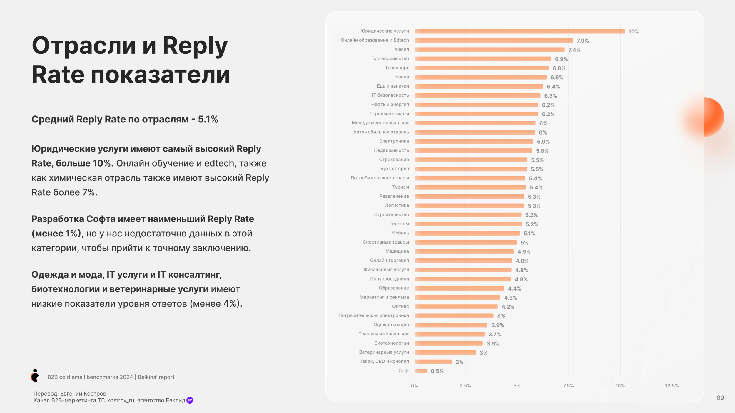 - Средний Reply Rate по всем отраслям: 5.1%.