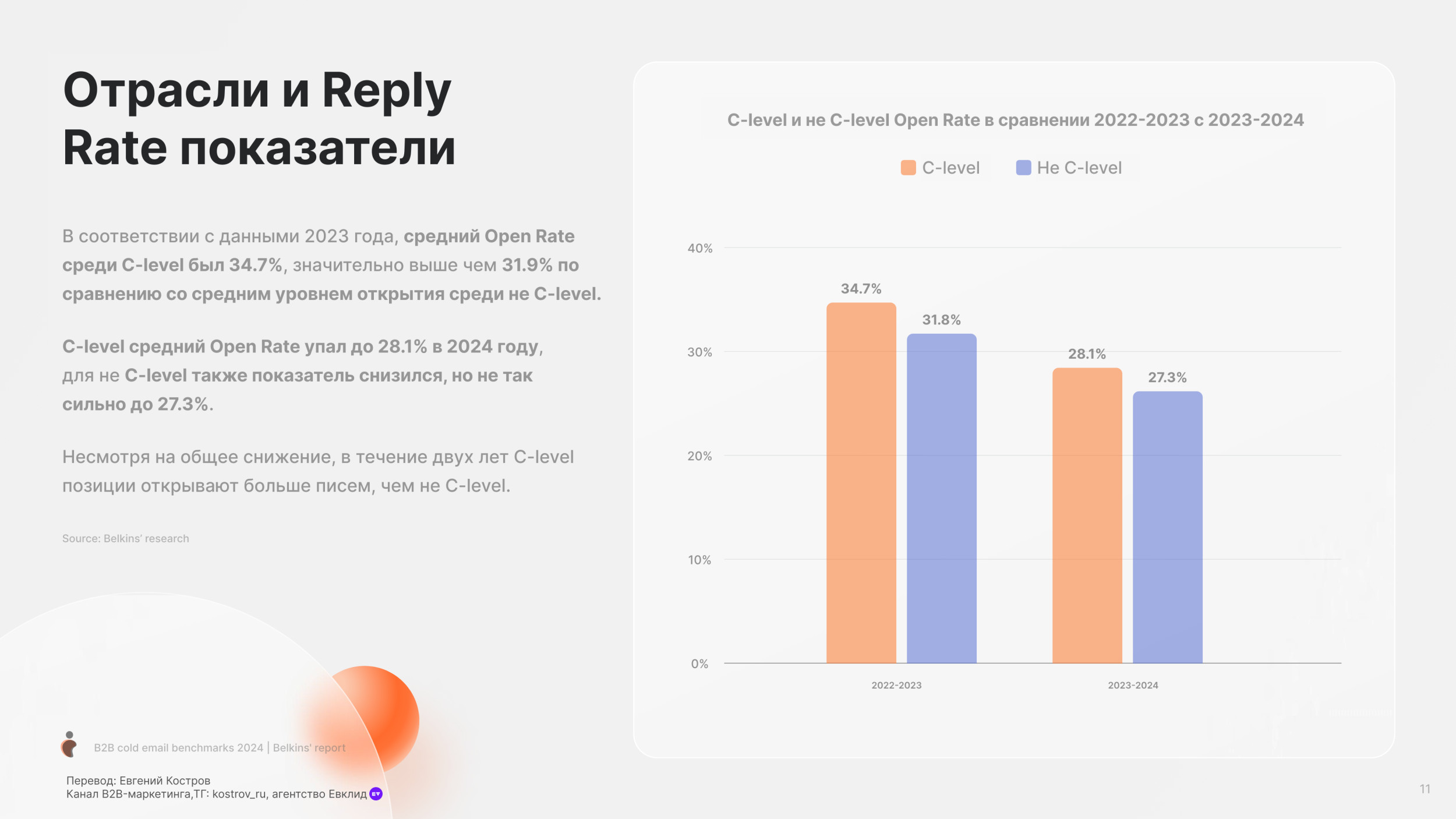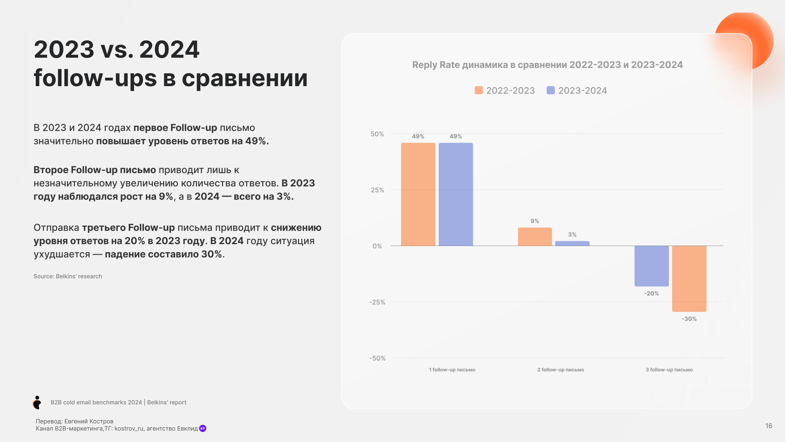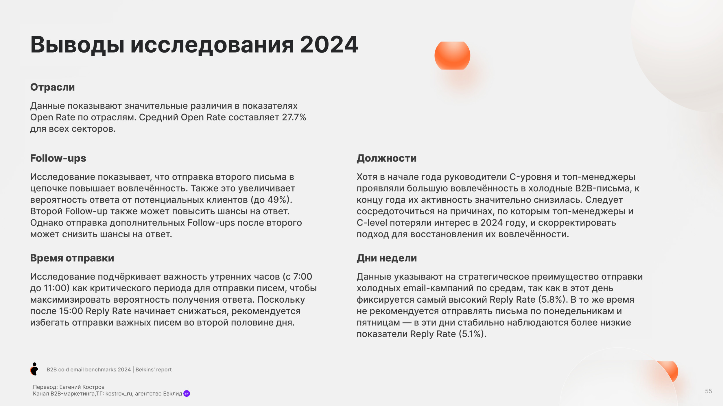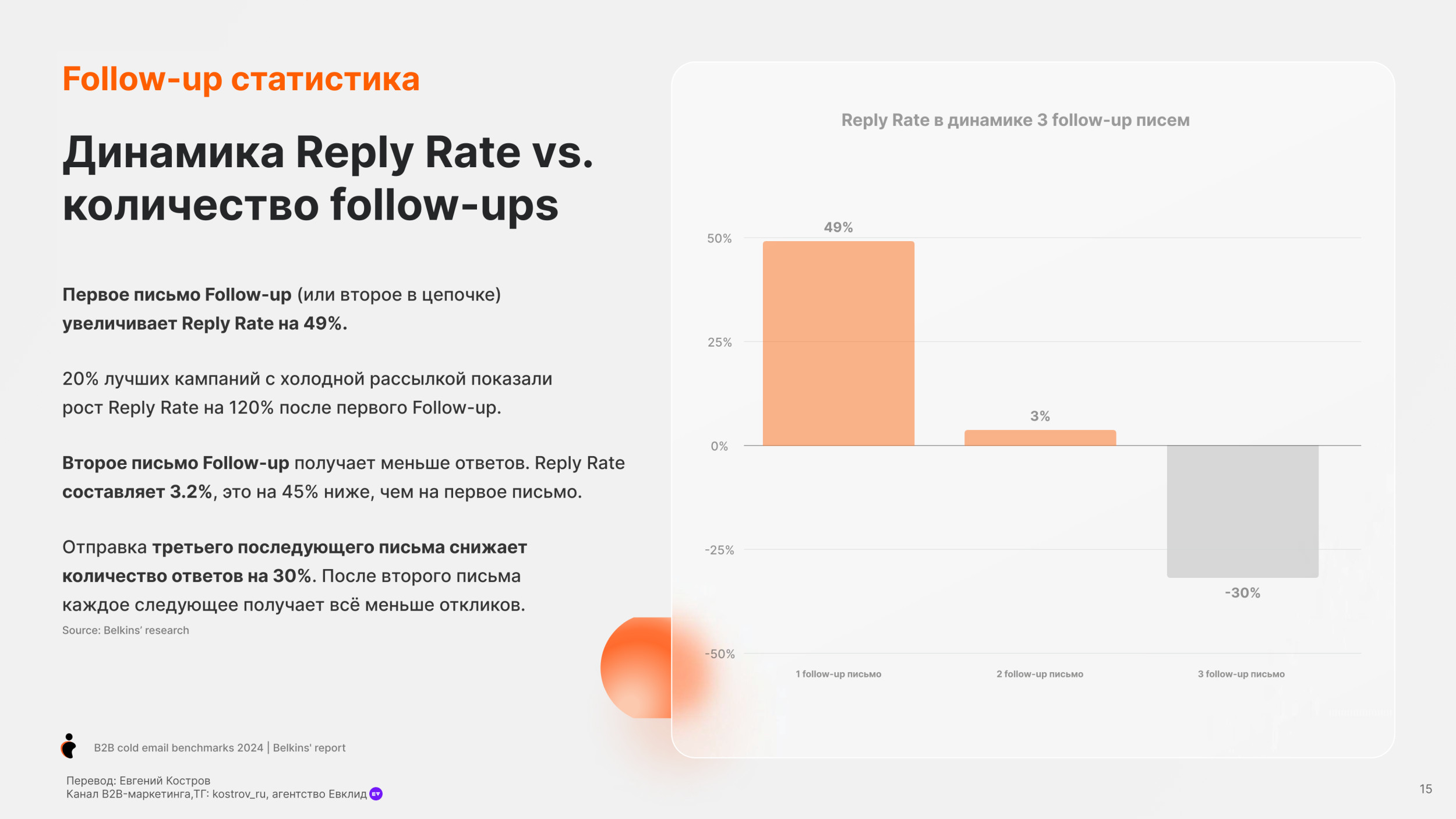 Потребительские товары (19.3%) и Банки (19.7%) имеют самый низкий показатель Open Rate. Средний Reply Rate по отраслям — 5.1% Юридические услуги имеют самый высокий Reply Rate, больше 10%. Онлайн обучение и edtech, также как химическая отрасль также имеют высокий Reply Rate более 7%. Разработка Софта имеет наименьший Reply Rate (менее 1%), но у нас недостаточно данных в этой категории, чтобы прийти к точному заключению. Одежда и мода, IT услуги и IT консалтинг, биотехнологии и ветеринарные услуги имеют низкие показатели уровня ответов (менее 4%). Средний Open Rate для C-level (руководитель высшего звена) — 28.1%, в сравнении с 27.3% не C-level персон. Основатели и финдиректора имеют самый высокий Open Rate (31.8%), далее Генеральные директора (31.2%). Для сравнения Технические директора имеют самый низкий Open Rate (24.5%). Мы также заметили, что только 17.8% специалистов HR открывают холодные письма — самый низкий Open Rate писем. В соответствии с данными 2023 года, средний Open Rate среди C-level был 34.7%, значительно выше чем 31.9% по сравнению со средним уровнем открытия среди не C-level. C-level средний Open Rate упал до 28.1% в 2024 году, для не C-level также показатель снизился, но не так сильно до 27.3%. Несмотря на общее снижение, в течение двух лет C-level позиции открывают больше писем, чем не C-level. В среднем холодные письма отправленные не C-level получают на 32% больше ответов чем письма отправленные C-suite (руководители высшего звена) — (5.6% против 4.2%). Письма к HR специалистам получают больше ответов (8.5%). Тем не менее Reply Rate самый высокий среди должностей. Письма отправленные к директорам по технологиям и директорам по продукту показывают самый низкий Reply Rate (2.1% и 1.3%). В 2023 C-level отвечали больше на холодные B2B письма в среднем Response Rate составил 6.2%. Этот Response Rate был значительно выше, у не C-level в среднем уровень ответов составил 5.2%. Тренд повторился в 2024. Средний Response Rate среди C-level составил 4.2%, в то время как у не C-level составил 5.6%. Мы рекомендуем вместо метрик Open Rate использовать email ROI. Затраты растут, ящики переполнены — все это обесценивает высокий Open Rate. Дополнительно, отслеживание аналитики пикселем снижает вашу репутацию, как отправителя. Вместо этого сфокусируйтесь на показателях Reply Rate. Михаил Максимов. Сооснователь и партнер-руководитель Belkins. Когда отправляете письма руководству, то лучше сфокусироваться на изменениях в отрасли в будущем, глобальных вызовах и их бизнес-стратегии. Когда пишем письма не руководителям, то лучше сфокусироваться на конкретных проблемах бизнеса и задачах, которые встречаются ежедневно. Сфокусируйтесь на аутриче менеджеров и управляющих директоров, если это возможно. Они с большей вероятностью ответят, чем высшее звено руководства. Отслеживайте тон общения и распространённые возражения в ответах всех потенциальных клиентов, чтобы улучшить будущие коммуникации. Первое письмо Follow-up (или второе в цепочке) увеличивает Reply Rate на 49%. 20% лучших кампаний с холодной рассылкой показали рост Reply Rate на 120% после первого Follow-up. Второе письмо Follow-up получает меньше ответов. Reply Rate составляет 3.2%, это на 45% ниже, чем на первое письмо. Отправка третьего последующего письма снижает количество ответов на 30%. После второго письма каждое следующее получает всё меньше откликов. В 2023 и 2024 годах первое Follow-up письмо значительно повышает уровень ответов на 49%. Второе Follow-up письмо приводит лишь к незначительному увеличению количества ответов. В 2023 году наблюд