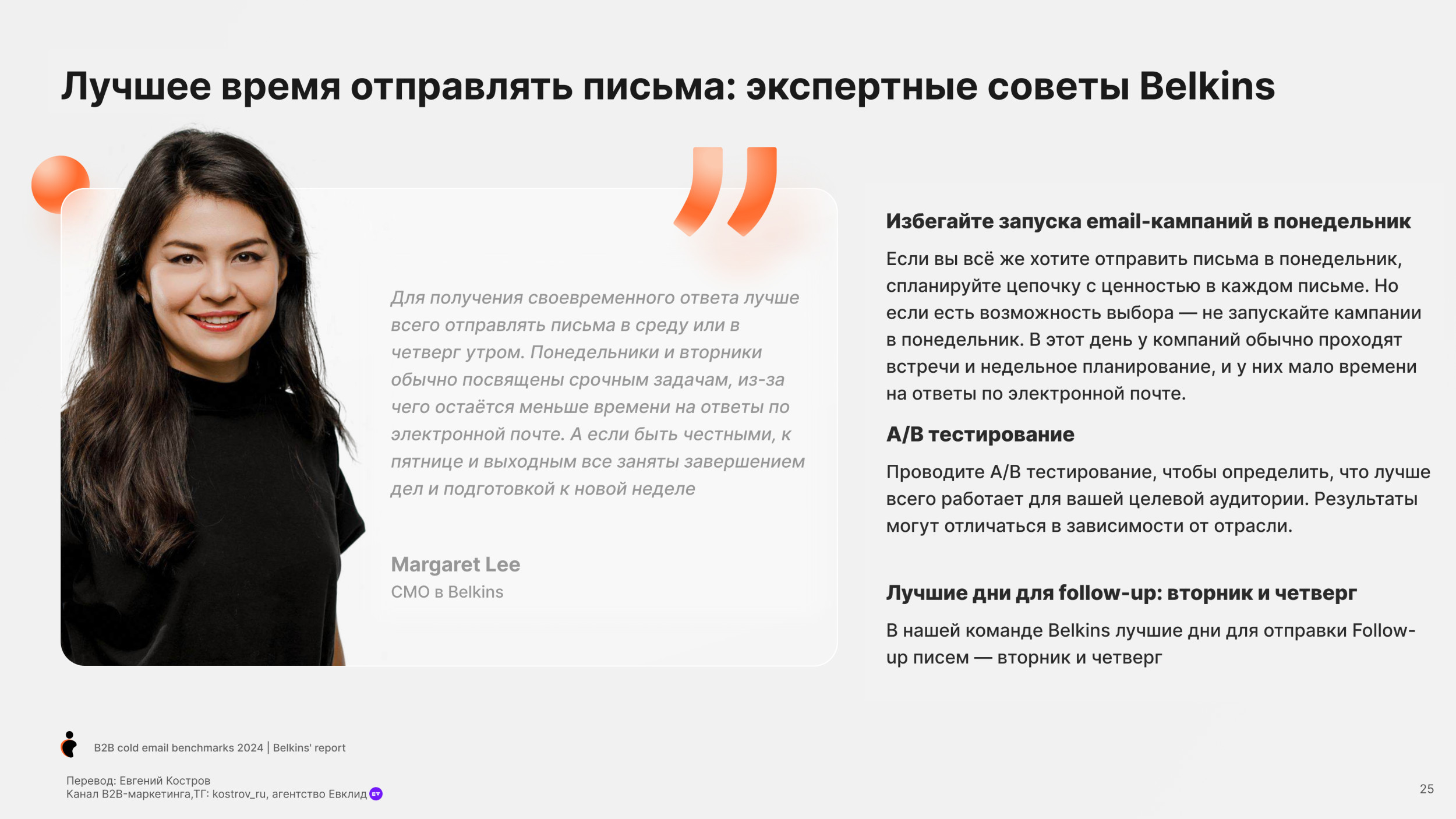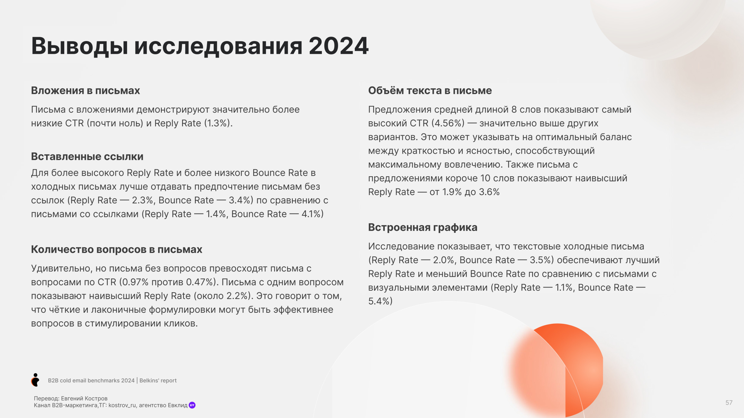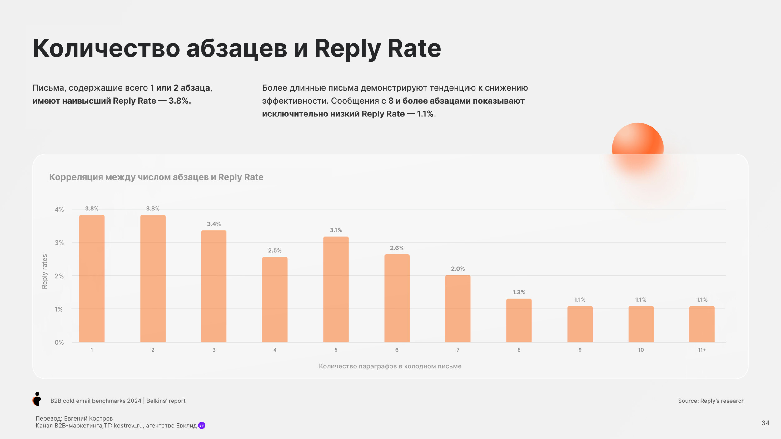 Потребительские товары (19.3%) и Банки (19.7%) имеют самый низкий показатель Open Rate. Средний Reply Rate по отраслям — 5.1% Юридические услуги имеют самый высокий Reply Rate, больше 10%. Онлайн обучение и edtech, также как химическая отрасль также имеют высокий Reply Rate более 7%. Разработка Софта имеет наименьший Reply Rate (менее 1%), но у нас недостаточно данных в этой категории, чтобы прийти к точному заключению. Одежда и мода, IT услуги и IT консалтинг, биотехнологии и ветеринарные услуги имеют низкие показатели уровня ответов (менее 4%). Средний Open Rate для C-level (руководитель высшего звена) — 28.1%, в сравнении с 27.3% не C-level персон. Основатели и финдиректора имеют самый высокий Open Rate (31.8%), далее Генеральные директора (31.2%). Для сравнения Технические директора имеют самый низкий Open Rate (24.5%). Мы также заметили, что только 17.8% специалистов HR открывают холодные письма — самый низкий Open Rate писем. В соответствии с данными 2023 года, средний Open Rate среди C-level был 34.7%, значительно выше чем 31.9% по сравнению со средним уровнем открытия среди не C-level. C-level средний Open Rate упал до 28.1% в 2024 году, для не C-level также показатель снизился, но не так сильно до 27.3%. Несмотря на общее снижение, в течение двух лет C-level позиции открывают больше писем, чем не C-level. В среднем холодные письма отправленные не C-level получают на 32% больше ответов чем письма отправленные C-suite (руководители высшего звена) — (5.6% против 4.2%). Письма к HR специалистам получают больше ответов (8.5%). Тем не менее Reply Rate самый высокий среди должностей. Письма отправленные к директорам по технологиям и директорам по продукту показывают самый низкий Reply Rate (2.1% и 1.3%). В 2023 C-level отвечали больше на холодные B2B письма в среднем Response Rate составил 6.2%. Этот Response Rate был значительно выше, у не C-level в среднем уровень ответов составил 5.2%. Тренд повторился в 2024. Средний Response Rate среди C-level составил 4.2%, в то время как у не C-level составил 5.6%. Мы рекомендуем вместо метрик Open Rate использовать email ROI. Затраты растут, ящики переполнены — все это обесценивает высокий Open Rate. Дополнительно, отслеживание аналитики пикселем снижает вашу репутацию, как отправителя. Вместо этого сфокусируйтесь на показателях Reply Rate. Михаил Максимов. Сооснователь и партнер-руководитель Belkins. Когда отправляете письма руководству, то лучше сфокусироваться на изменениях в отрасли в будущем, глобальных вызовах и их бизнес-стратегии. Когда пишем письма не руководителям, то лучше сфокусироваться на конкретных проблемах бизнеса и задачах, которые встречаются ежедневно. Сфокусируйтесь на аутриче менеджеров и управляющих директоров, если это возможно. Они с большей вероятностью ответят, чем высшее звено руководства. Отслеживайте тон общения и распространённые возражения в ответах всех потенциальных клиентов, чтобы улучшить будущие коммуникации. Первое письмо Follow-up (или второе в цепочке) увеличивает Reply Rate на 49%. 20% лучших кампаний с холодной рассылкой показали рост Reply Rate на 120% после первого Follow-up. Второе письмо Follow-up получает меньше ответов. Reply Rate составляет 3.2%, это на 45% ниже, чем на первое письмо. Отправка третьего последующего письма снижает количество ответов на 30%. После второго письма каждое следующее получает всё меньше откликов. В 2023 и 2024 годах первое Follow-up письмо значительно повышает уровень ответов на 49%. Второе Follow-up письмо приводит лишь к незначительному увеличению количества ответов. В 2023 году наблюд