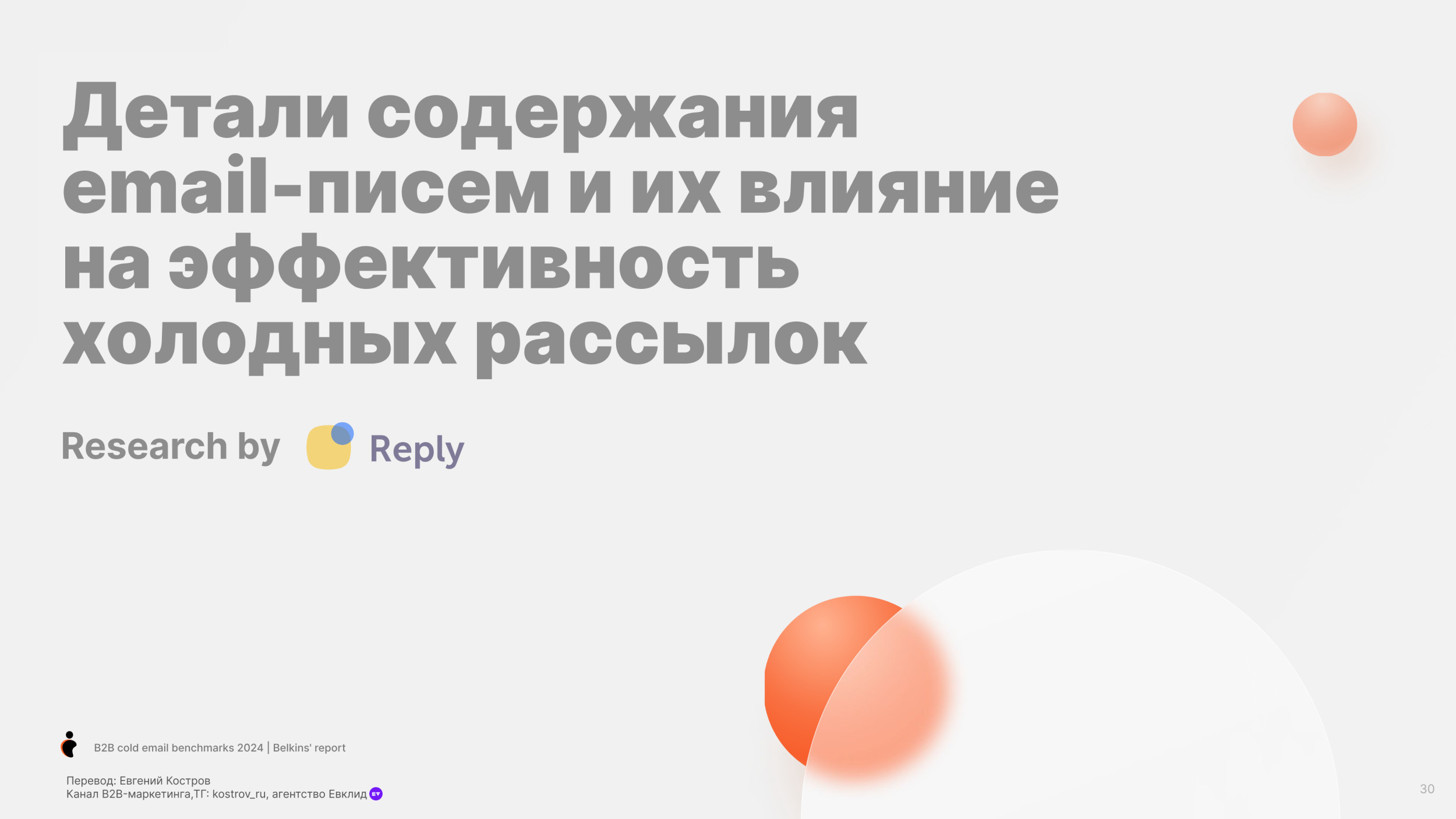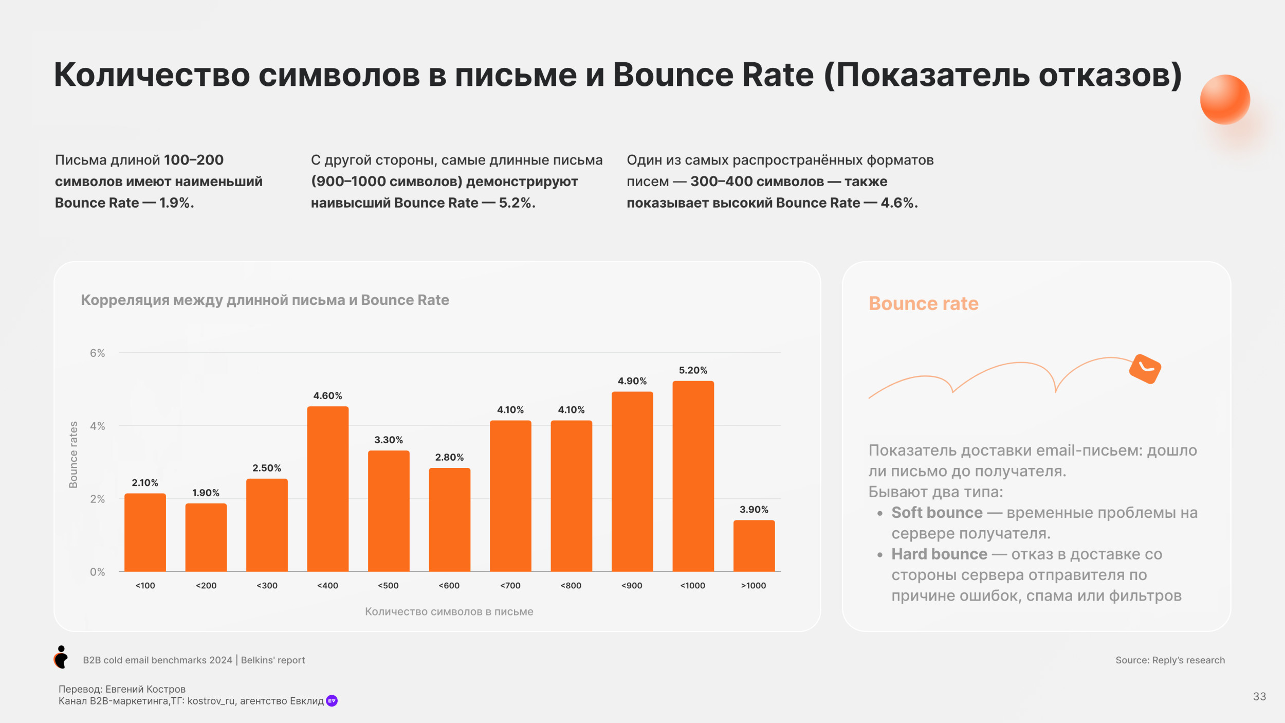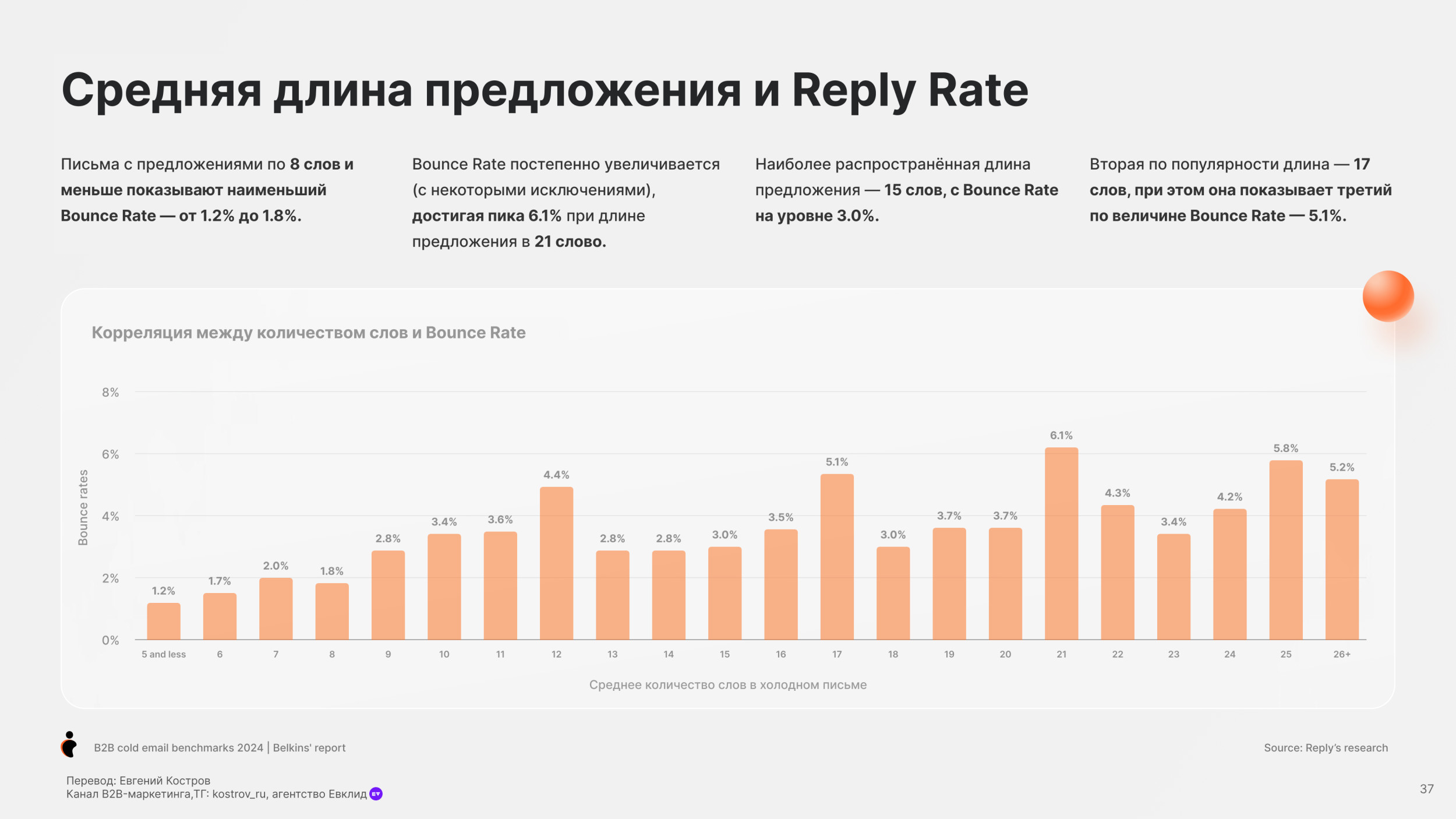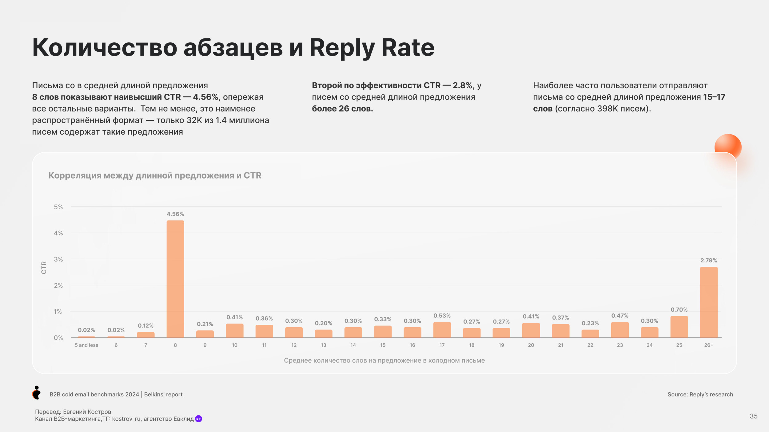 Потребительские товары (19.3%) и Банки (19.7%) имеют самый низкий показатель Open Rate. Средний Reply Rate по отраслям — 5.1% Юридические услуги имеют самый высокий Reply Rate, больше 10%. Онлайн обучение и edtech, также как химическая отрасль также имеют высокий Reply Rate более 7%. Разработка Софта имеет наименьший Reply Rate (менее 1%), но у нас недостаточно данных в этой категории, чтобы прийти к точному заключению. Одежда и мода, IT услуги и IT консалтинг, биотехнологии и ветеринарные услуги имеют низкие показатели уровня ответов (менее 4%). Средний Open Rate для C-level (руководитель высшего звена) — 28.1%, в сравнении с 27.3% не C-level персон. Основатели и финдиректора имеют самый высокий Open Rate (31.8%), далее Генеральные директора (31.2%). Для сравнения Технические директора имеют самый низкий Open Rate (24.5%). Мы также заметили, что только 17.8% специалистов HR открывают холодные письма — самый низкий Open Rate писем. В соответствии с данными 2023 года, средний Open Rate среди C-level был 34.7%, значительно выше чем 31.9% по сравнению со средним уровнем открытия среди не C-level. C-level средний Open Rate упал до 28.1% в 2024 году, для не C-level также показатель снизился, но не так сильно до 27.3%. Несмотря на общее снижение, в течение двух лет C-level позиции открывают больше писем, чем не C-level. В среднем холодные письма отправленные не C-level получают на 32% больше ответов чем письма отправленные C-suite (руководители высшего звена) — (5.6% против 4.2%). Письма к HR специалистам получают больше ответов (8.5%). Тем не менее Reply Rate самый высокий среди должностей. Письма отправленные к директорам по технологиям и директорам по продукту показывают самый низкий Reply Rate (2.1% и 1.3%). В 2023 C-level отвечали больше на холодные B2B письма в среднем Response Rate составил 6.2%. Этот Response Rate был значительно выше, у не C-level в среднем уровень ответов составил 5.2%. Тренд повторился в 2024. Средний Response Rate среди C-level составил 4.2%, в то время как у не C-level составил 5.6%. Мы рекомендуем вместо метрик Open Rate использовать email ROI. Затраты растут, ящики переполнены — все это обесценивает высокий Open Rate. Дополнительно, отслеживание аналитики пикселем снижает вашу репутацию, как отправителя. Вместо этого сфокусируйтесь на показателях Reply Rate. Михаил Максимов. Сооснователь и партнер-руководитель Belkins. Когда отправляете письма руководству, то лучше сфокусироваться на изменениях в отрасли в будущем, глобальных вызовах и их бизнес-стратегии. Когда пишем письма не руководителям, то лучше сфокусироваться на конкретных проблемах бизнеса и задачах, которые встречаются ежедневно. Сфокусируйтесь на аутриче менеджеров и управляющих директоров, если это возможно. Они с большей вероятностью ответят, чем высшее звено руководства. Отслеживайте тон общения и распространённые возражения в ответах всех потенциальных клиентов, чтобы улучшить будущие коммуникации. Первое письмо Follow-up (или второе в цепочке) увеличивает Reply Rate на 49%. 20% лучших кампаний с холодной рассылкой показали рост Reply Rate на 120% после первого Follow-up. Второе письмо Follow-up получает меньше ответов. Reply Rate составляет 3.2%, это на 45% ниже, чем на первое письмо. Отправка третьего последующего письма снижает количество ответов на 30%. После второго письма каждое следующее получает всё меньше откликов. В 2023 и 2024 годах первое Follow-up письмо значительно повышает уровень ответов на 49%. Второе Follow-up письмо приводит лишь к незначительному увеличению количества ответов. В 2023 году наблюд