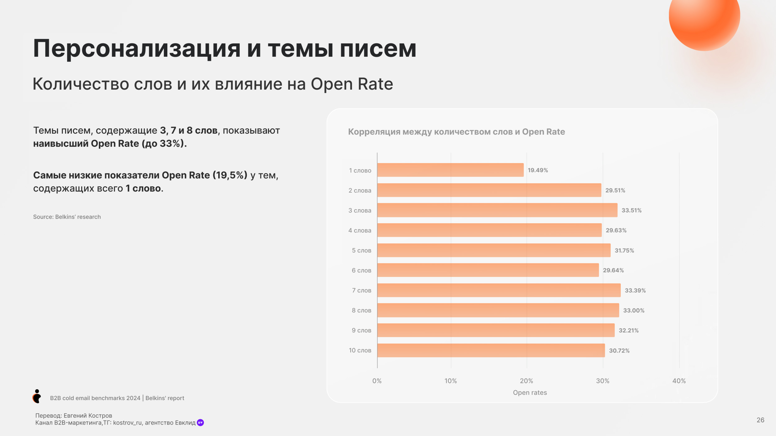 - 1 слово в теме письма — Самый низкий Open Rate (19.5%)