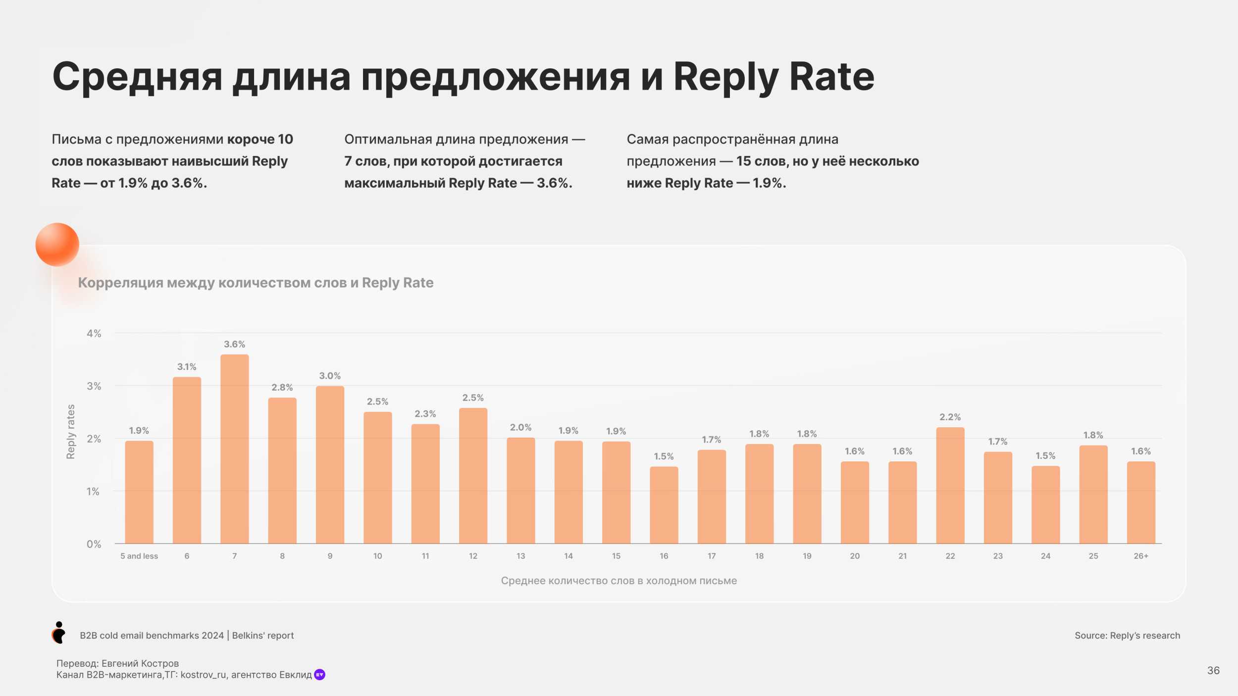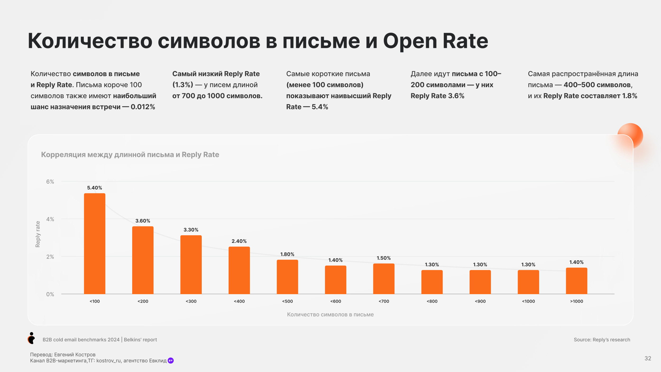 - Письма меньше 100 знаков — Самый высокий Reply Rate (5.4%)