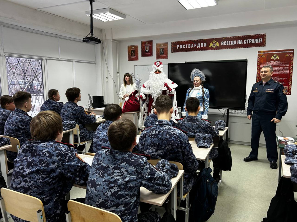 Сотрудники Росгвардии пожелали кадетам с пользой провести новогодние каникулы, набраться сил перед новой учебной четвертью и, конечно же, вручили каждому сладкие подарки.