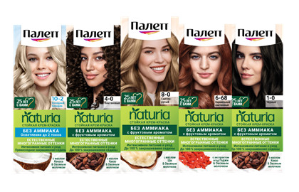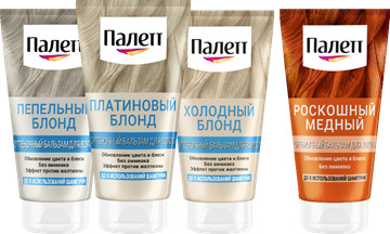 Для тех, кто предпочитает максимально бережное окрашивание, Палетт разработал мягкую крем-краску Палетт Naturia с щадящим составам без аммиака. Окрашивающий крем содержит натуральные ингредиенты, богатые полезными веществами — в зависимости от оттенка, это экстракт ягод годжи, масло кокоса, ши или какао. Ухаживающий кондиционер с овсяным молочком питает и увлажняет волосы изнутри, а мультитональные окрашивающие пигменты позволяют добиться естественных переливов цвета и до 100% закрашивания седины. Однако идеальный оттенок и блеск волос достигается не только стойким окрашиванием, но и поддержанием цвета между окрашиваниями. Для этого Палетт предлагает линейку оттеночных бальзамов без аммиака. Тонирующие средства блонд-оттенков обладают эффектом против желтизны, что позволяет добиться благородного холодного цвета. Бальзам медного оттенка добавляет дополнительные пигменты в структуру волоса, за счет чего придает более глубокий и насыщенный цвет, оставаясь на волосах до 8 применений шампуня. Также это идеальное средство для тех, кто не красит волосы, но хочет придать им более многогранный оттенок. Широкий